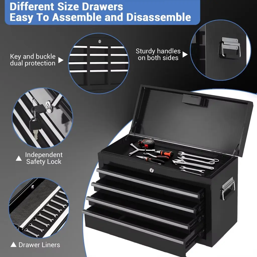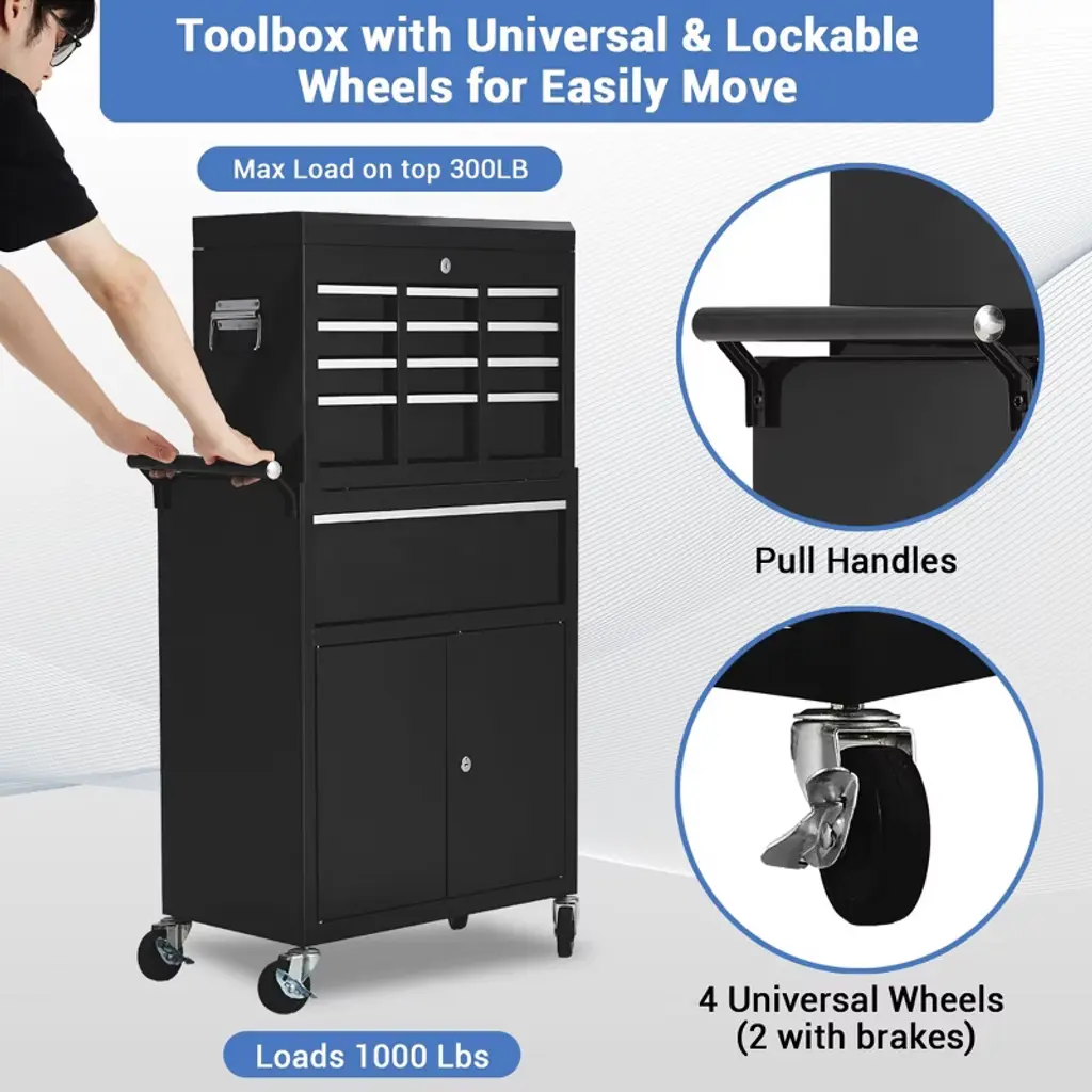 Tired of cluttered tools? This rolling tool chest offers a detachable top toolbox, lockable drawers, and rust-resistant design—ideal for garages, workshops, or home. Ready to keep everything organized and accessible? Highlights at a glance:Detachable top toolbox for independent or combined use.Five lockable drawers, a top tray, and a cabinet for secure, organized storage.Four swivel wheels with handles for easy mobility.Heavy-duty steel construction with powder coating for rust resistance.Clear instructions and labeled parts for quick, hassle-free assembly.Ideal for garages, workshops, or home use, offering versatile and durable storage.Combines functionality and portability for efficient tool organization.Specification:Size: 20.43x12.99x40.38 inchesColor: black / redMaterial: metalFriendly note:Before assembly, please take a moment to read the provided manual.When assembling the tool chest, make sure to securely tighten all screws and bolts.For safety and optimal use, always place the tool chest on a flat, level surface.To keep your tools secure, remember to lock the drawers and doors when the tool chest is not in use.Distribute the weight of your tools evenly across the drawers to prevent overloading them.Packing list:Tool chest x1Hardware bag x1Assembly guide x1