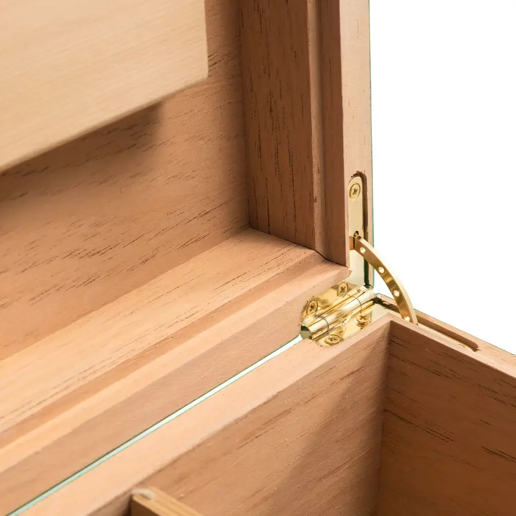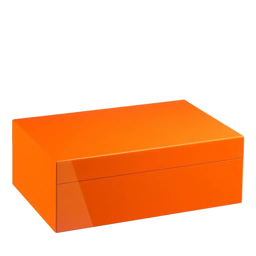 Part of a colorful and refined series of cigar boxes, this exquisite design piece is entirely crafted and painted by hand showcasing a minimalist yet elegant flair. Holding up to 50 cigars, its clean rectangular silhouette is fashioned of cedar finished with a shiny turquoise polyester lacquer, enriched with gold-finished metal details. This cigar box is equipped with a hygrometer and Boveda holder.