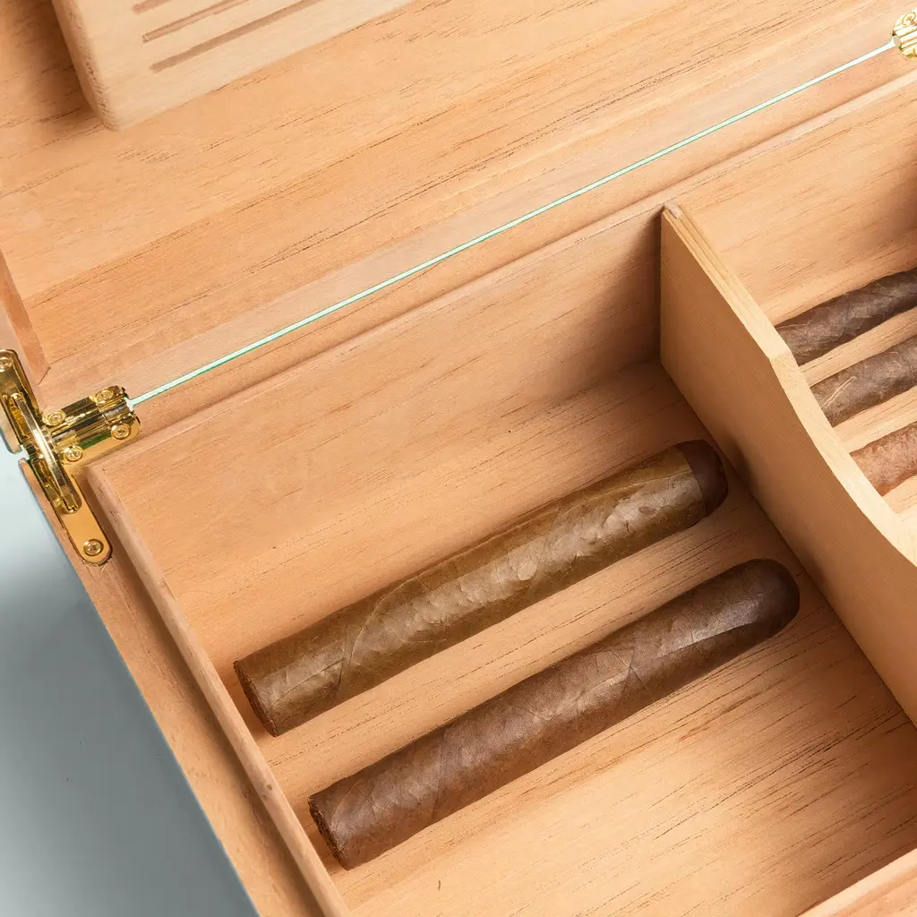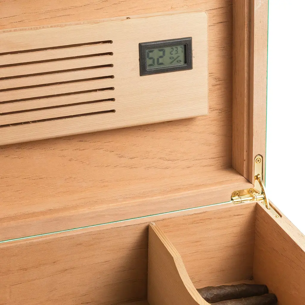 A fascinating combination of traditional techniques of craftsmanship and modern taste, this stunning cigar box will make a bold and lively statement in any interior. Handcrafted of cedarwood, it is painted with a polished yellow polyester lacquer, and enriched with gold-finished metal details. Storing up to 30 cigars, it features a hygrometer and Boveda holder for optimal humidification.