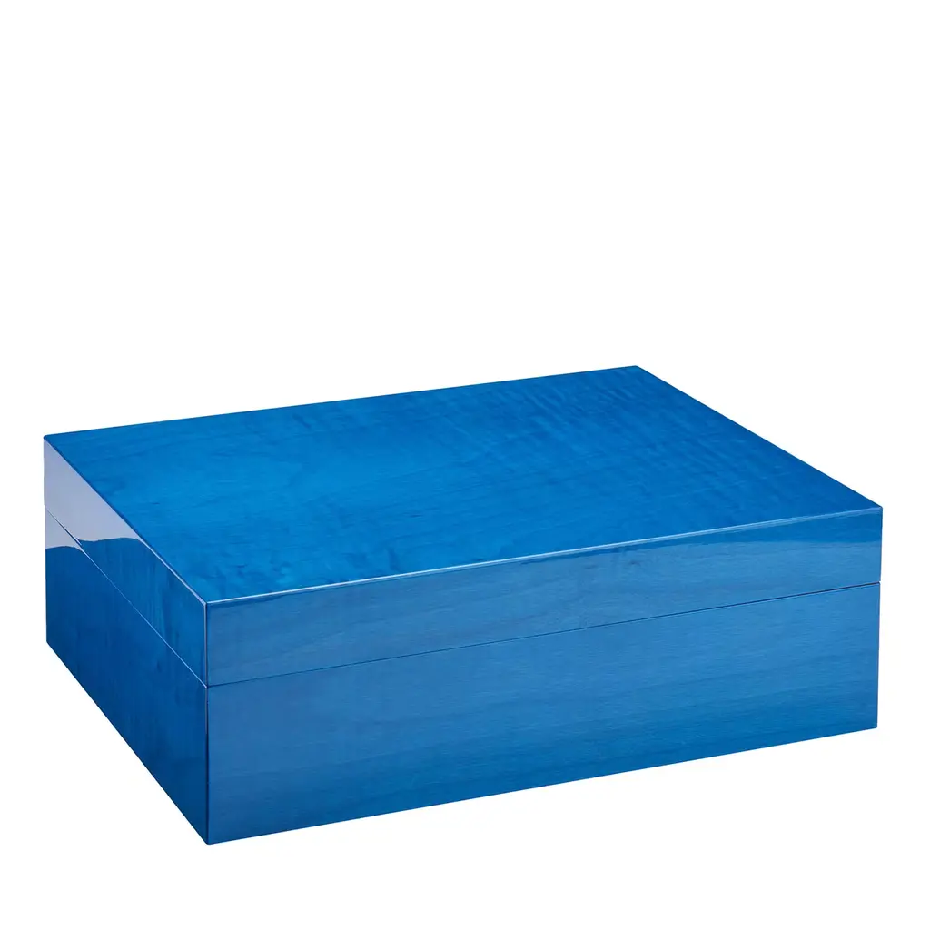 A harmonious blend of traditional craftsmanship and contemporary design, this cigar box exudes timeless sophistication. Handmade of cedar wood, enriched with golden galvanized metal details, it is painted in a yellow shade polished and brushed by hand with polyester for a luminous mirrored finish, enhancing its natural grains. Holding up to 20-30 cigars, it is comprised of a hygrometer and a humidifier holder. Available in other colors and sizes, please consult the Artemest catalog for options.