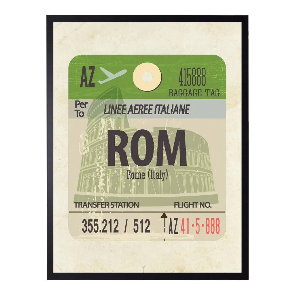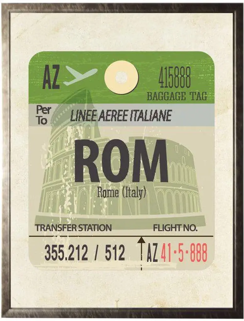 Presenting a Rome Travel Ticket on distressed background framed in a pewter shadowbox.