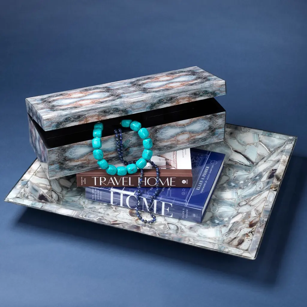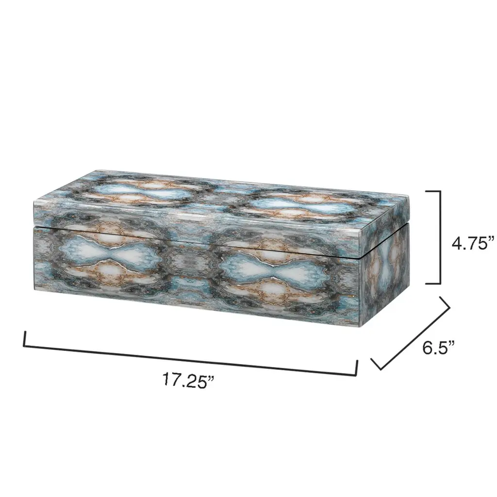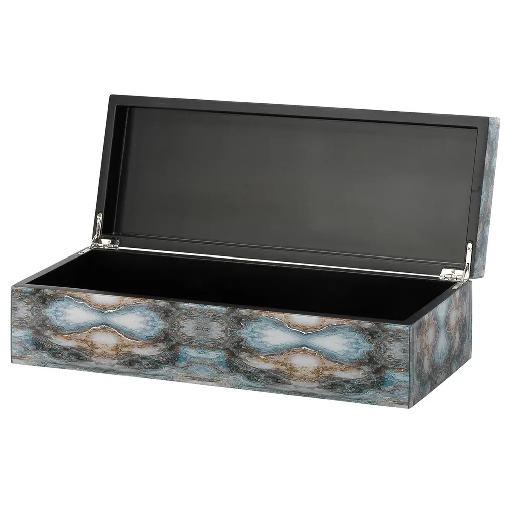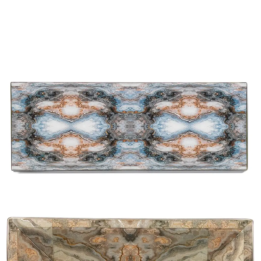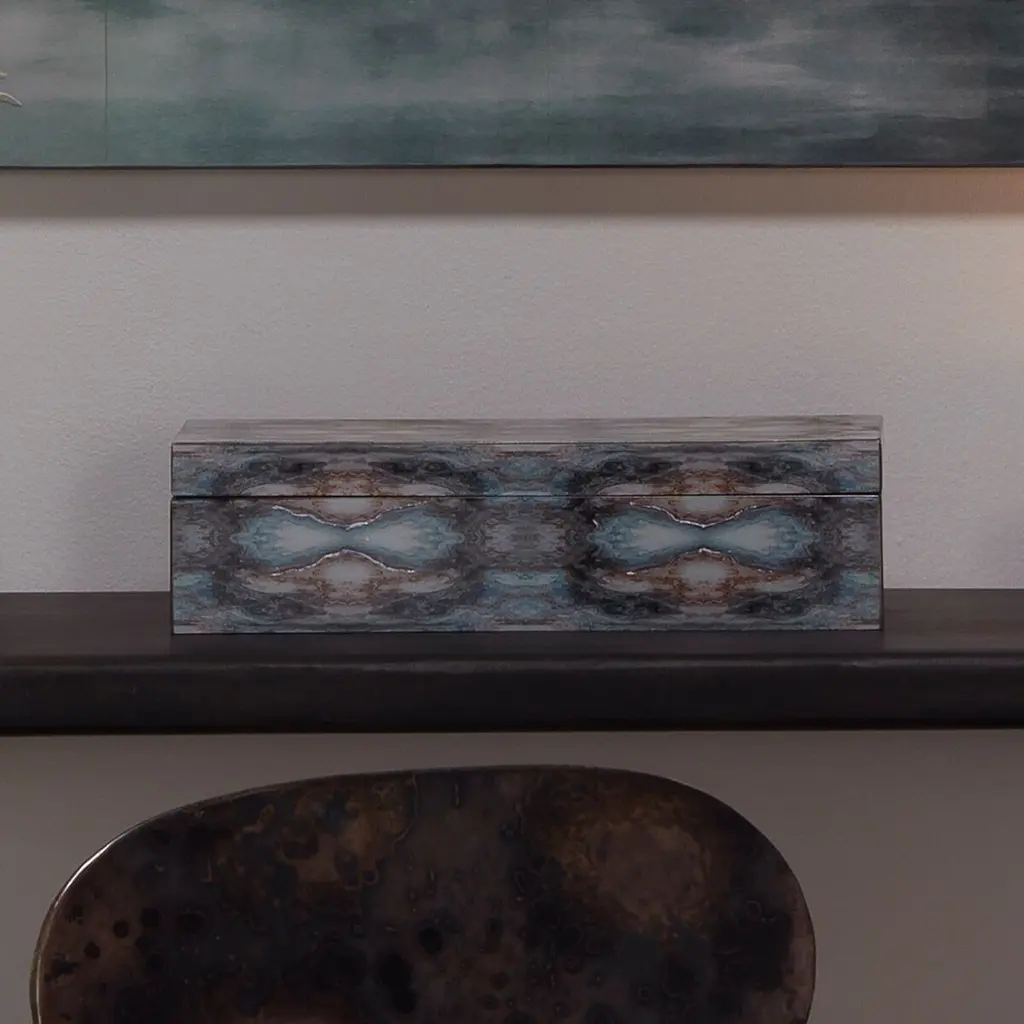 Inspired by Rorschach inkblot tests, which delve into emotion through interpretation, our Rorschach Long Box invites you to explore its bold design. Featuring striking tones of indigo, navy, and cream, accented with silver and gold leaf, this box showcases dynamic patterns created by overlaid photos beneath a clear lacquer finish. Ideal as a stylish catchall for small items like jewelry or sunglasses, it combines artistic intrigue with practical elegance.