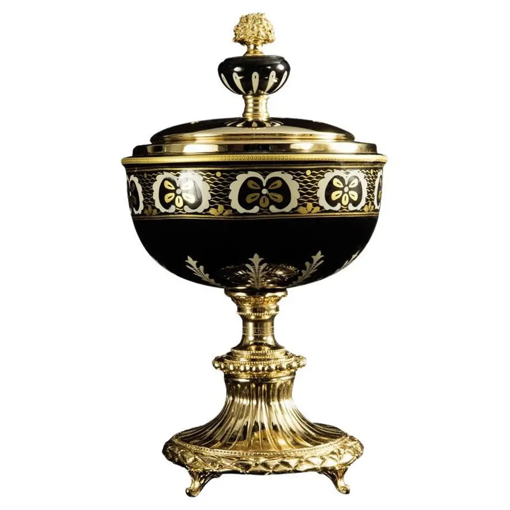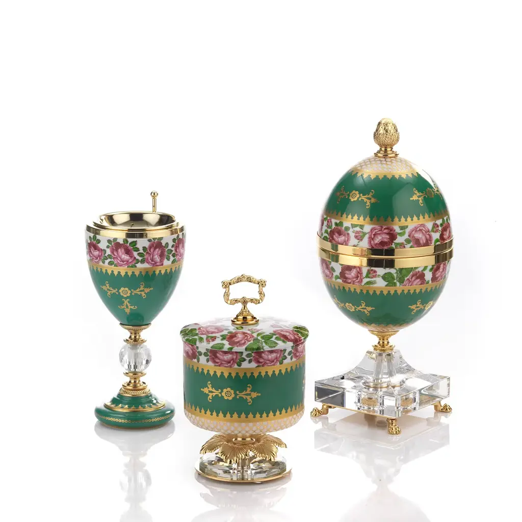 This box, with its classic shape and decoration, brings sophistication and timeless appeal to any decor. The fine porcelain of the piece is decorated in green and pink roses, with real gold details. It's assembled with gold-plated brass elements and a crystal base. Please ask the Concierge for customization options.