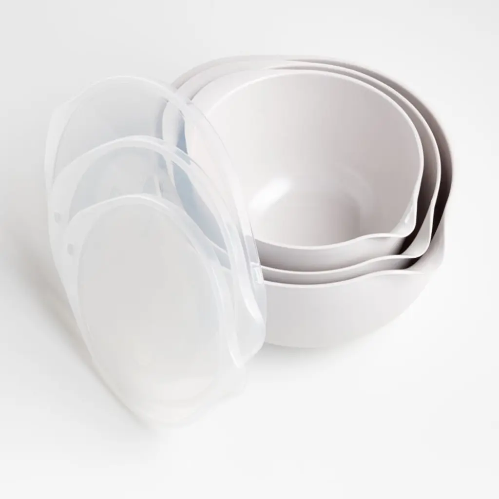 Bowls worthy of a queen. Named in honor of the queen of Denmark, the Margrethe bowls epitomize the beautiful form and function of mid-century Danish design. Pretty enough for serving, the creamy white bowls do triple duty as lidded storage containers and sturdy anti-slip mixing bowls with helpful handles and pouring spouts. Inspired by pebbles gently shaped by the elements, the three rounded bowls are subtly speckled on their matte exteriors and shiny interiors. Melamine bowls and plastic lids clean up easily in the dishwasher and nest compactly when not in use.