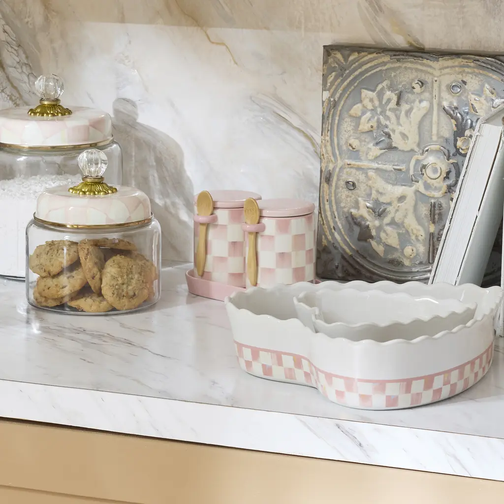 Store kitchen staples in the ceramic Rosy Check Farmhouse Canisters, sold as a set of two. They feature hand-applied Rosy Check transfer decoration and have a handy small wooden spoon attached, making it convenient to dole out a dash of flour, sugar, coffee, and whatever else you store inside!