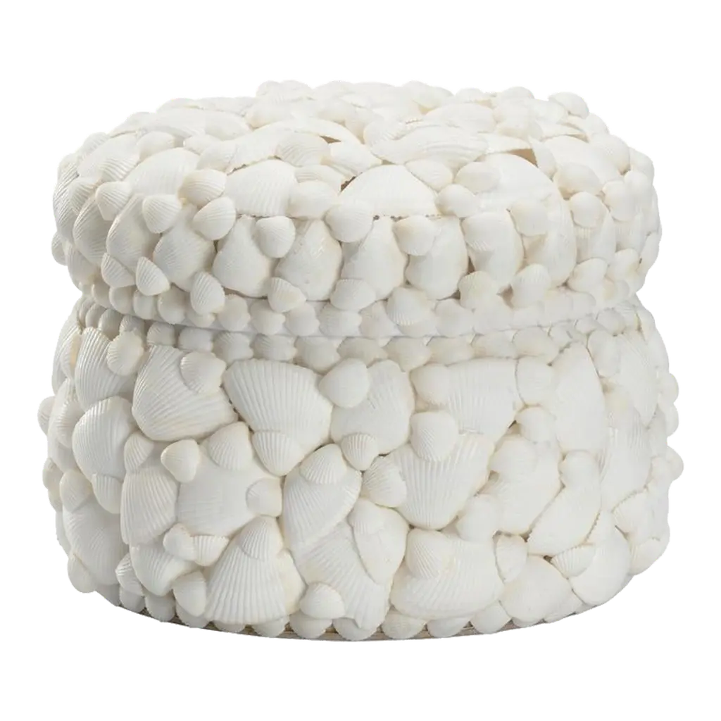 Treasure from the bottom of the sea, the Round White Shell Box is a fun addition to bookshelves that can hold all your treasures.