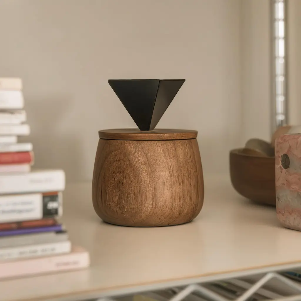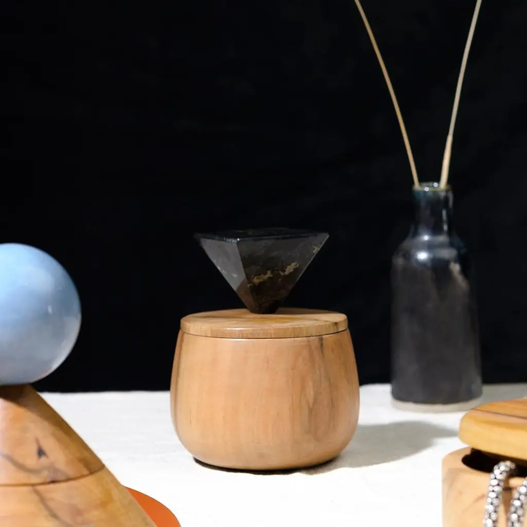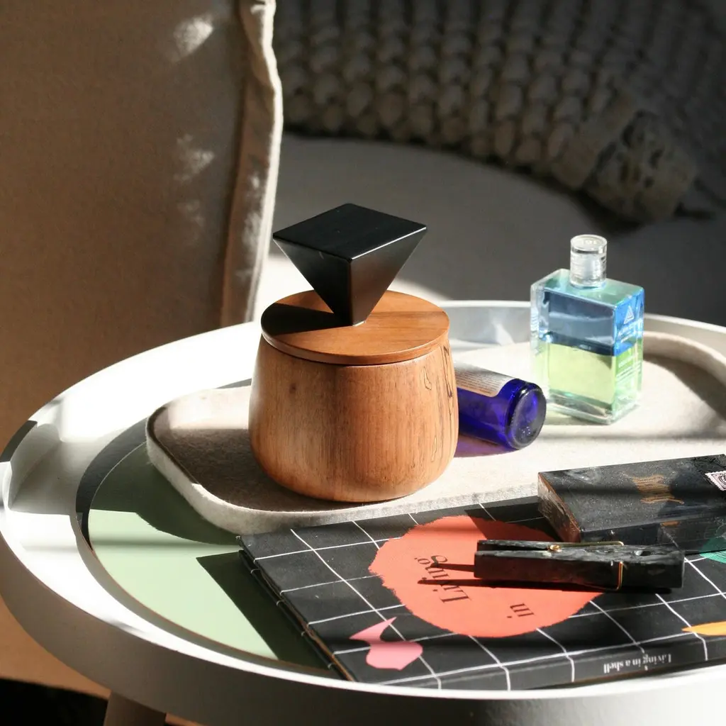 Keep your jewelry safe while traveling with this compact and durable black onyx jewel box.The round everything catchall box is a carved using traditional wood carpentry techniques in Magdalena de Cao, Perú. The pyramid-shaped gemstone handle is a geometric element that makes the moment of opening it up feel extra special.Dimension: 3.75 x 3.75 x 5 inWeight: 0.6 LbMaterial: Onyx, woodAbout this gemstone:• Solid Black Onyx in a large form is considered rare, formed of fine-grained quartz with origin from the Arequipan Andes of Perú - subtle veining means that no two stones are exactly alike.• This stone has a long history related to the root chakra, offering grounding energy, dispelling negative energy and offering a release and preserverance stone is said to stimulate the digestive and glandular system, mitigating pain and tension.• On a metaphysical level, this stone is believed to aleviate ailments with bones and skin, birth and circulation.Handmade in Peru by DAR Proyectos