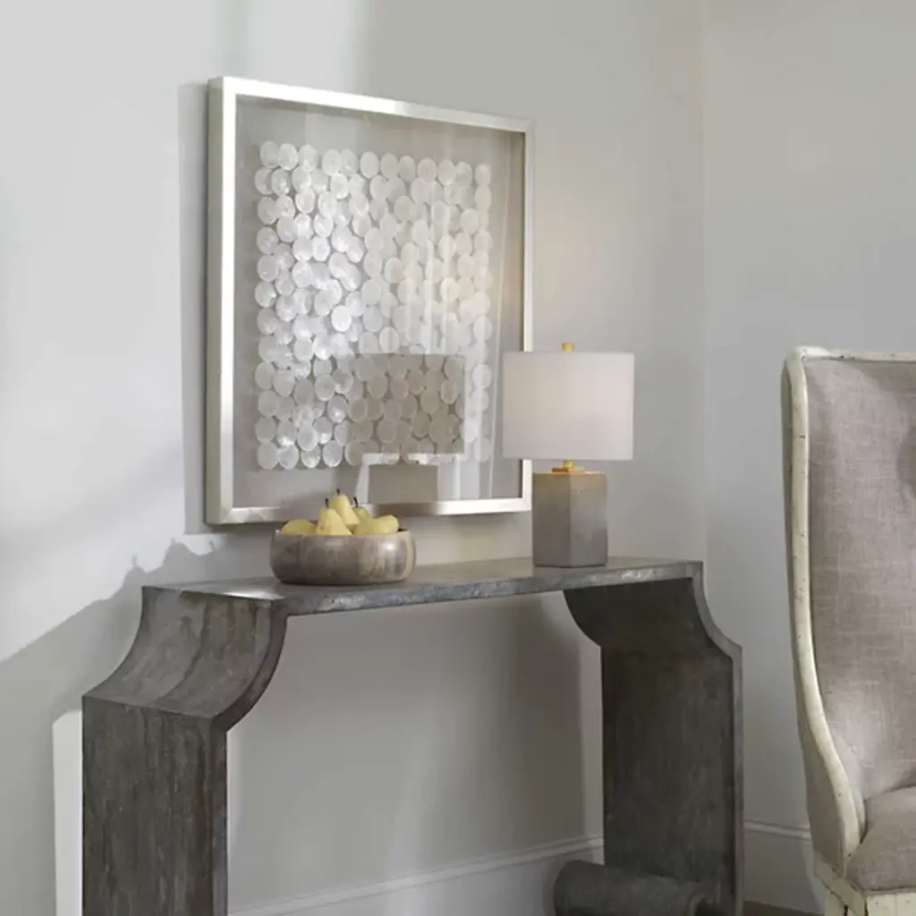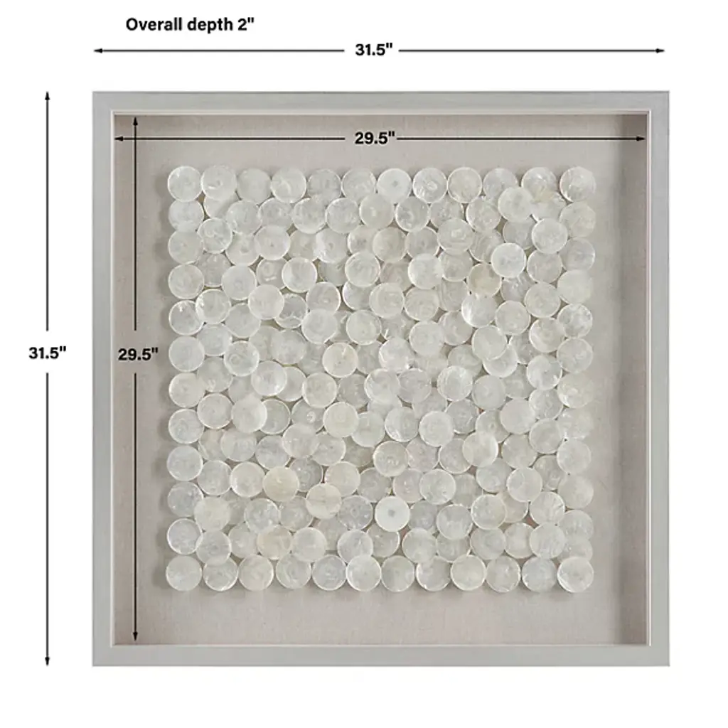 A sea of elegant shapes. The Roxas Capiz Shell Shadow Box from Uttermost livens up the room’s elegant aesthetic with luminous nautical materials. The piece sits flush against the wall as a clean geometric pine wood frame. Linen covers the inside of the box as a soft and seductive background. Organic capiz shells are circularly shaped and intricately arranged in a tight, shimmering composition. A touch of light is all it takes to set off the luminous, texture-rich accents.