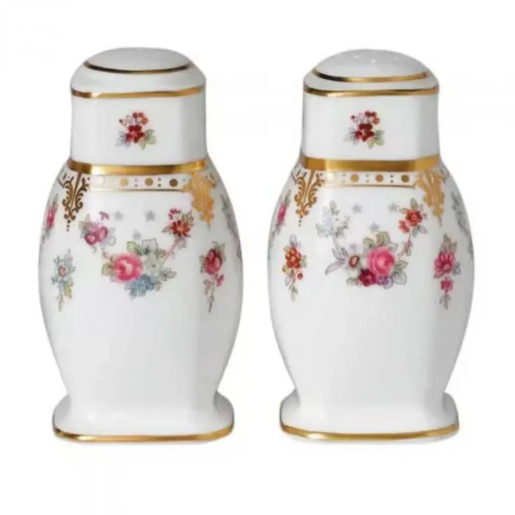 A beautiful cruet set, salt and pepper juxtaposed, is the perfect addition to your Royal Antoinette Dinner Service when entertaining. The Royal Crown Derby Porcelain Company manufactures the highest quality English fine bone china and collectibles at its headquarters in Derby, England (the English Pottery district). Although the present factory was established in 1878, the original factory was set up nearby in Nottingham Road in 1750. Queen Victoria granted permission to include the title "Royal" in the company name in 1890.