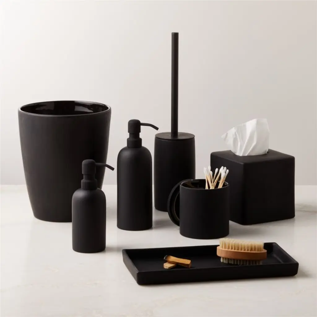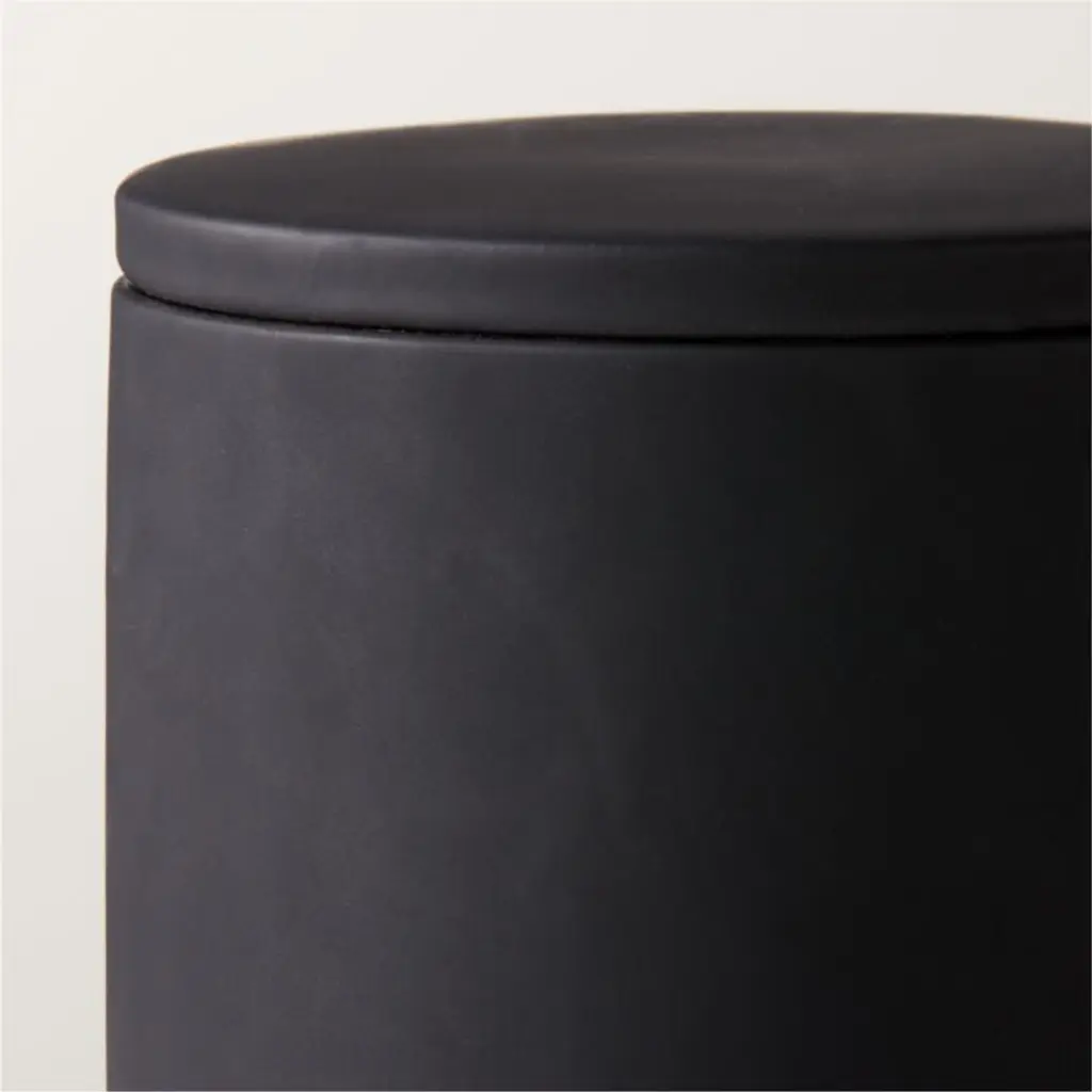 Tactile stoneware round adds a modern touch with a surprising surface of black rubber. Fitted with a neat lid, canister stows cotton swabs and hair pins in the bath, paper clips and push pins in the office. Go for a full sensory experience with all of our rubber coated black accessories.