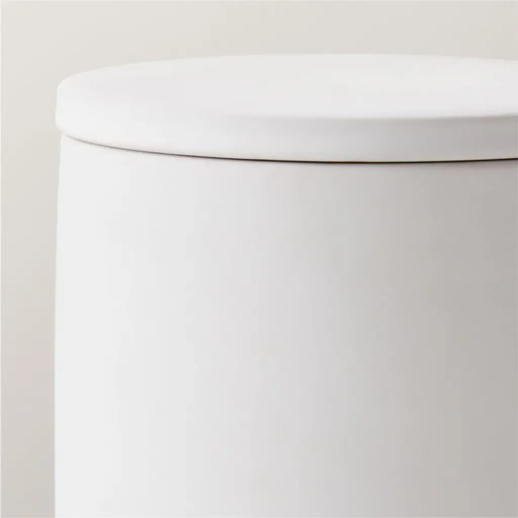 White canister offers clean storage with a surprising surface of white rubber. Go for a full sensory experience with all of our rubber coated white accessories. CB2 exclusive.