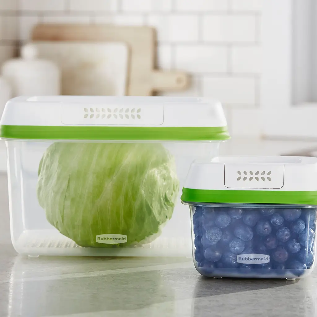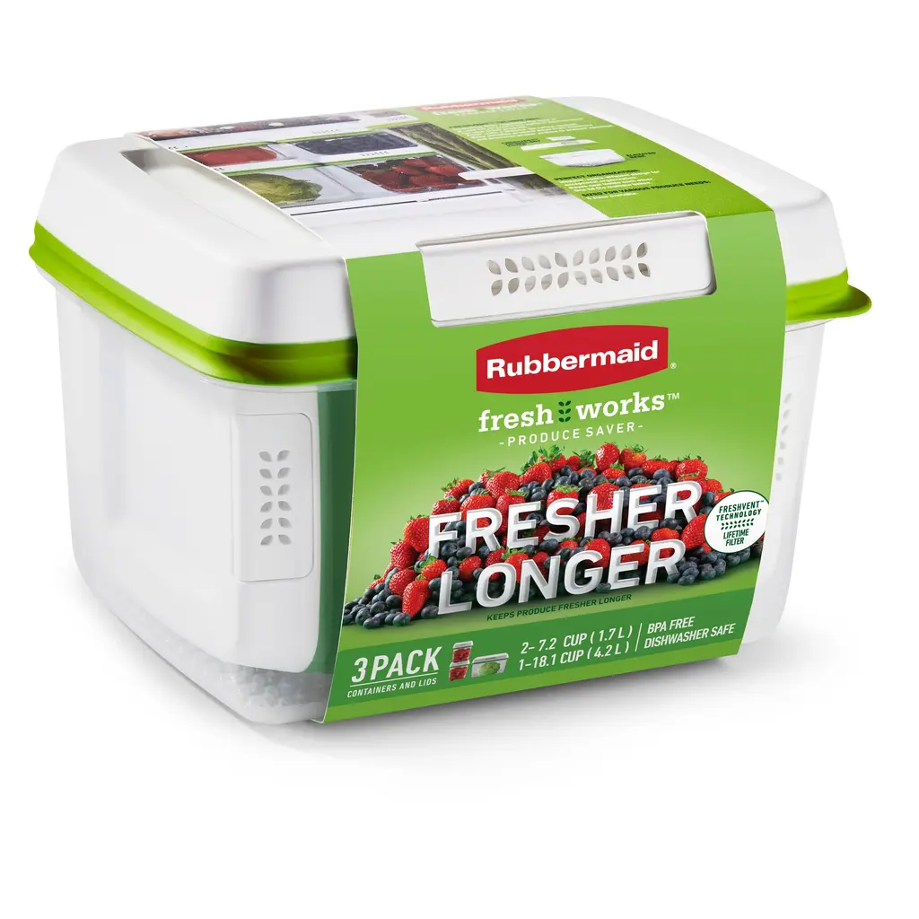 Rubbermaid FreshWorks Produce Saver keeps produce fresher longer. The FreshVent technology filter naturally regulates the flow of oxygen and carbon dioxide to to create the optimal environment for your fresh produce. The filter lasts the lifetime of the container, with no refills needed. The elevated base lifts produce away from moisture and promotes proper airflow to prevent spoilage. The modular, space-efficient design allows for easy kitchen organization—bases nest inside each other and one lid fits multiple bases to keep cabinets tidy. These plastic containers are BPA-free and dishwasher-safe for easy care. ・KEEP PRODUCE FRESHER LONGER: Rubbermaid FreshWorks Produce Saver uses FreshVent technology to regulate airflow, so your produce stays fresher longer. ・BUILT-IN FILTER: The built-in FreshVent filter in these Rubbermaid containers regulates the flow of oxygen and carbon dioxide to create the optimal environment for your fresh produce; the filter lasts a lifetime—no refills needed ・ELEVATED BASE: The elevated base in these plastic containers lifts produce away from moisture and promotes proper airflow ・EASY-CARE: BPA-free containers are dishwasher-safe ・EASY TO USE: Simply place unwashed and uncut produce in the FreshWorks container and place container in the fridge; FreshWorks works best when only one type of produce is stored in a container ・SPACE SAVING: Modular, space-efficient design for easy kitchen organization; bases nest inside each other, and one lid fits multiple bases ・WHAT YOU'LL USE THEM FOR: Medium containers: strawberries, blueberries; large container: iceberg lettuce, spinach ・SET INCLUDES: Two 7.2-cup medium and one 18.1-cup large container and lids, for a total of 6 pieces