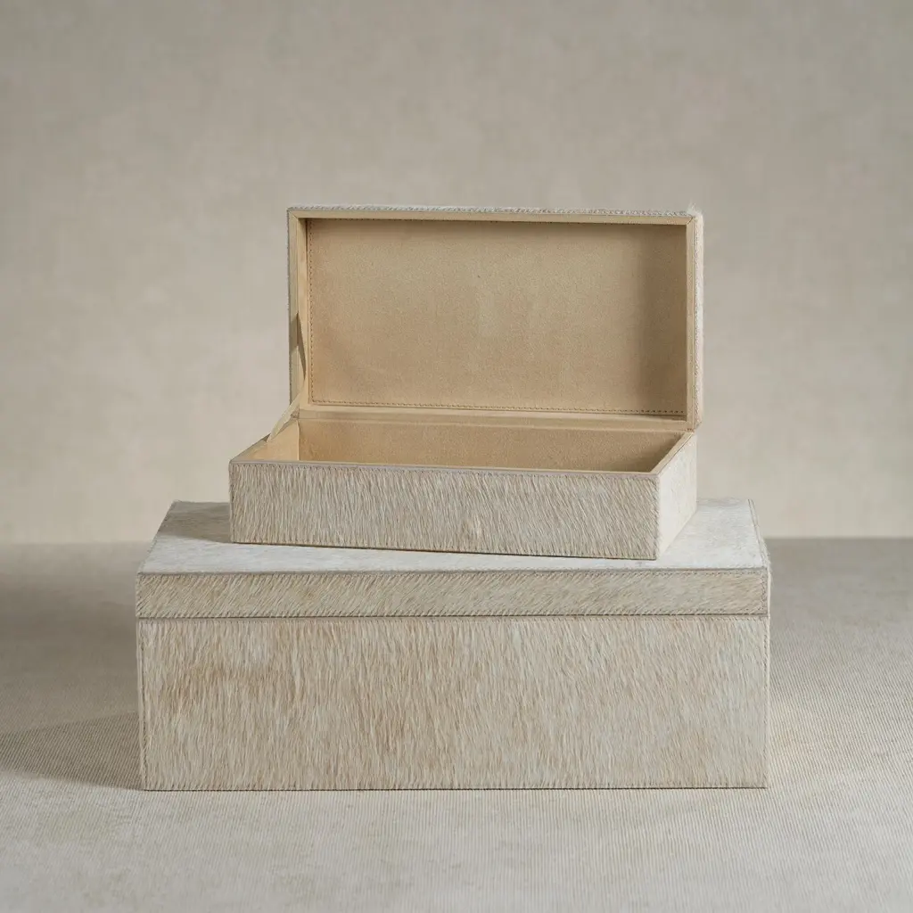 Stay organized without sacrificing beauty or quality. The hair-on-hide leather exterior of our decorative box looks great on a bookshelf, desk or dresser while the soft suede interior cradles stationery, photos, keepsakes, or valuables in luxury. The best way to keep your small belongings in an organized manner. Single compartment; Lift open sides lid. Exterior shell is crafted from hair-on-hide leather. Featuring exquisite stitching details. Lined with luxurious suede Frame is made from MDF. Due to the organic nature of leather and hides there may be slight variations in color and pattern, along with scarring which is considered a unique attribute of the material and not a defect.. Spot clean only.
