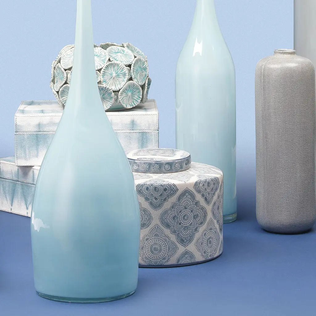 These canisters feature a simple, contemporary column shape adorned with a sophisticated Arabic indigo pattern, beautifully contrasted against a bone white porcelain background. Ideal as multifunctional accents, they add a touch of elegance to any space. Designed for decorative use only, these handmade ceramic canisters do not hold water.