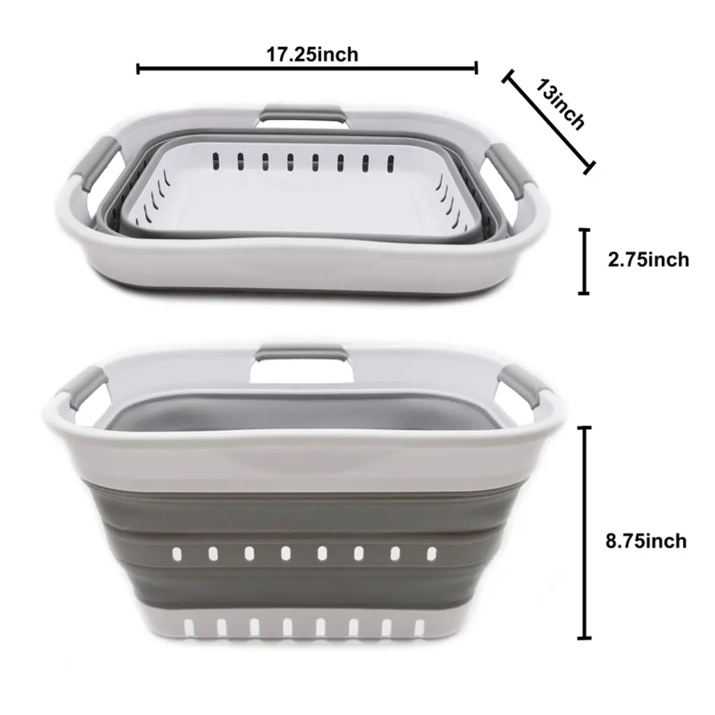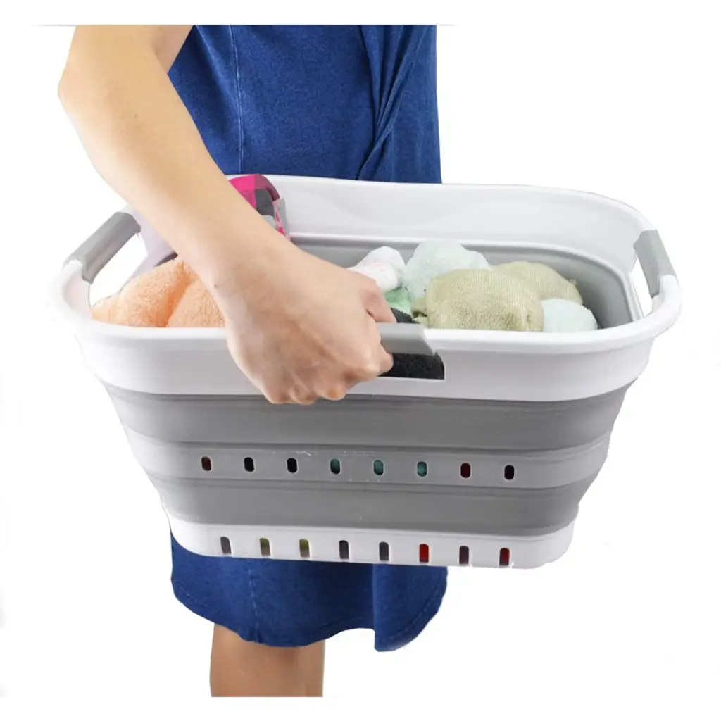 Brand: SAMMARTFeatures: Patent: US 9,926,105 B2 ; DE 20 2014 101 047 U1 ; ZL 2014 1 0386688.1BPA Free. User friendly by simply pop-up to open when using and collapses to flat for space saving.Space saving with Expanded size: 17.4 x 13 x 9 (h) inches and its height just 2.8 inches after folds, save over 70% space when storageComfort grip handles for easy carryPerfect as storage container for toys, clothes and keep in the trunk of your carDetails: **Collapsible TPE/PP Laundry Basket **Brand: SAMMART **Material: TPE & PP **Expanded size: 17.4 x 13 x 9 inches **Collapsed size: 17.4 x 13 x 2.8 inches **Capacity: 19L (5 gallon).