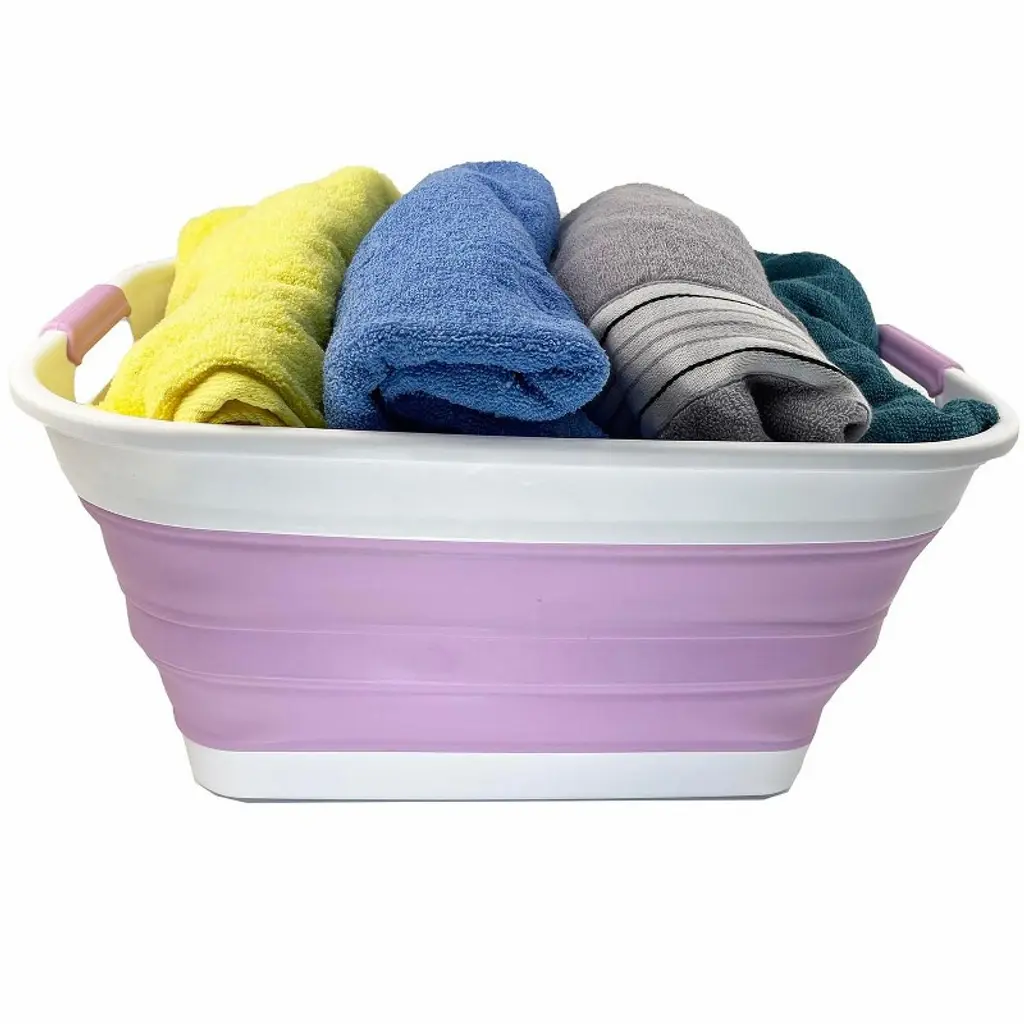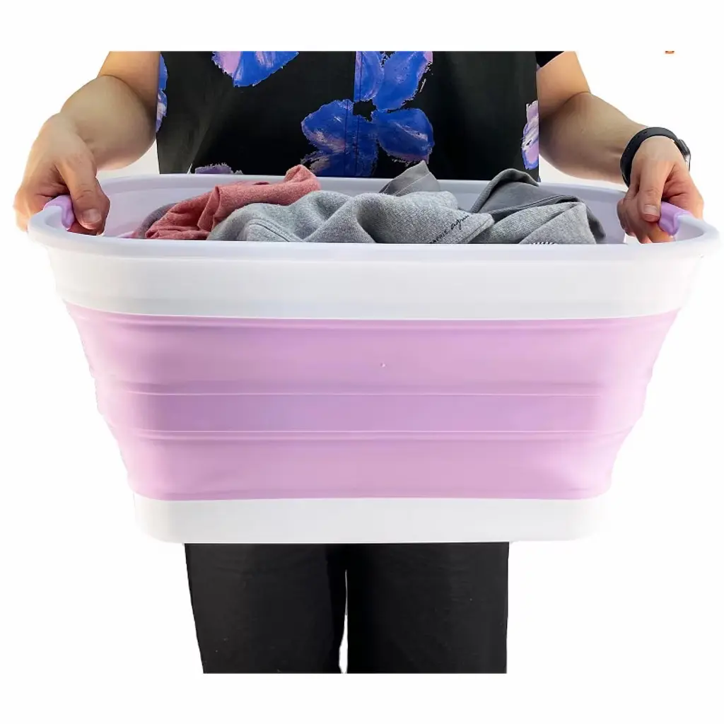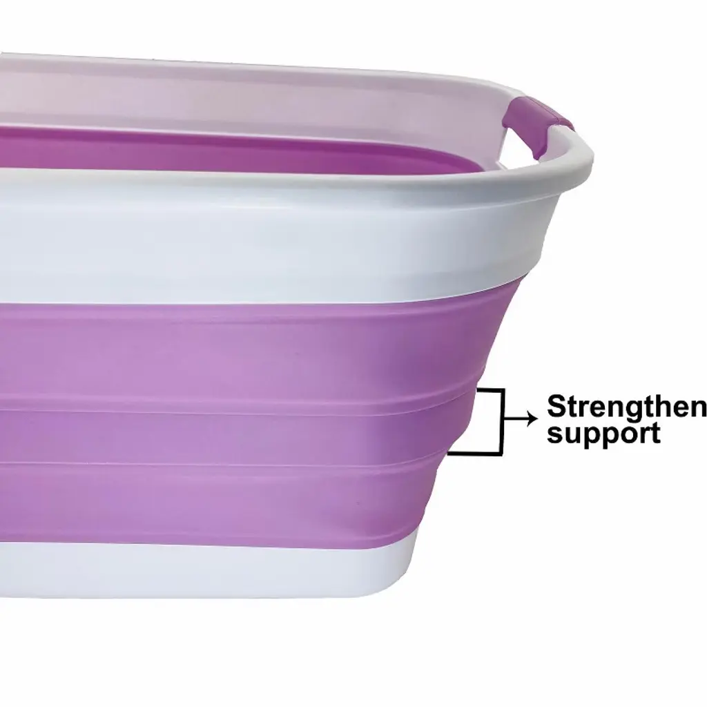 Brand: SAMMARTColor: White/Pale PurpleFeatures: Patent: US 9,926,105 B2 ; DE 20 2014 101 047 U1 ; ZL 2014 1 0386688.1BPA Free. User friendly by simply pop-up to open when using and collapses to flat for space saving.Space saving with Expanded size: 19.6 x 15 x 9.7 (h) inches and its height just 2.2 inches after folds, save over 70% space when storageComfort grip handles for easy carryPerfect for icing beverages, bathing pets, soaking & hauling laundry and storage container for toys, clothes and keep in the trunk of your car.Details: **Collapsible TPE/PP Laundry Basket **Brand: SAMMART **Material: TPE & PP **Expanded size: 19.6 x 15 x 9.7 (h) inches **Collapsed size: 19.6 x 15 x 2.2 (h) inchesItem Condition: NewUPC: 843050122120