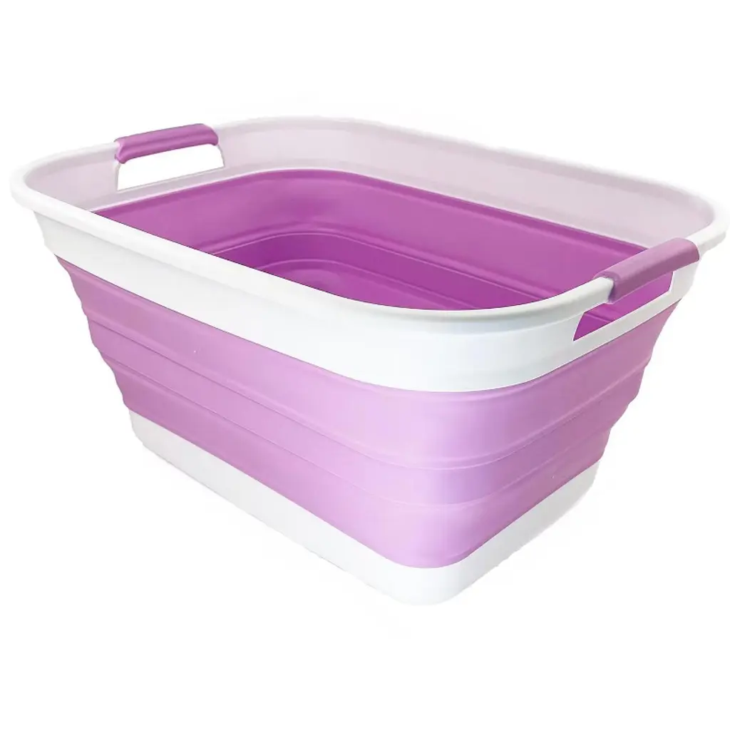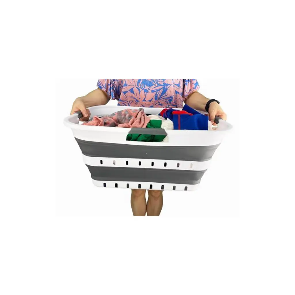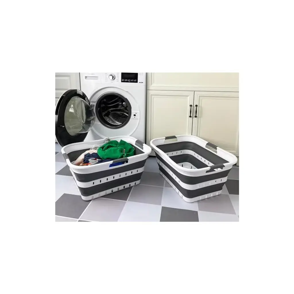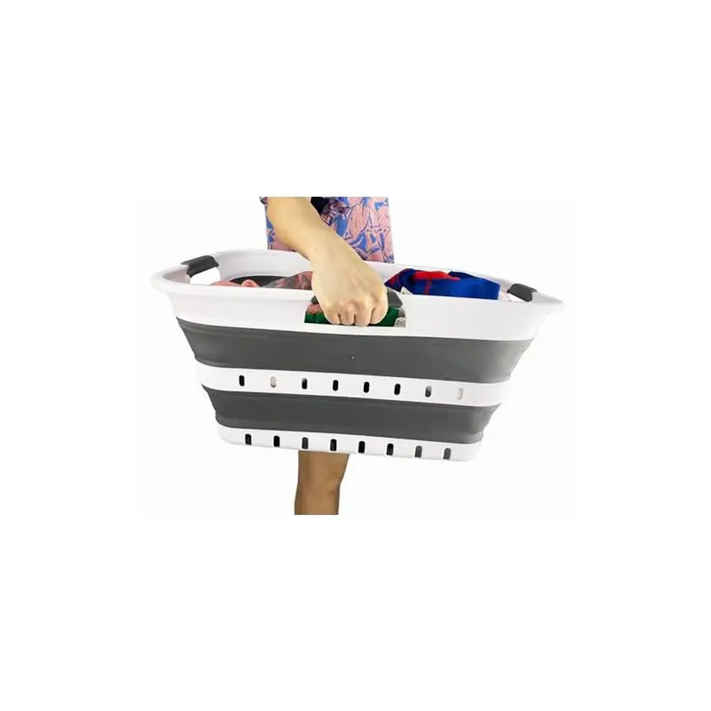 Brand: SAMMARTFeatures: Patent: US 9,926,105 B2 ; DE 20 2014 101 047 U1 ; ZL 2014 1 0386688.1BPA Free. Comfort grip handles for easy carry. User friendly by simply pop-up to open when using and collapses to flat for space savingSpace saving with Expanded size: 22.8 x 17.5 x 10.6 inches and its height just 2.7 inches after folds, save over 70% space when storagePerfect design, which all the wall and angles stand relatively straight and without deformPerfect for laundry and storage container for toys, clothes and keep in the trunk of your carDetails: **Collapsible TPE/PP Laundry Basket **Brand: SAMMART **Material: TPE & PP **Expanded size: 22.8 x 17.5 x 10.6 inches **Collapsed size: 22.8 x 17.5 x 2.7 inches