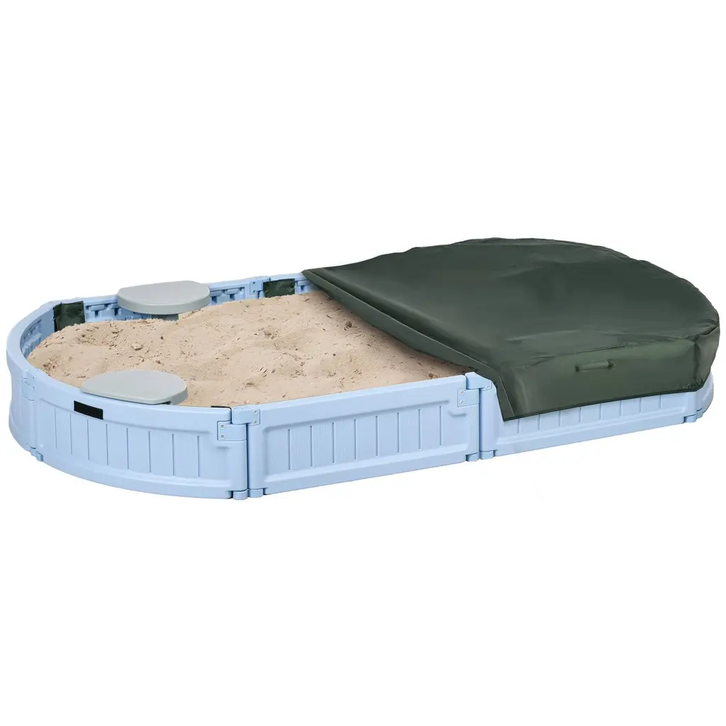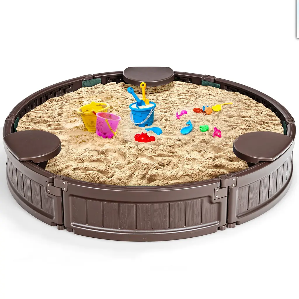 SpecificationsKey Features● All Weather Resistant Material: The sandbox is made of all-weather HDPE material, which is less susceptible to decay or wear than wood, and is suitable for outdoor use such as parks, beaches, and backyards. And the surface of the sandbox is smooth. Besides, the curved edges is not easy to hurt the delicate skin of children. ● Built-in Seats & Large Play Area: Each corner of the sandbox includes a seat, which can hold up to 110 lbs. It is suitable for children up to 3 years old, giving children a place to sit while playing in the sand and avoiding soiling their clothes. And it measures 47" x 47" x 8", providing plenty of space for your children to play. ● Provide Endless Fun for Your Kids: With this sandbox, you can turn your backyard or other outdoor spaces into an amusement park with plenty of space for your kids to explore and develop creativity and communication skills in a fun way. It is an ideal Christmas or birthday gifts for kids. ● Bottomless Design & Dust-proof Cover: This sandbox comes with a built-in liner, which is located below the bottomless box to facilitate drainage, ventilation and adjust the sand depth. Additionally, the sandbox kit includes a dust-proof and waterproof cover to protect the sand from leaf litter or debris. ● Easy to Carry & Assemble: With the help of the easy-to-follow instruction, you can quickly create a sandpit for you kids only by putting all the accessories together. To better secure the sandbox to the ground, we also provide 8 ground stacks which is quite easy to use. And the sandbox is lightweight. So it is convenient for you to carry outdoor.