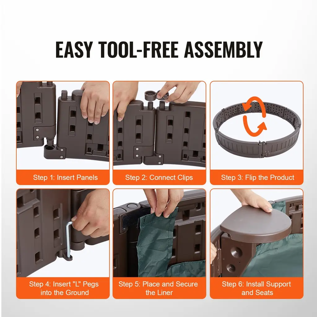 Children's Mini Playground: Our sand box is not just a play area but a place where happy childhood memories are made. With a size of 48.6 x 48.6 x 12.4 in (1235 x 1235 x 315 mm) / 72.0 x 41.5 x 9.1 in ( 1830 x 1055 x 230 mm), it can accommodate 2-4 children playing together, turning your backyard or outdoor play area into a playground filled with exploration and laughter. With a size of Φ47.2 x 9.1 in / Φ120 x 23 cm it can accommodate 2-3 children playing together. Enjoy Comfortable Play: The sandbox with cover includes 4 corner seats, allowing children to sit while they play, providing a more comfortable gaming experience without having to sit directly in the sand. When they get tired, they can rest on the seats. Each seat supports up to 110 lbs, providing sturdy support and ensuring safety. Easy Assembly: Our kids sandbox is easy to assemble with no tools required. Simply insert the panels into the slots, place the liner, and attach the seats. Clear installation instructions are included to help you create the perfect children's play space in no time. Bottom Liner and Sand Cover: The perforated bottom liner promotes drainage and ventilation, preventing the sand from getting wet. When the sand pit is not in use, the sand cover can be placed over it to keep the sand clean and dry and prevent it from blowing away. Weather-Resistant and Durable Materials: The sand box for kids is made of HDPE material, known for its excellent wear resistance and weather resistance, and has undergone rigorous environmental testing to ensure the health and safety of children. The sand cover and bottom are made of Oxford cloth, which can withstand various outdoor weather conditions. Note: The product does not include play-grade sand and toys. 48.6 x 48.6 x 12.4 in Package Content 4 x Straight Panels 4 x Seat Boards 4 x Small Plastic Clips 1 x Oxford Bottom Cloth 1 x Oxford Top Cover Cloth 8 x Long Support Iron Bars 4 x Short Support Iron Bars 17 x Velcro Strips 34 x Installation Bolts (with Washers) 1 x User Manual 72.0 x 41.5 x 9.1 in Package Content 4 x Straight Panels 4 x Curved Panels 4 x Seat Boards 4 x Support Bench Legs 1 x Oxford Bottom Cloth 1 x Oxford Top Cover Cloth 8 x Connecting Plastic Clips 25 x Velcro Strips 8 x Ground Pegs 1 x User Manual Φ47.2 x 9.1 in Package Content 6 x Curved Panels 3 x Seat Boards 3 x Support Bench Legs 1 x Oxford Bottom Cloth 1 x Oxford Top Cover Cloth 6 x Connecting Plastic Clips 19 x Velcro Strips 6 x Ground Pegs 1 x User Manual