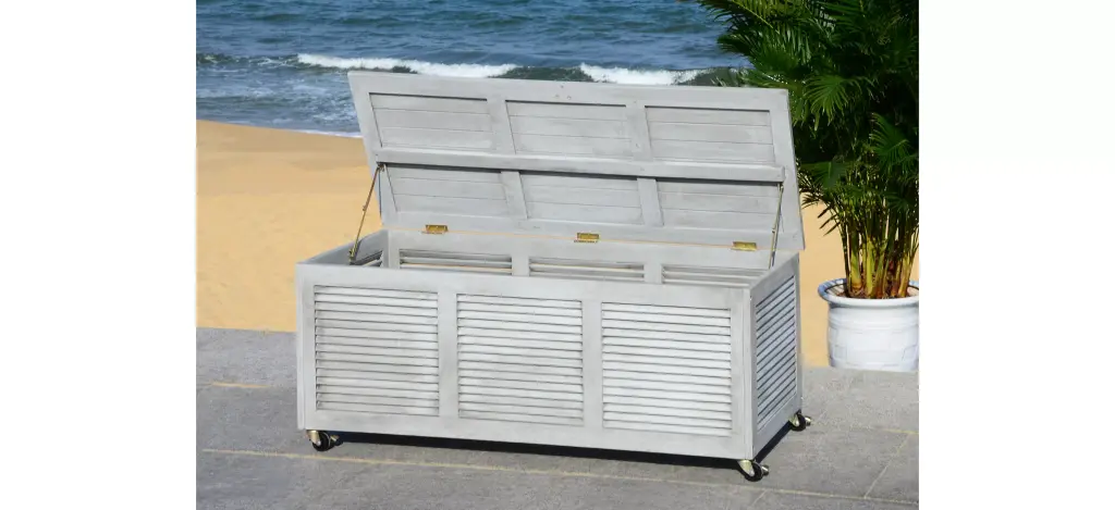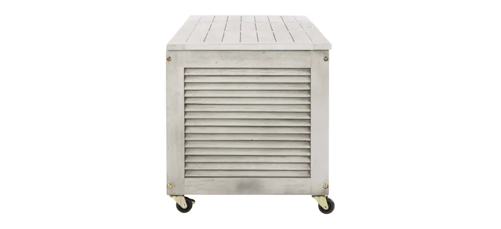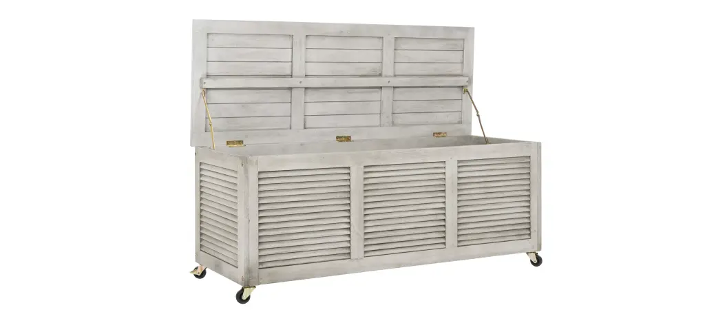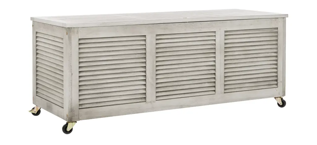A rare combination of form and function, the Sanders cushion box makes a grand statement in any outdoor living area. Ideal for outdoor accessories, its eucalyptus wood construction with classic gray wash finish makes it an investment in substantial storage.
