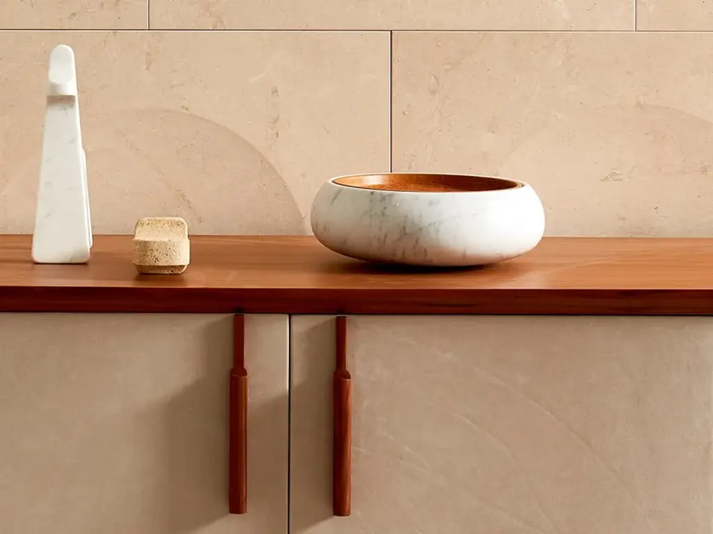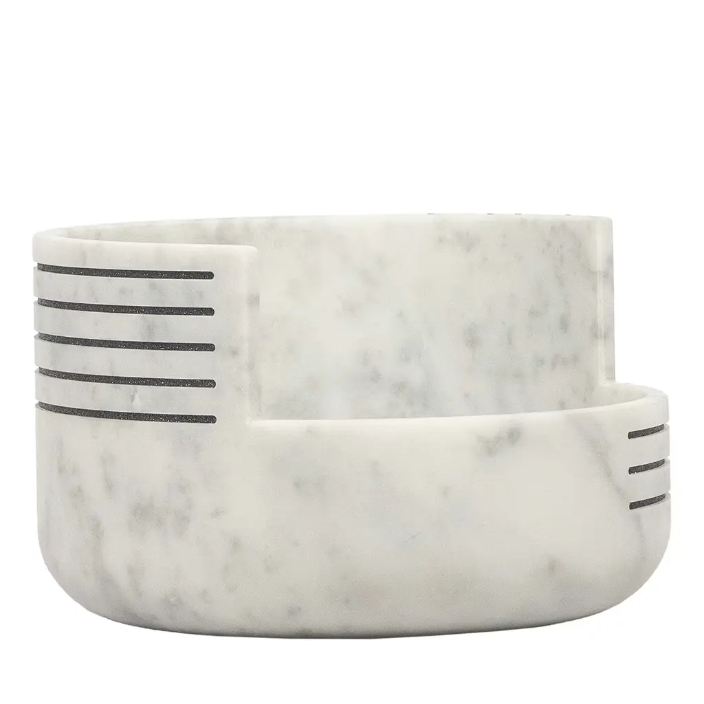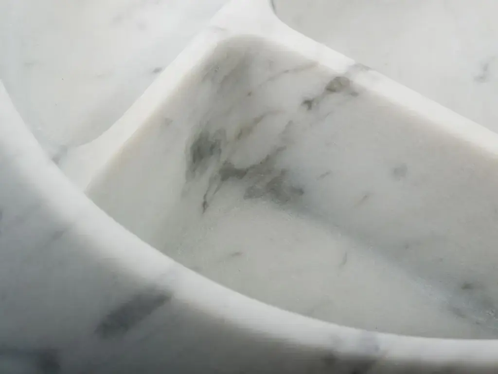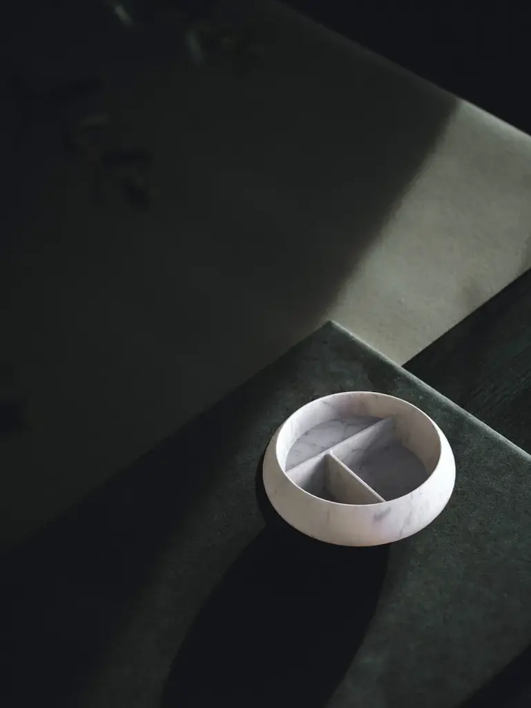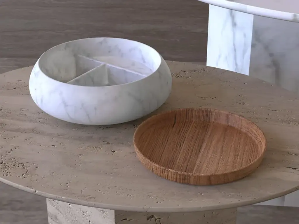 Sasso is a three compartments tray in White Carrara marble with Teak cover that, thanks to its simplicity, manages to adorn every shelf on which it is placed. Sasso knows how to be discreet thanks to its teak part that can be a cover, and it is useful in every room. A polite design, highlighted by the perfect balance of materials, their harmonies and contrasts.