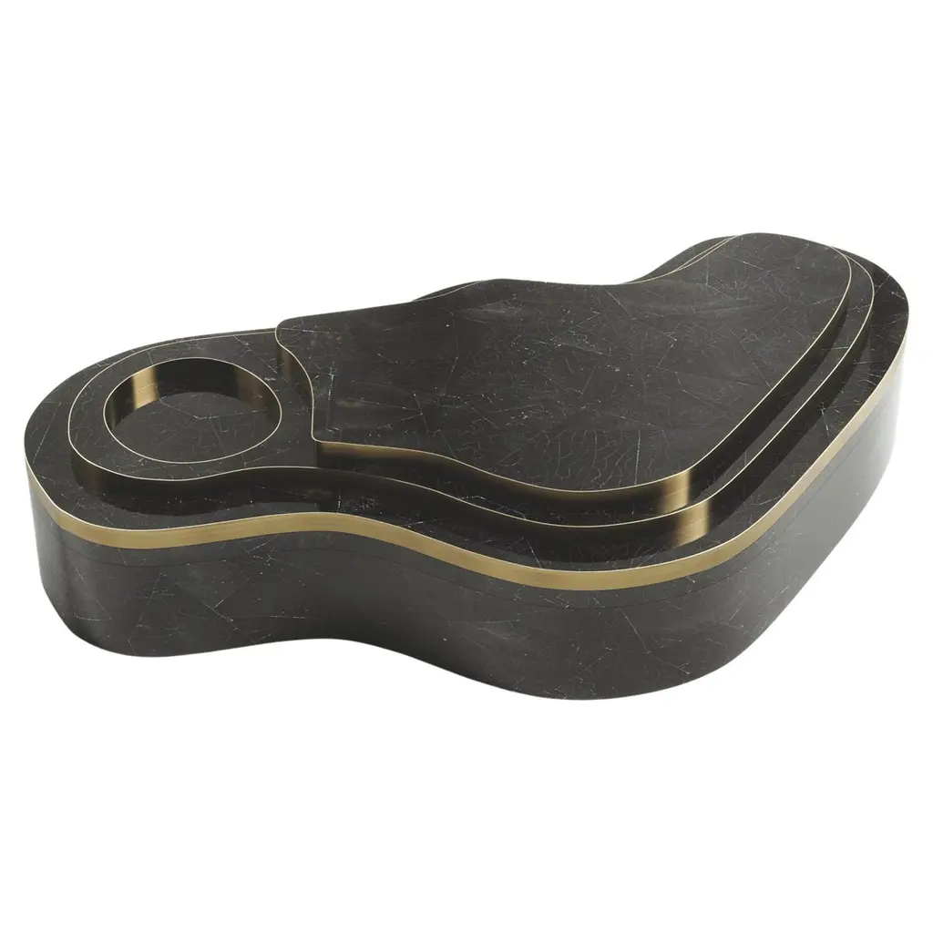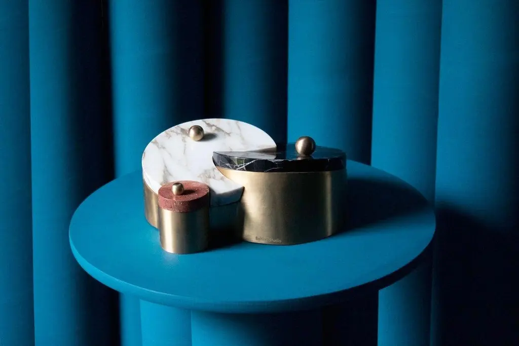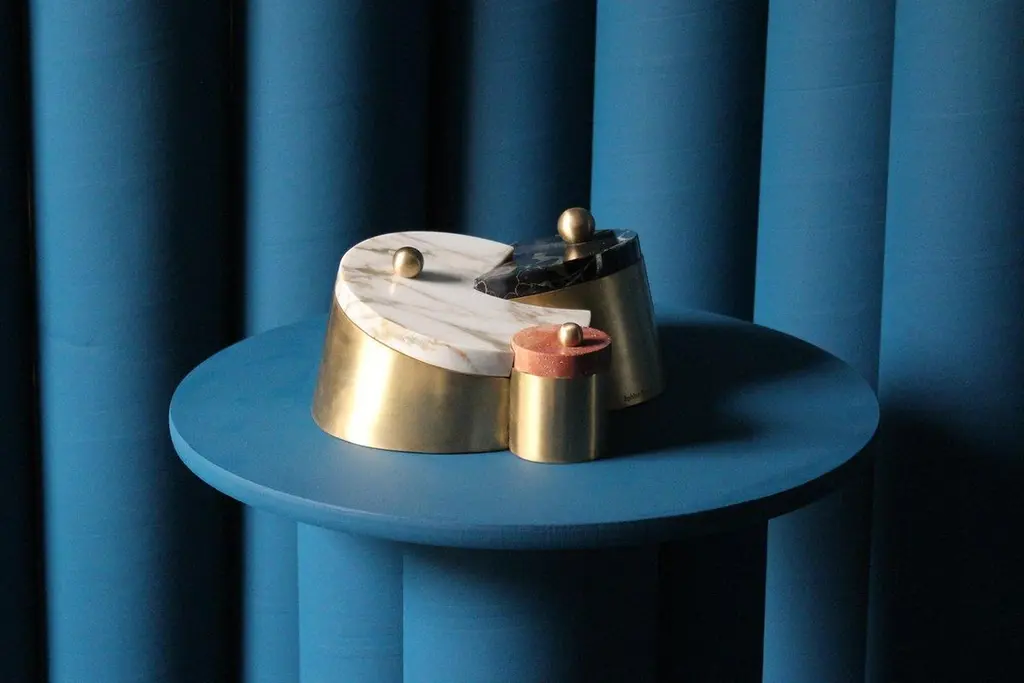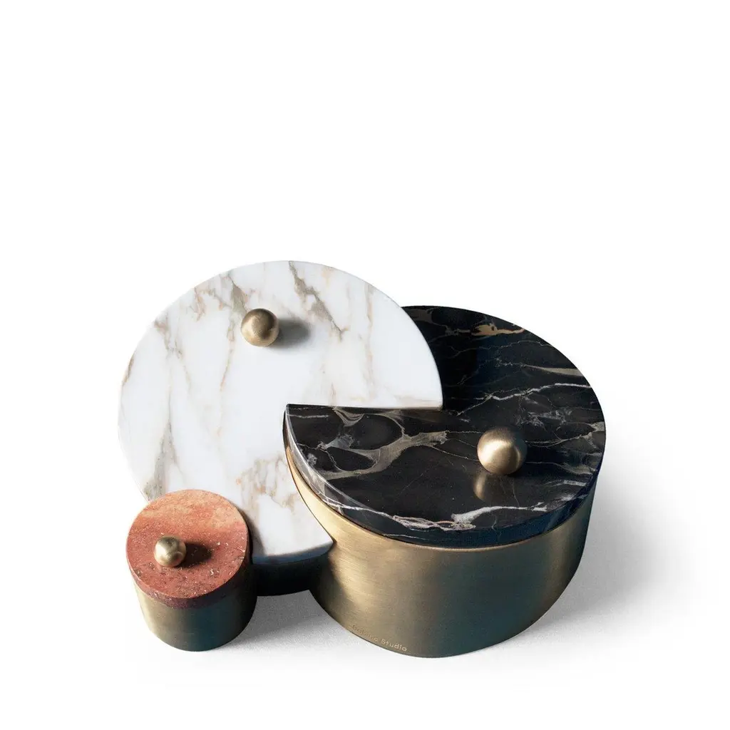 The box’s interlocking shapes reference this year’s exceptional planetary conjunction between Saturn and Pluto. The Saturn and Pluto box features three brass round compartments with tops in calacatta, red travertine and portoro marble.Handmade in Italy using a mix of handmade metalwork and 3-D milled marble parts. Please note that no two marbles are alike and there will be variations in the pattern as well as in the colour of the pieces.Please note that even though brass is protected by clear varnish, it may still oxidise over the years which is a natural ageing process.Each object is individually numbered and comes with a signed Certificate of authenticity to prove that it is Bohinc Studio original.Limited edition of 10 boxes.MATERIAL: marble and brassDIMENSIONS: 250 x 200 x h 110mm