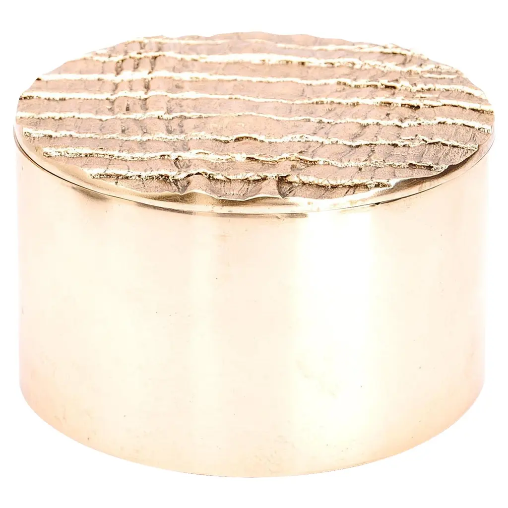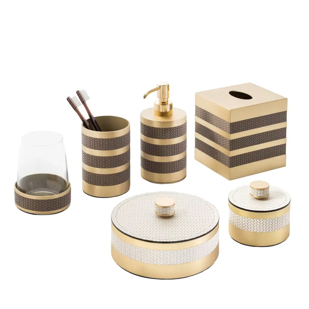 This stunning object of functional decor is part of the Saturno Collection of brass and leather pieces to accessorize a bathroom or powder room with elegance and style. Entirely crafted of brass with a brushed finish, the box's round shape is highlighted with a band of white-colored leather, creating a timeless color combination that is sophisticated and bright. The lid is entirely upholstered in the same leather with a matching handle. Other leathers are available - please ask the concierge.