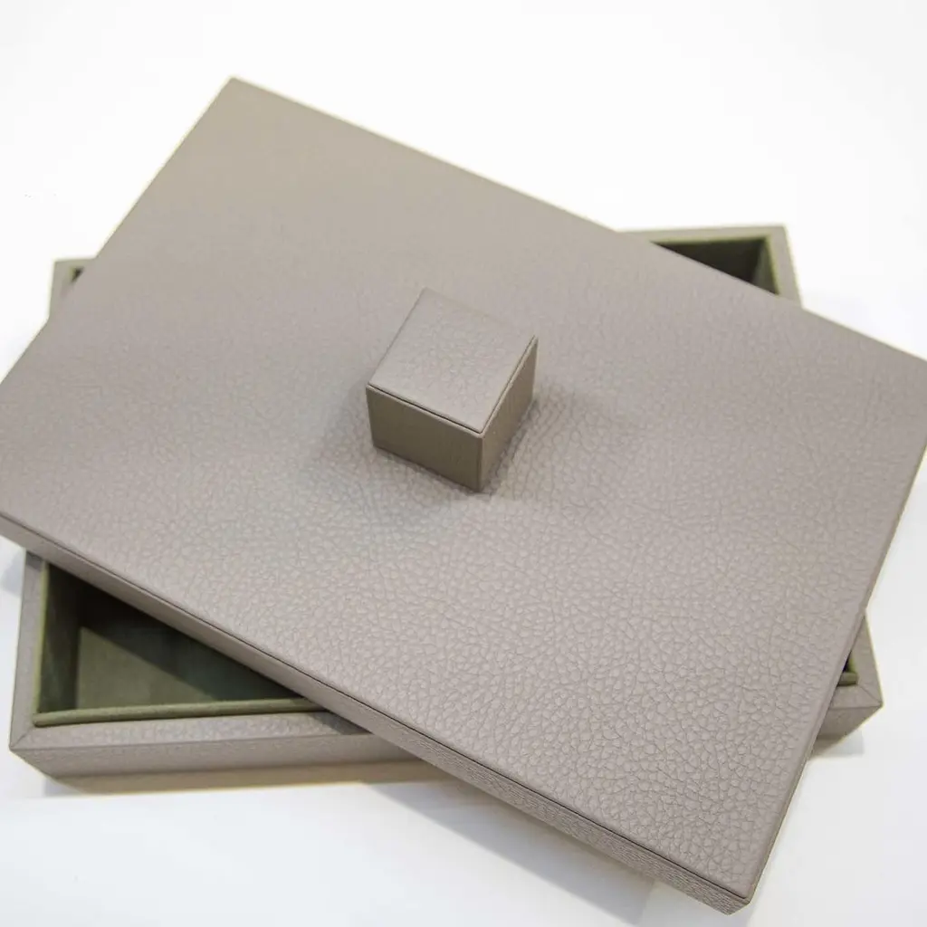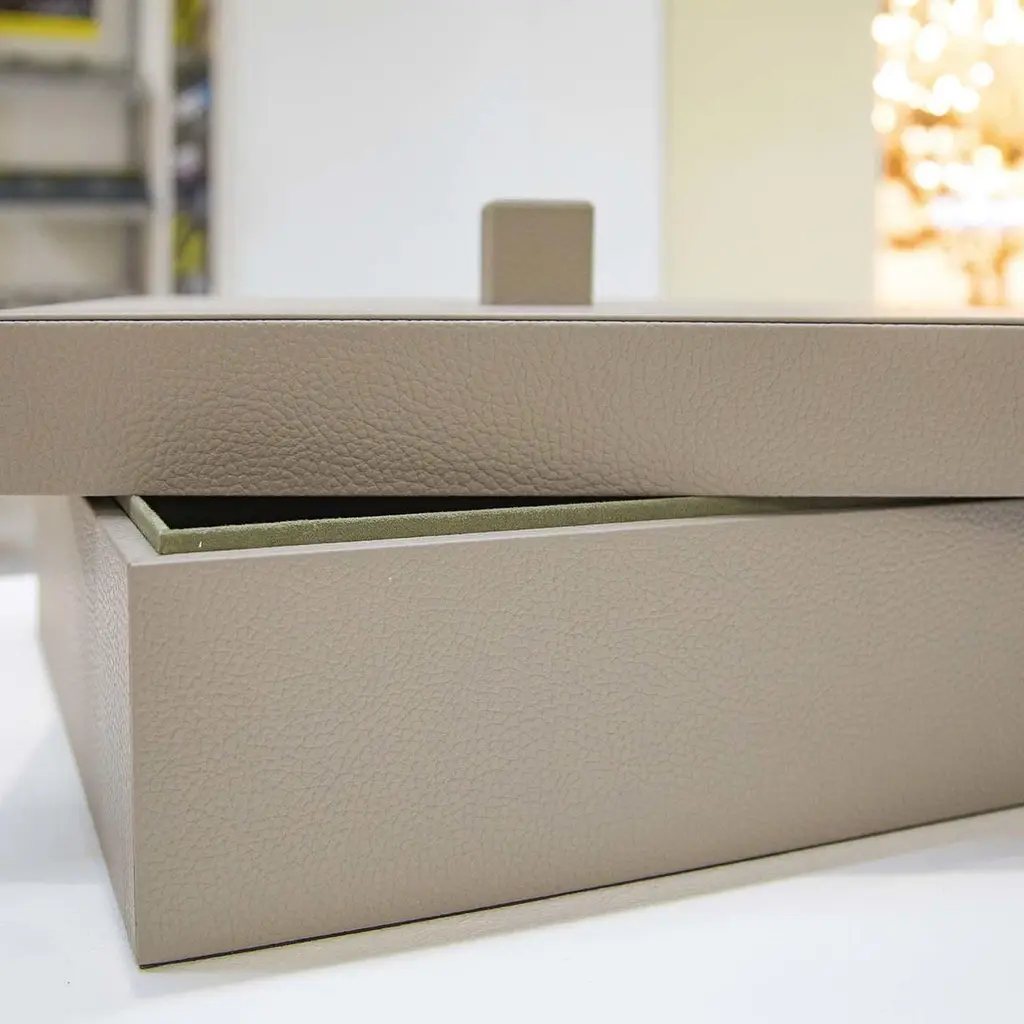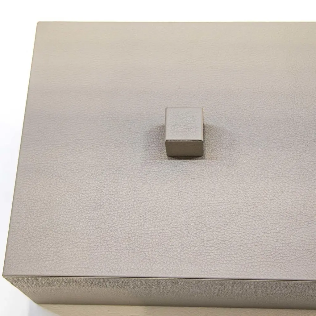 Showcasing both a simple and contemporary silhouette, this box with lid of the Scuretto Collection is defined by subtle elegance and enduring quality. A combination of fine materials and high craftsmanship, this box has a square wooden structure covered entirely in soft pebble-grain leather in a neutral and versatile sand color with a square knob. Lending timeless quality to any interior, this box can be used in a bathroom to store make-up, or displayed on a bedroom dresser or office desk for a touch of timeless elegance. It is available in 13 different colors.