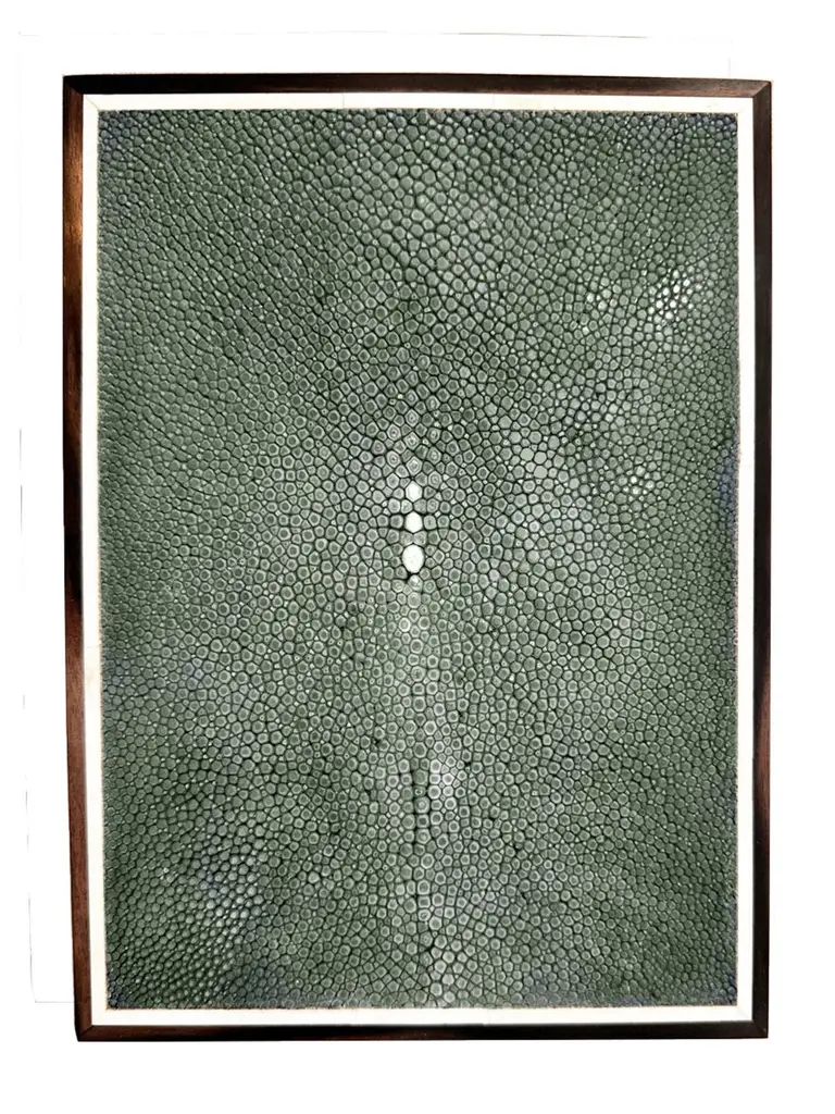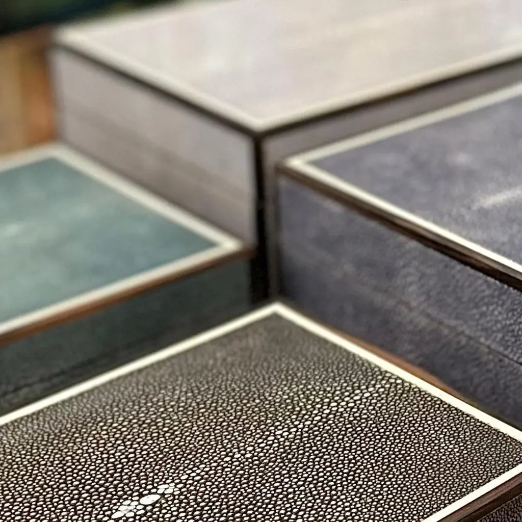 Elegant, exotic, and unmistakably refined, shagreen has long captivated those with a discerning eye for luxury.A study in subtle opulence, this artisan-crafted decorative box is wrapped in premium stingray shagreen—each panel selected for its naturally rich texture and soft, matte sheen. The shagreen’s distinctive surface, long favored by French nobility and Art Deco designers, brings a tactile elegance that instantly elevates any interior.Refined ivory inlay adds contrast and crisp geometry, framing the piece with sophistication. Inside, you’ll find a flawlessly finished ebony macassar lining—deep, lustrous, and dramatically grained—offering not just beauty, but a sensorial experience every time the lid is lifted. Polished stainless steel hinges assure smooth operation for a lifetime of use.This piece is ideal for storing fine jewelry, watches, or keepsakes—but its presence alone makes a statement. Whether placed atop a console, bedside, or private dressing area, it reflects an appreciation for craftsmanship, history, and the rare materials that define true luxury.Dimensions:Width: 8 inchesDepth: 6 inchesHeigth: 2.3 inchesCondition: New