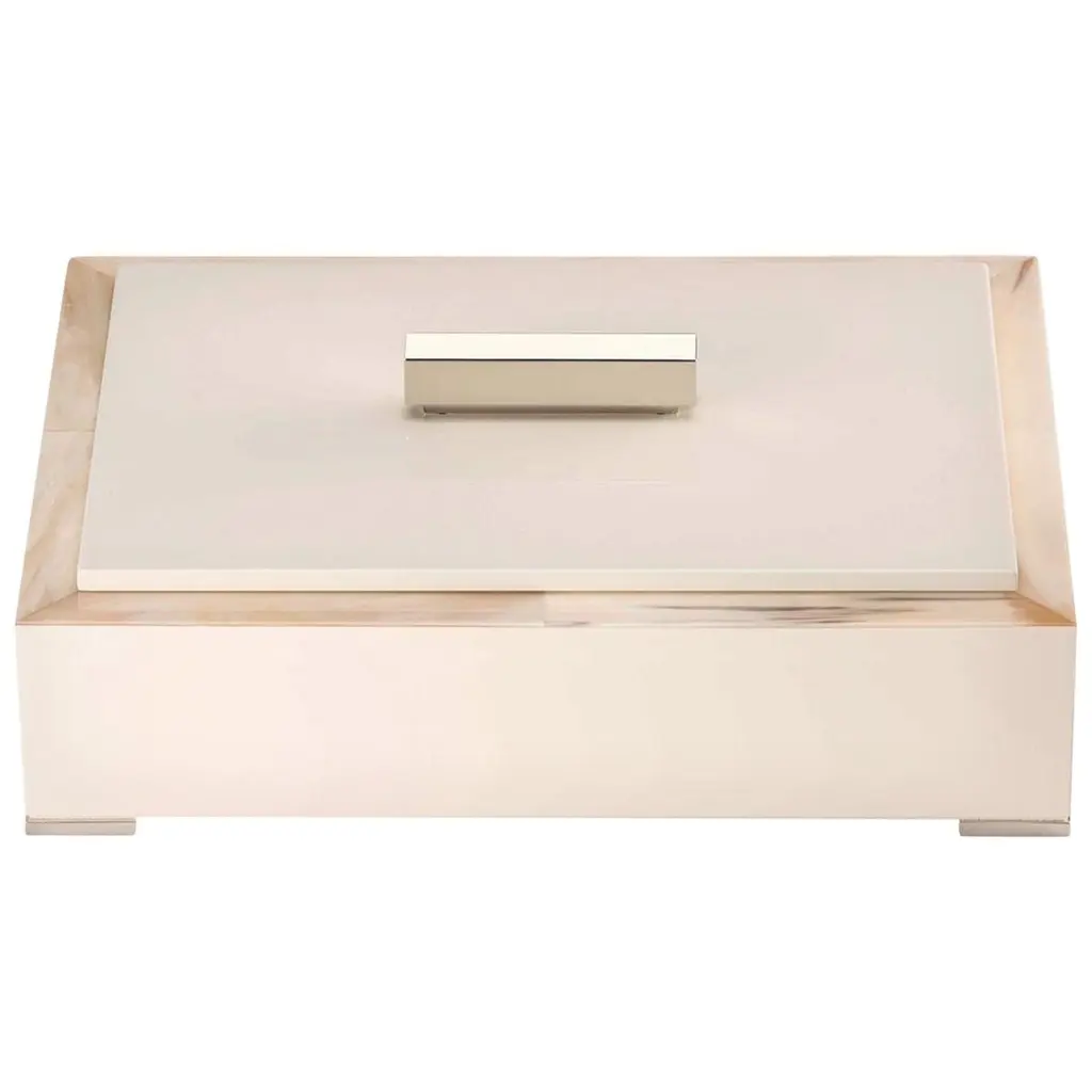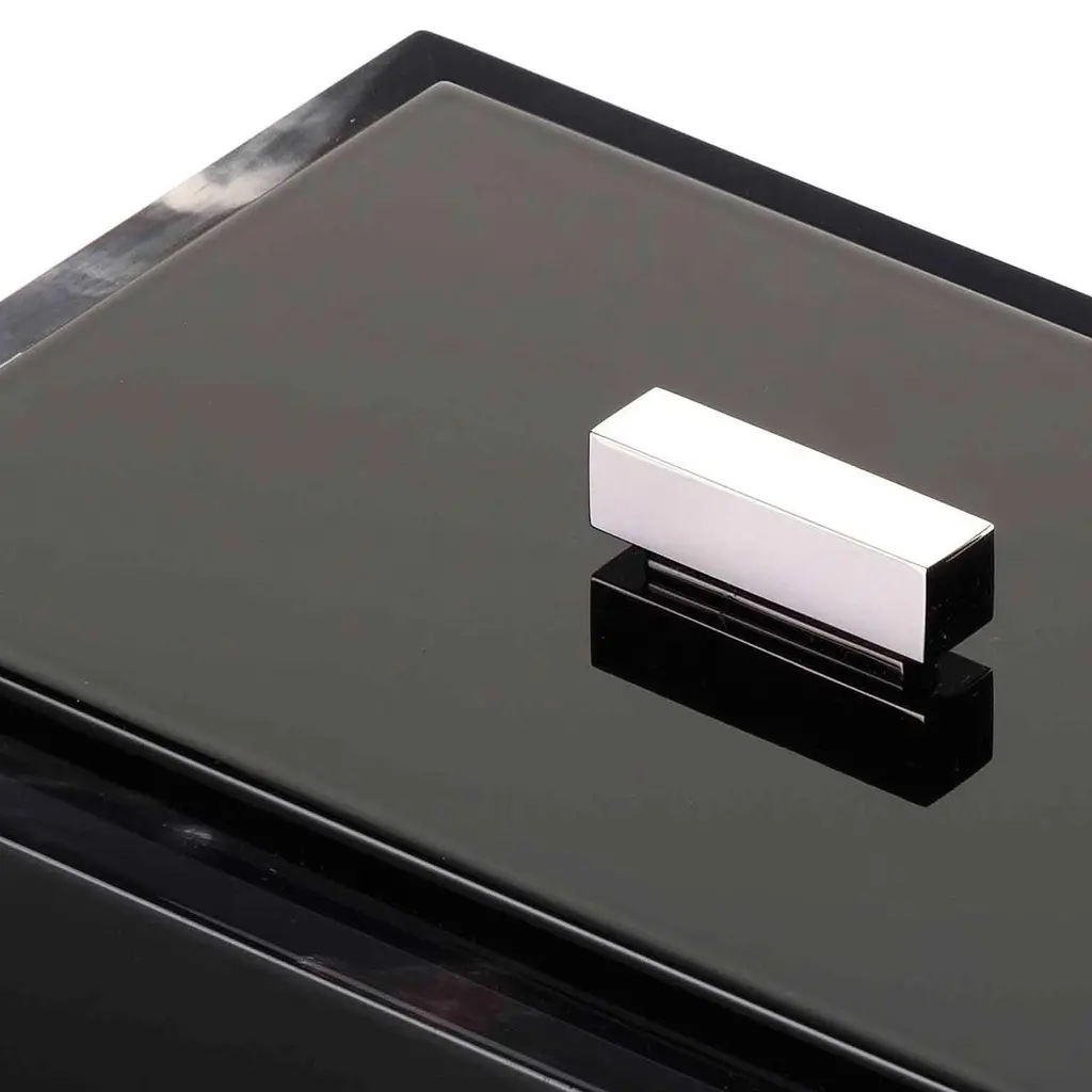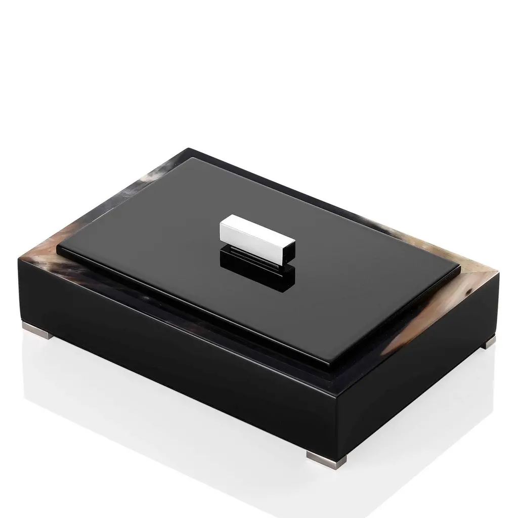 Distinguished by plush materials and essential lines, our Selene box showcases a rectangular wooden structure with a polished black lacquer finish. Enhanced by an elegant edging in Corno Italiano, this versatile box sits atop four feet in chromed brass and boasts an internal lining in exquisite black Tosca leather (cat. Super). The lid in glossy black lacquered wood features a practical handle in chromed brass adding a modern touch to this exclusive object of decor. The design is available in two different sizes. Note: Colors and shades of Corno Italiano processed by our Company are unique and due to the natural origin of raw material. For this reason Corno Italiano tones that can be seen in pictures are indicative and can not be reproduced in finished products.