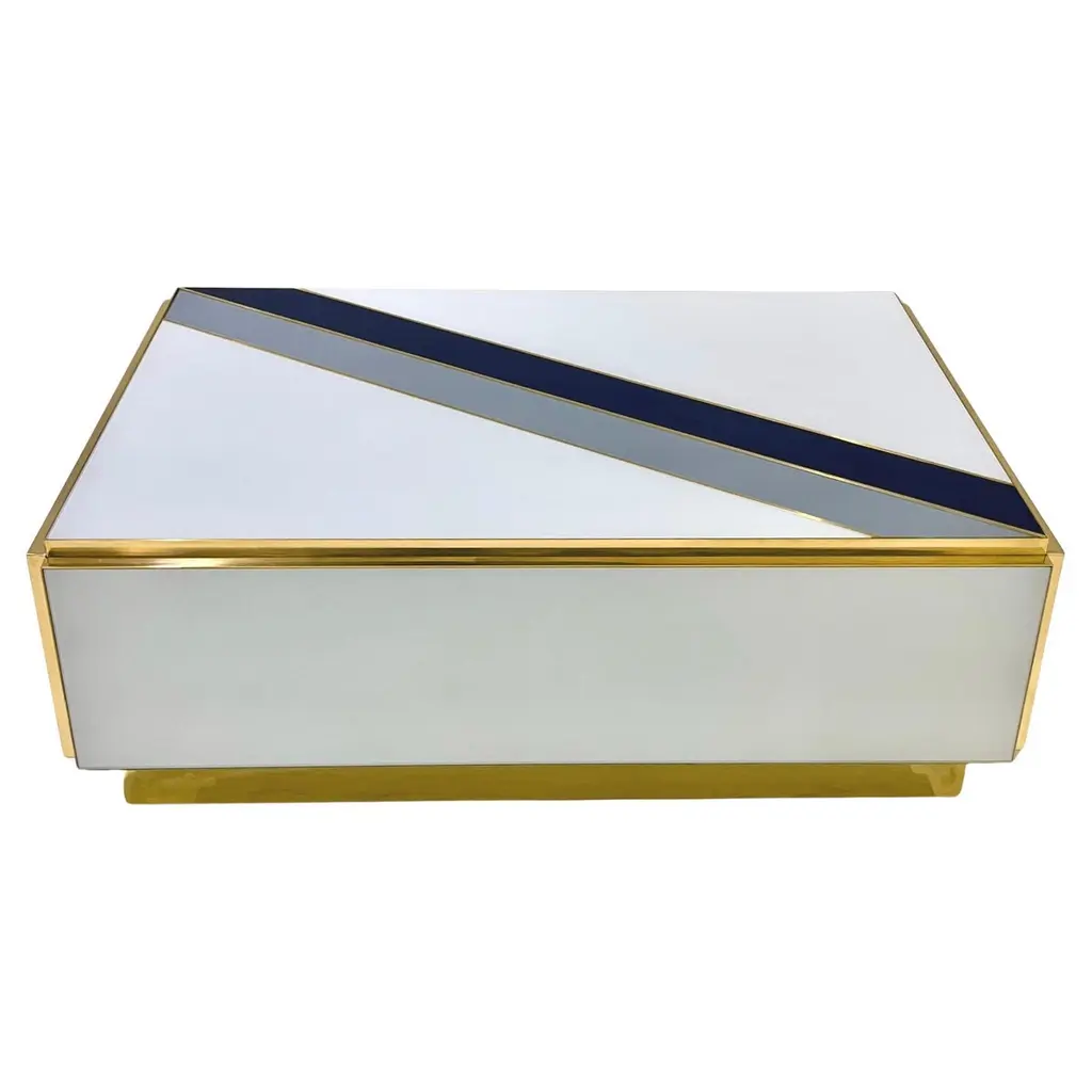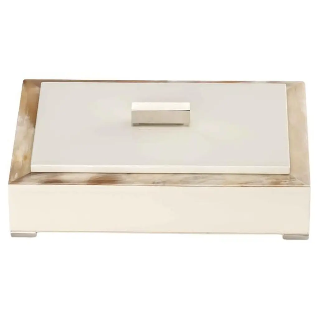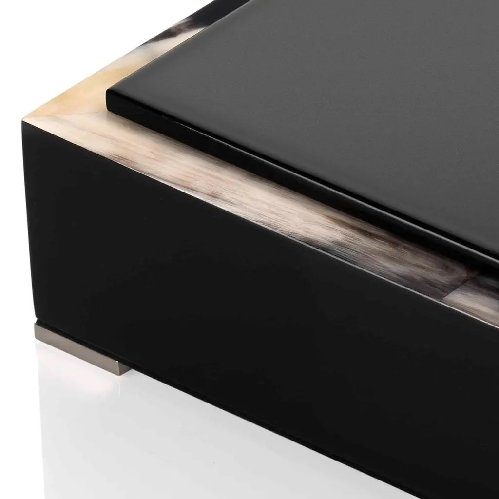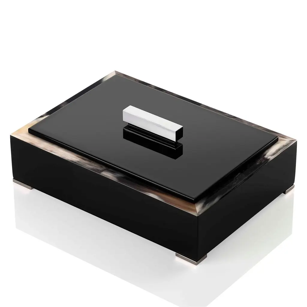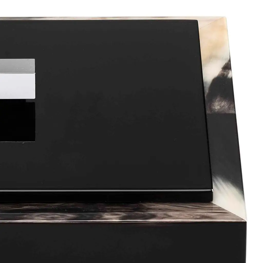 Distinguished by plush materials and essential lines, our Selene box showcases a rectangular wooden structure with a polished black lacquer finish. Enhanced by an elegant edging in Corno Italiano, this versatile box sits atop four feet in chromed brass and boasts an internal lining in exquisite black Tosca leather (cat. Super). The lid in glossy black lacquered wood features a practical handle in chromed brass adding a modern touch to this exclusive object of decor. The design is available in two different sizes. Note: Colors and shades of Corno Italiano processed by our Company are unique and due to the natural origin of raw material. For this reason Corno Italiano tones that can be seen in pictures are indicative and cannot be reproduced in finished products.