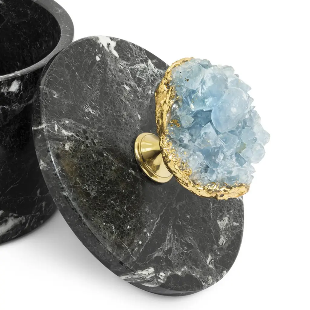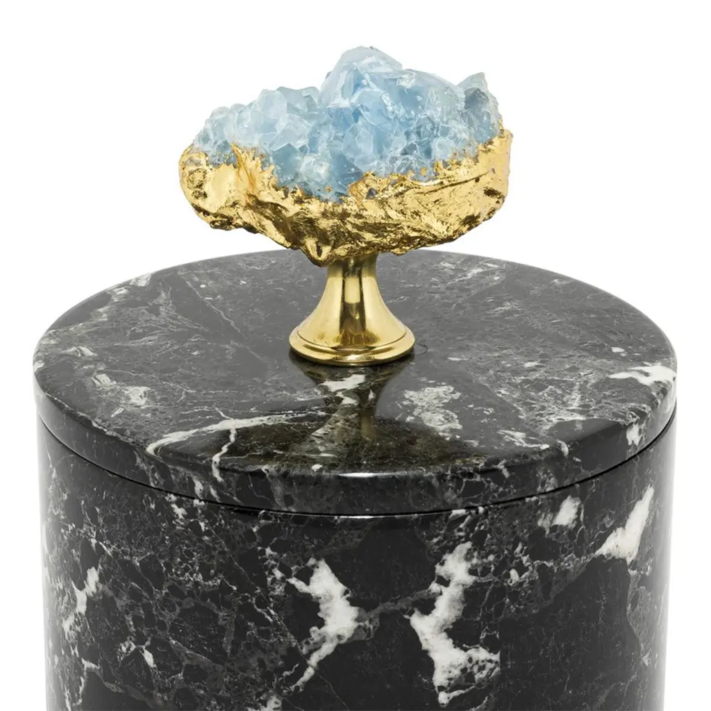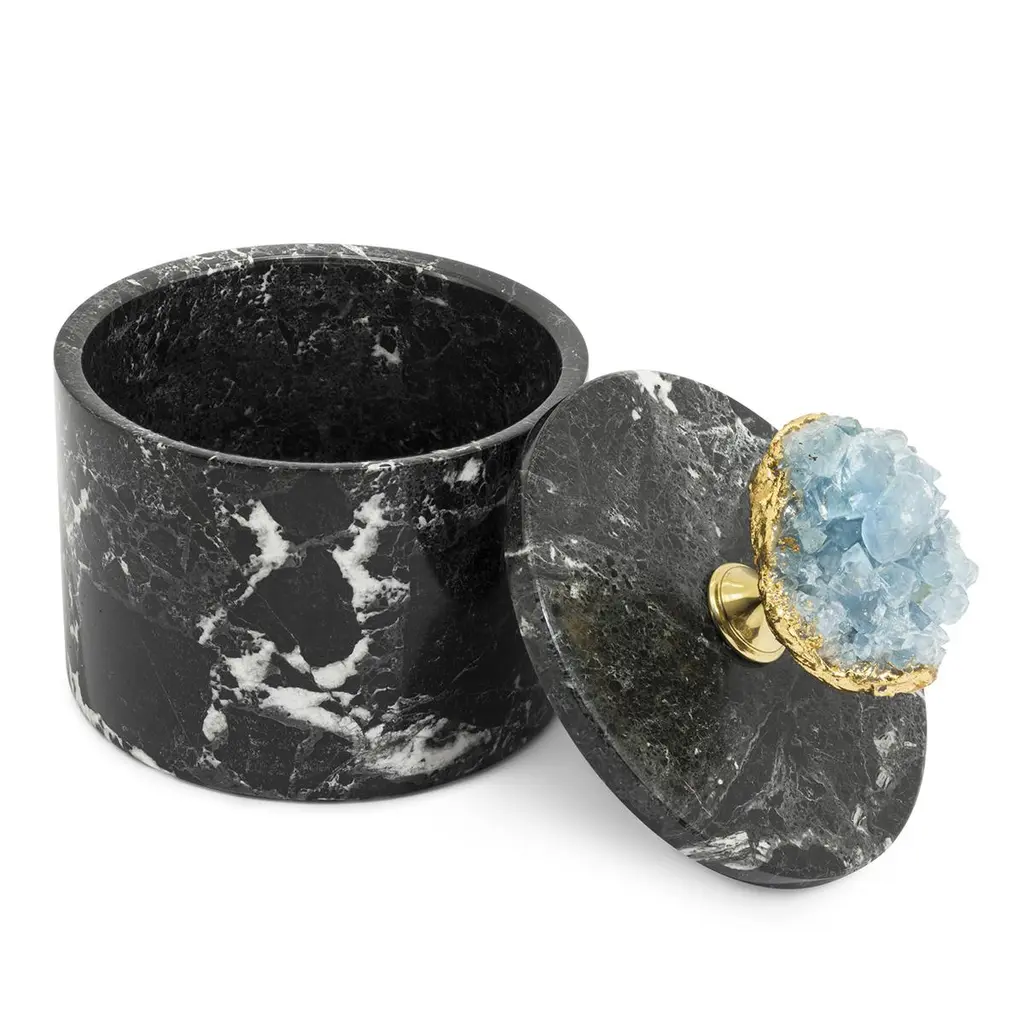 Box selenite and marble medium in black marblewith lid. With natural selenite on lid's top.