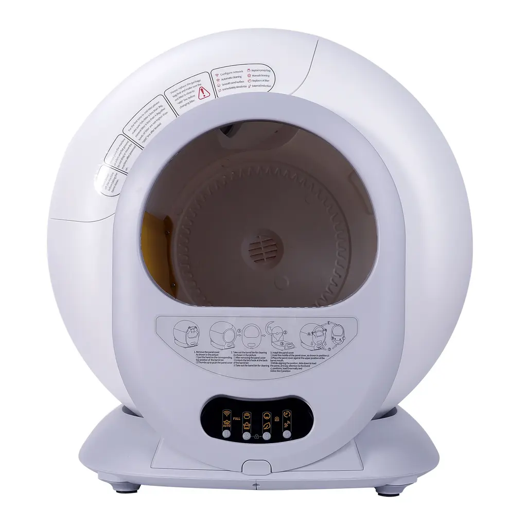 Multi-Functions Cat Litter Box: There is No need for You to Scoop Your Cat's Litter with Hands anymore After Using Our Automatic Cat Litter Box. This Litter Box Has One-Click Clean, Replace Litter and Automatic Remove Odor Modes. Even if You Have to go on Business or Travel for Almost one Week, You can Totally Count on the Automatic Cat Litter Box.App Control: Connect to the Network (2.4GHz Wi-Fi only). All Functions Can be Operated through Using the Device's Touch Panel or App Control. Use the App for Remote Control, Monitor the Frequency of Your Cat's Litter Box Usage. This Smart Cat Litter Box Equipped with Four Weight Sensors, Information about Your Cat's Frequency, Time, and Weight of Cat will be Updated Through the App.Safe for Cats: Adopts Several Safety Mechanisms to Protect Your Loving Pets. The Infrared Sensor will Stop the Box from Working Immediately when Unknown Objects or Increased Weight are Detected. A 30cm Infrared Detector Can also Shut down the Box as Soon as it Detects Cat Activity Nearby and Inside. Meanwhile, the Child Lock Size Protects Both Your Children and Pets from getting Hurt.Better Space Utilization: This Self-Cleaning Cat Litter Box Size is 18.90*20.28* 20.47 inch and the Volume is 4.3 Cubic Feet. Providing 65L of Space and 9L of the Collection Bin and Offers a Spacious Interior for Your Cat which Weigh from 3lb to 14lb. The Large Waste Collect Container Allows up to 7 Days Free of Scooping for One Cat. Super Comfortable and Convenient.Odor Removal: It can Remove Odor by Ozone and Keep Fresh at any Time. Besides, This Automatic Cat Litter Box Works Relatively Quietly and Will not Disturb Your Daily Life. This Automatic Cat Litter Box Supports All Kinds of Clumping Cat Litter on the Market. All Parts inside the Machine Could be Disassembled for Cleaning.Tips: The Litter Box Must be Placed on Solid and Flat Ground. The Cat Litter Should not Exceed the Max Level Line Mark in the Barrel. If there are Any Problems, Please Feel Free to Contact Customer Service and We are here to Provide You with Satisfactory Answers.