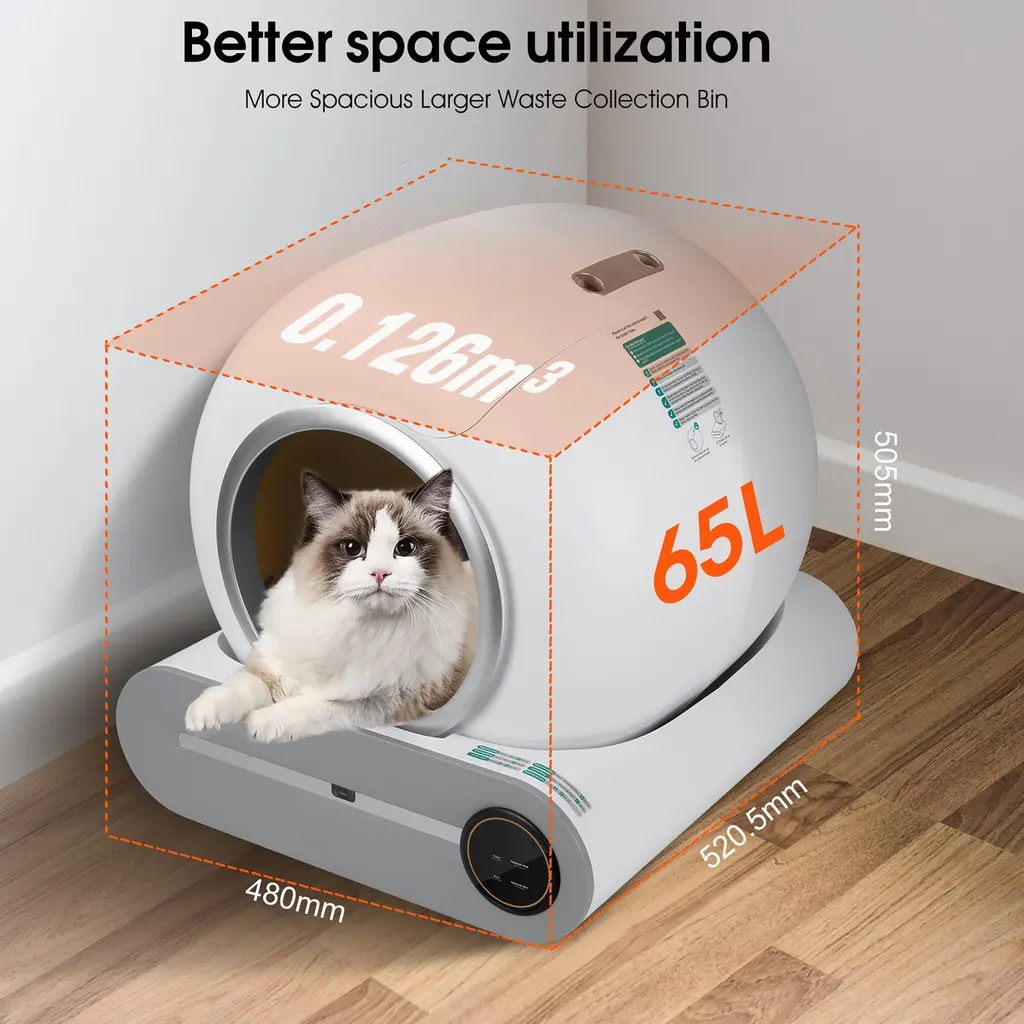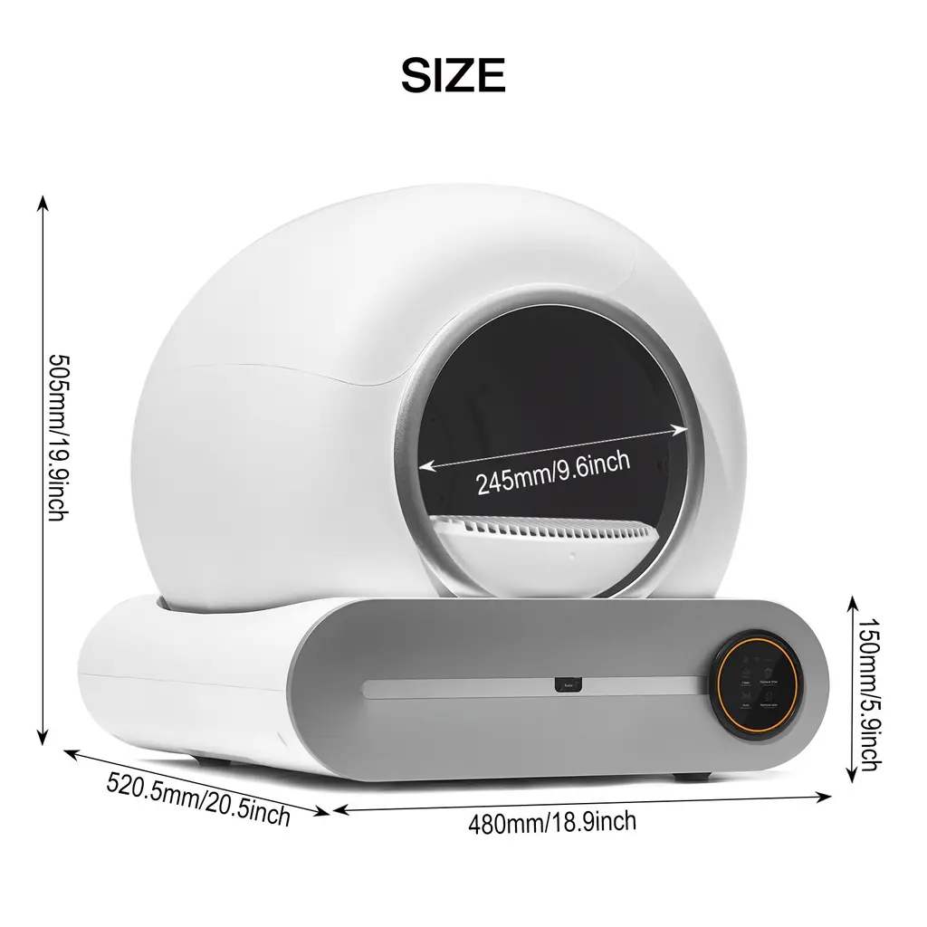 Safe for Cats:Adopts Several Safety Mechanisms to Protect Your Loving Pets. The Infrared Sensor will Stop the Box from Working Immediately when Unknown Objects or Increased Weight are Detected. A 30cm Infrared Detector Can also Shut down the Box as Soon as it Detects Cat Activity Nearby and Inside. Meanwhile, the Child Lock Size Protects Both Your Children and Pets from getting Hurt.App Control:Connect to the Network (2.4GHz Wi-Fi only). All Functions Can be Operated through Using the Device's Touch Panel or App Control. Use the App for Remote Control, Monitor the Frequency of Your Cat's Litter Box Usage. This Smart Cat Litter Box Equipped with Four Weight Sensors, Information about Your Cat's Frequency, Time, and Weight of Cat will be Updated Through the App.Better Space Utilization:This Self-Cleaning Cat Litter Box Size is 18.90*20.28* 20.47 inch and the Volume is 4.3 Cubic Feet. Providing 65L of Space and 9L of the Collection Bin and Offers a Spacious Interior for Your Cat which Weigh from 3lb to 14lb. The Large Waste Collect Container Allows up to 7 Days Free of Scooping for One Cat. Super Comfortable and Convenient.Odor Removal:It can Remove Odor by Ozone and Keep Fresh at any Time. Besides, This Automatic Cat Litter Box Works Relatively Quietly and Will not Disturb Your Daily Life. This Automatic Cat Litter Box Supports All Kinds of Clumping Cat Litter on the Market. All Parts inside the Machine Could be Disassembled for Cleaning.