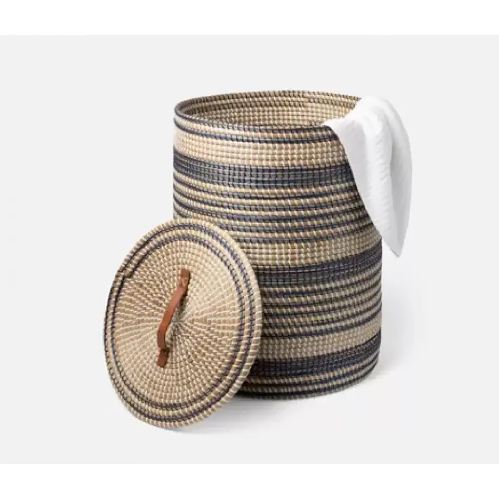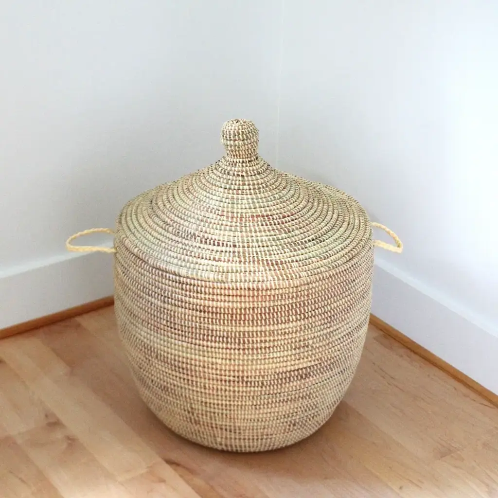 This versatile natural floor basket adds a touch of handmade global decor to any room. A perfect wide storage container, it has both practical functionality and a natural contemporary look that would look at home in practically any space. Use it as a hamper for towels in the bathroom or throw blankets in the den, toys in a kid’s room, or shoes in your entryway - its uses are endless! Wolof women in rural Senegal weave these baskets from millet grass and naturally colored plastic threads which add strength and durability.