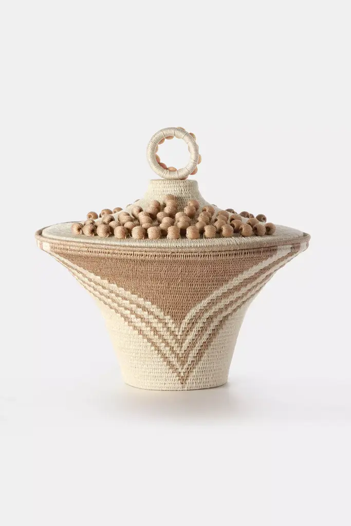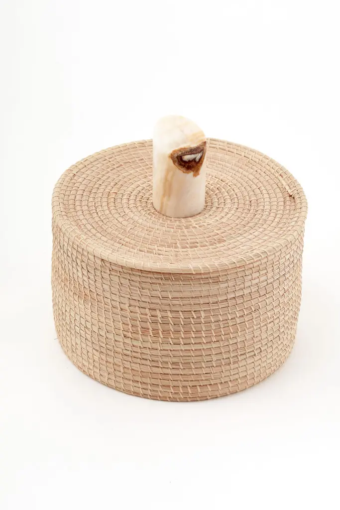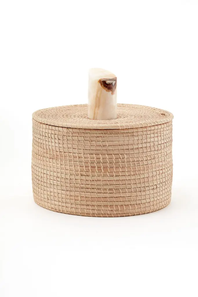 5.8" x 3.9"7.8" x 4.7"9.8" 5.5"Our Mesopotamia boxes are entirely handmade using jute and adorned with cream-colored onyx stone details. These boxes serve as both functional storage containers and decorative objects. Their main purpose is to enhance any environment they are placed in. They are available in three different sizes.Our pieces are made by hand. One of a kind.