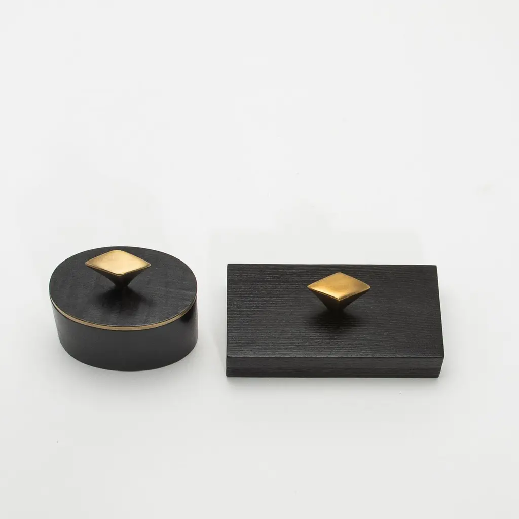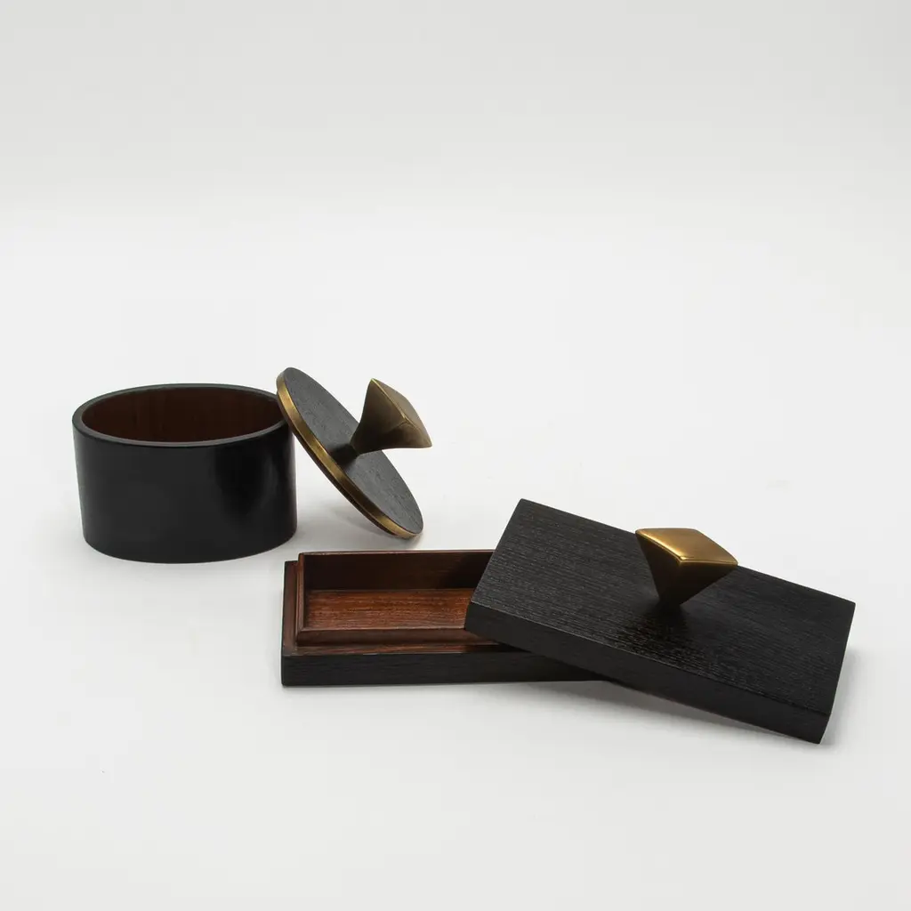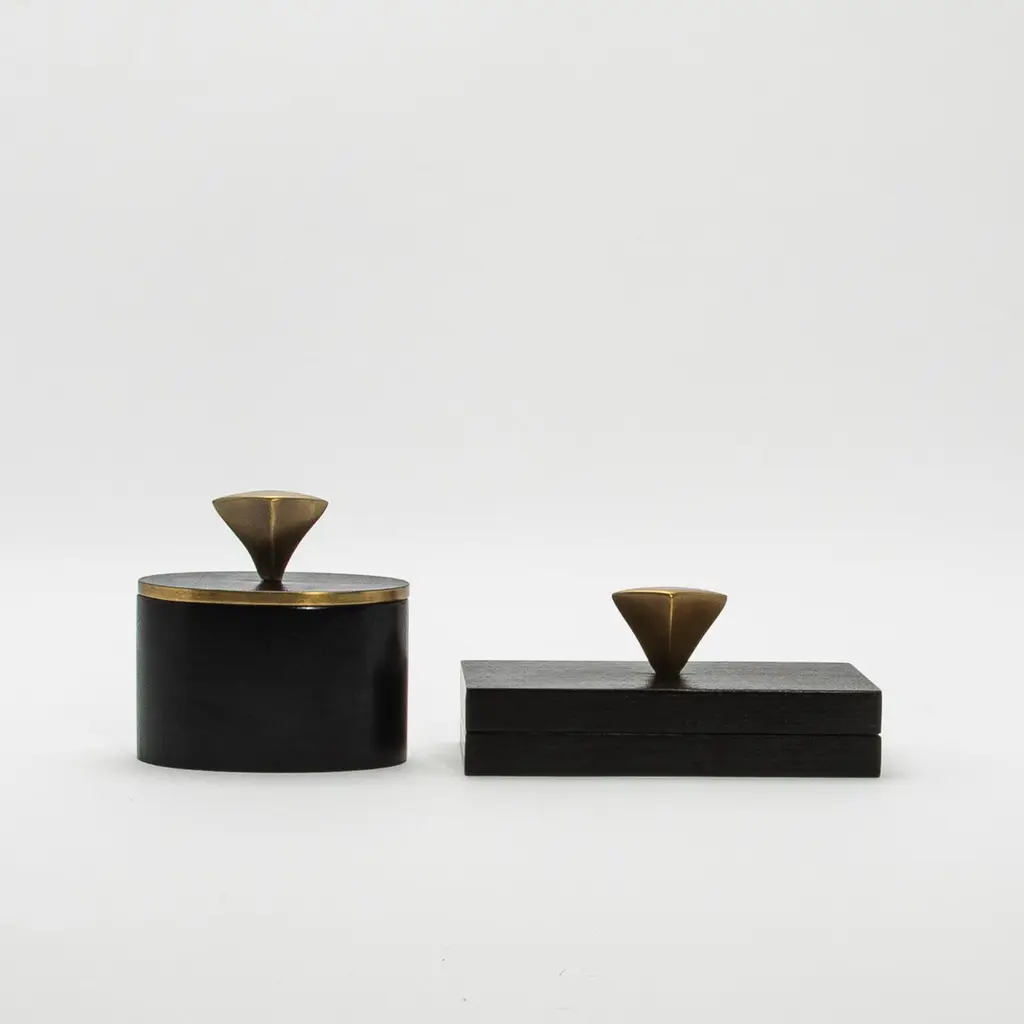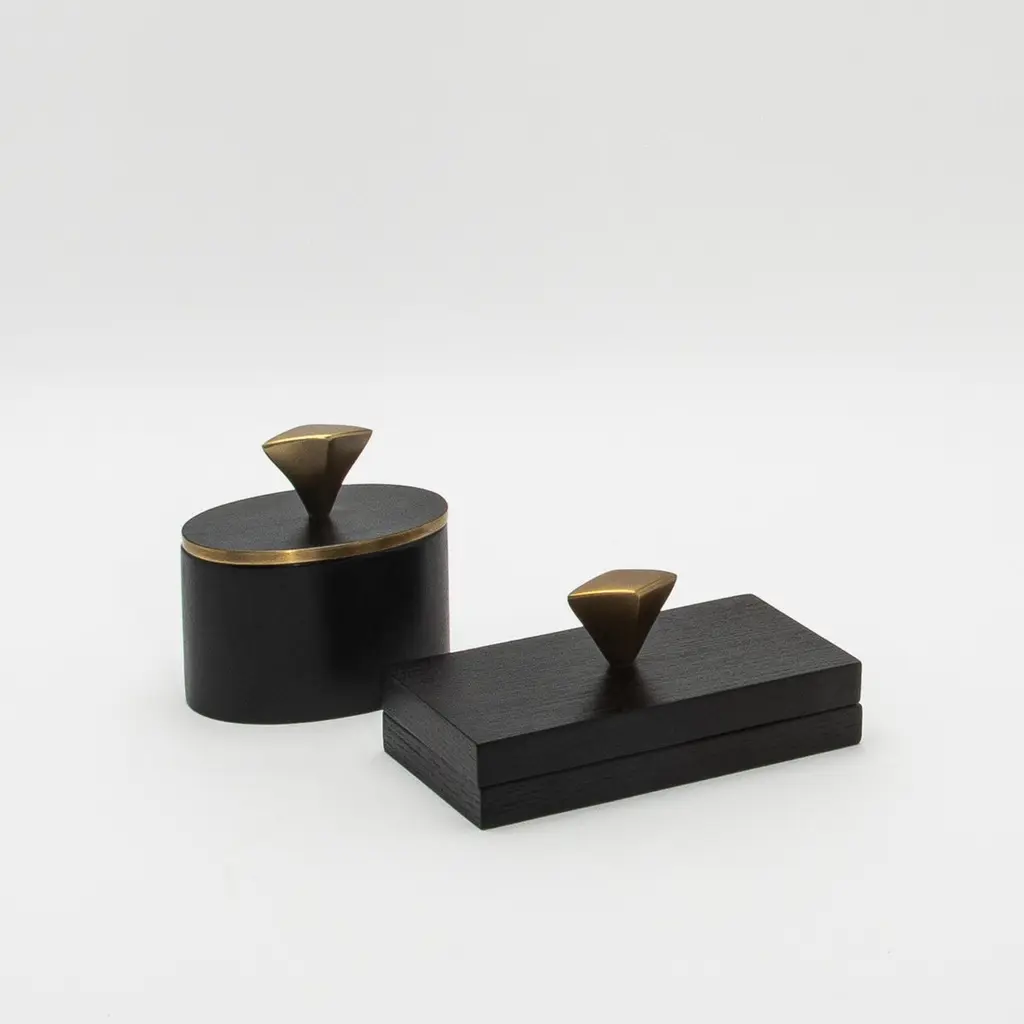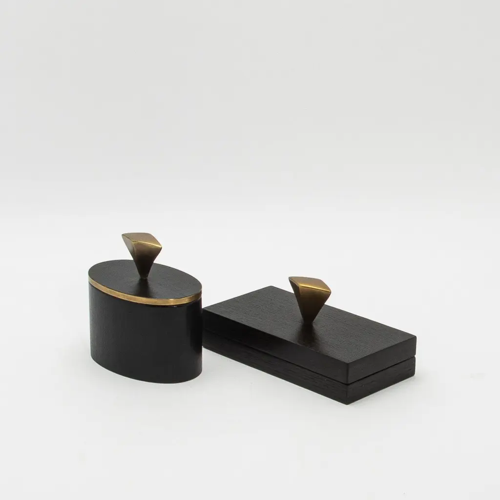 This exquisite set of two boxes in black oak offers a sophisticated and modern touch to any decor. Each box, one oval and one rectangular, is carefully crafted from rich black oak, boasting a natural wood texture that exudes timeless elegance. Topped with an iconic bronze patina brass knob, these boxes bring a harmonious balance between organic materials and refined luxury. The subtle grain of the oak combined with the brushed brass accents adds depth and visual interest to these artful storage pieces, making them a statement of understated luxury. Ideal for storing small treasures, these boxes are as functional as they are beautiful, offering an artisanal touch to any luxurious living space.Oval: 5.25” x 4.25” x 5.75”Rectangle: 8” x 4” x 3.5”These boxes are available in other finishes.This item is on display in our LA showroomKeep away from direct sunlightColor variants may occur on the stingray and other exotic finishesClean with soft dry clothAbout KIFU PARIS:Kifu Augousti is an up-and-coming creator of modern furnishings, celebrated for her ability to blend the timeless elegance of the Art Deco tradition with a bold, contemporary flair. The daughter of renowned designers Ria and Yiouri Augousti, known as R&Y Augousti, Kifu has inherited a rich legacy while carving out her own distinctive style. Offbeat materials, sinuous curves, and wild patterns have become the hallmarks of her designs, cultivated from her early years in Paris to her current creative haven in Manila.Each piece in Kifu’s collection, whether furniture or accessories, is meticulously handcrafted by the finest artisans in the Philippines. These artisans, known for their unparalleled expertise, use only the best natural materials and apply intricate, hand-painted techniques, ensuring every item is a masterpiece. Available in exclusive showrooms in Paris, New York, and Los Angeles at the Pacific Design Center's MOGUL, her creations—ranging from sculptural benches with commanding bronze frames to exquisitely detailed boxes, trays and vases—are not just furnishings, but timeless treasures that represent the pinnacle of luxury and innovative design.