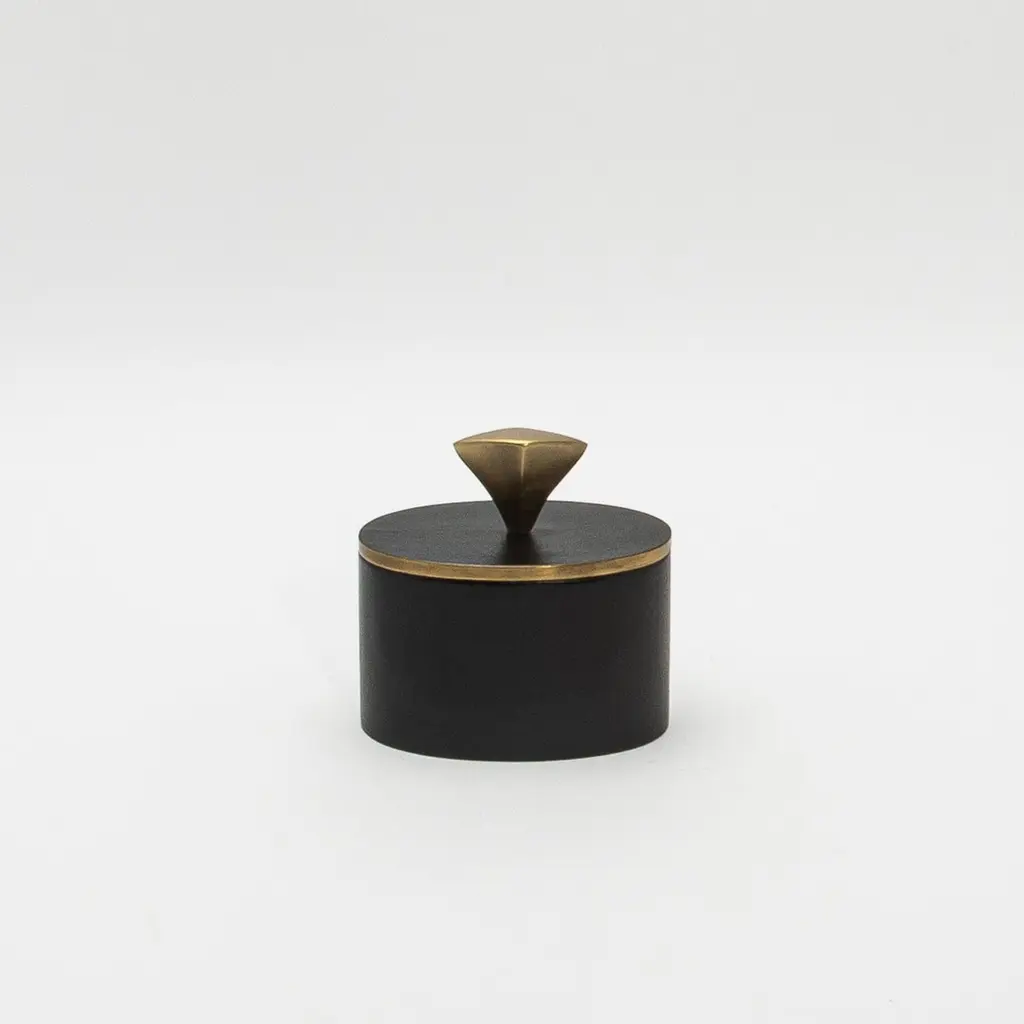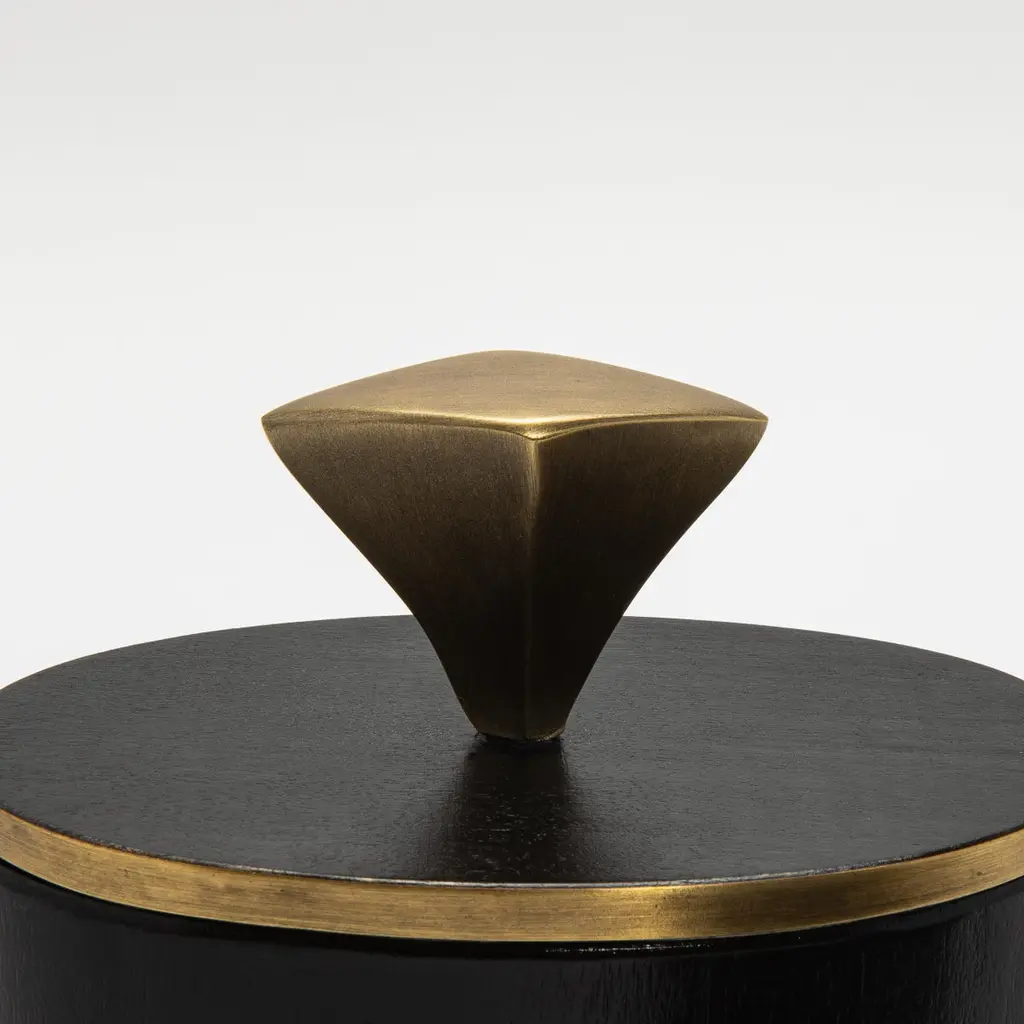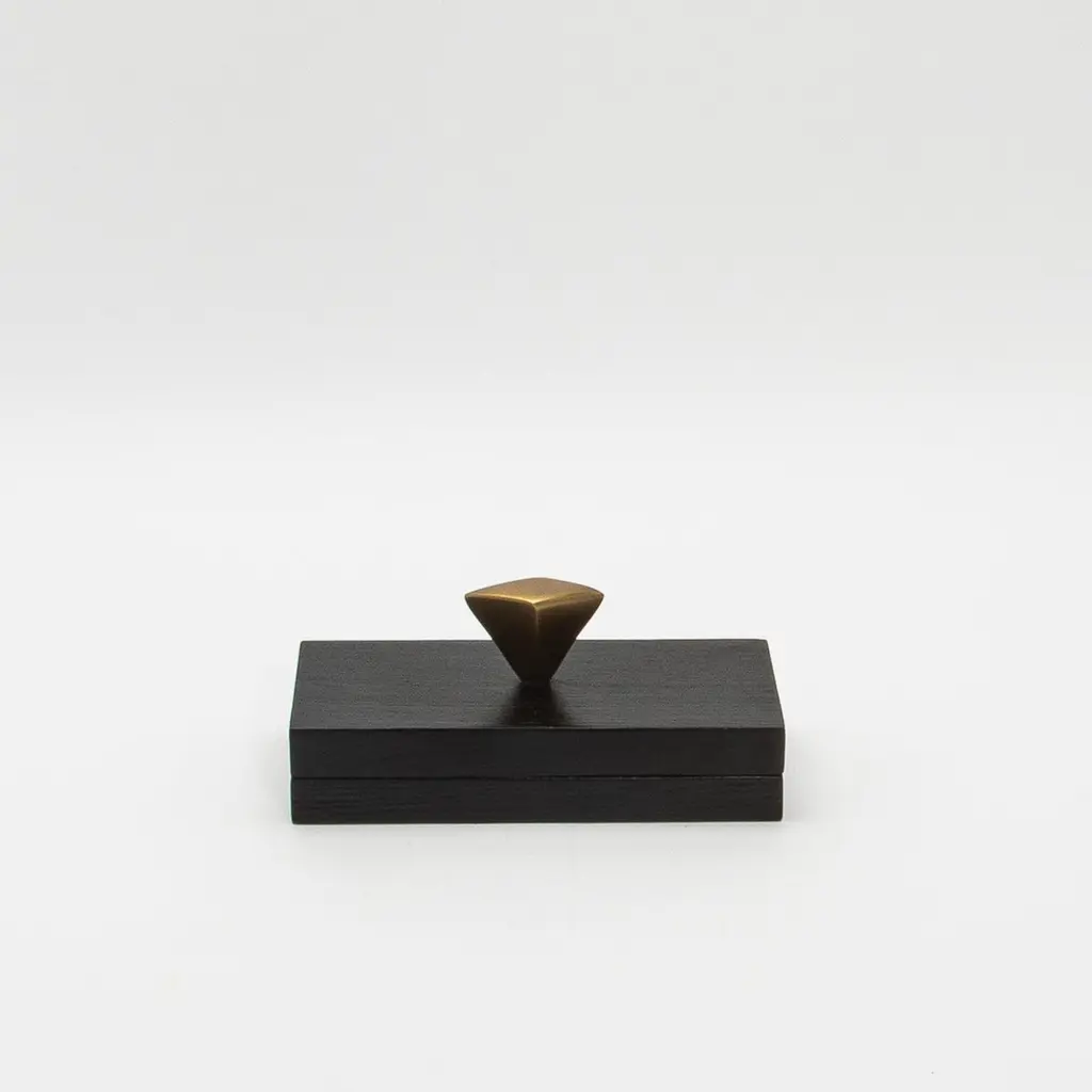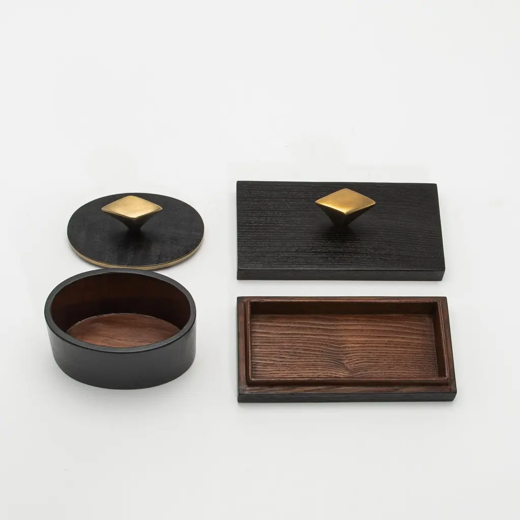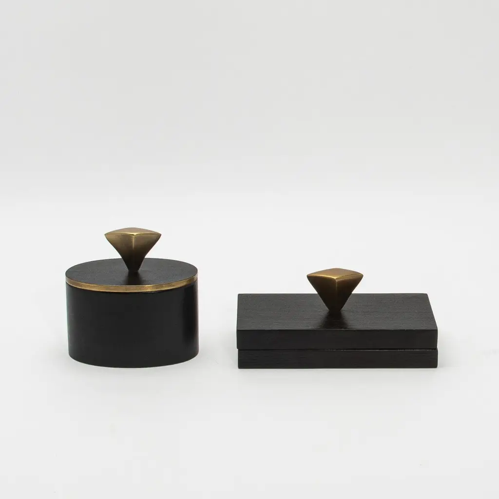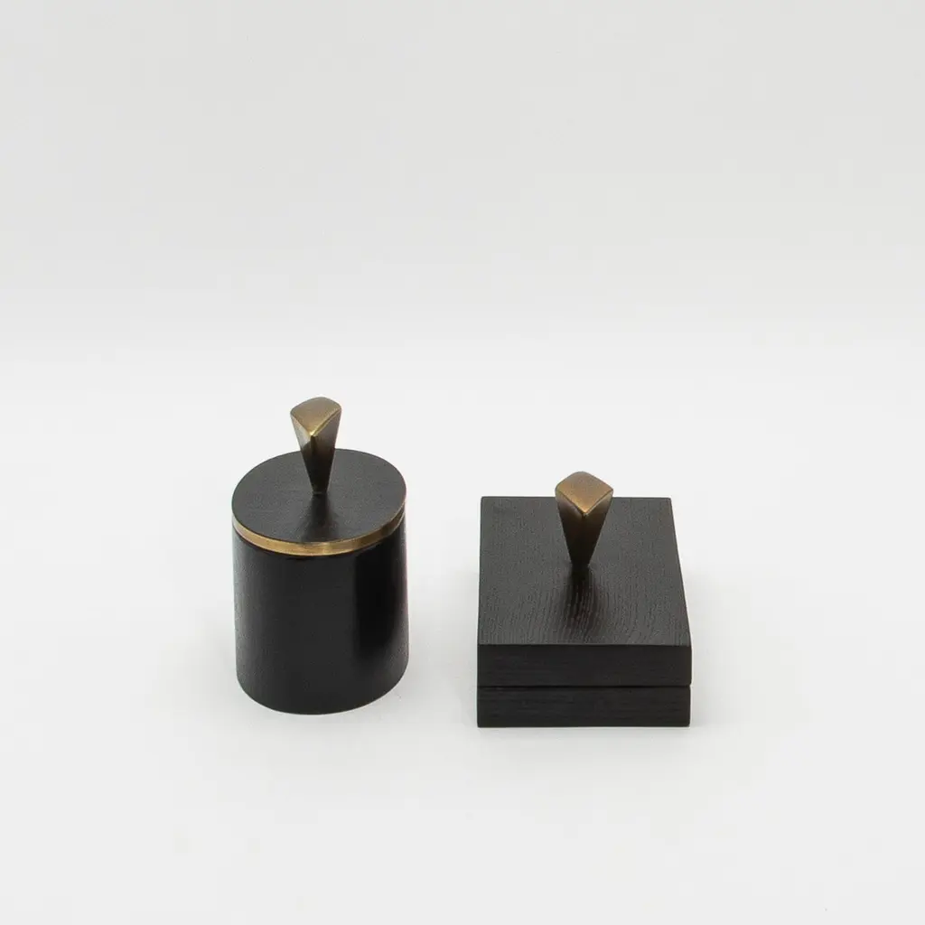This exquisite set of two boxes in black oak offers a sophisticated and modern touch to any decor. Each box, one oval and one rectangular, is carefully crafted from rich black oak, boasting a natural wood texture that exudes timeless elegance. Topped with an iconic bronze patina brass knob, these boxes bring a harmonious balance between organic materials and refined luxury. The subtle grain of the oak combined with the brushed brass accents adds depth and visual interest to these artful storage pieces, making them a statement of understated luxury. Ideal for storing small treasures, these boxes are as functional as they are beautiful, offering an artisanal touch to any luxurious living space.Oval: 5.25” x 4.25” x 5.75”Rectangle: 8” x 4” x 3.5”These boxes are available in other finishes.This item is on display in our LA showroomKeep away from direct sunlightColor variants may occur on the stingray and other exotic finishesClean with soft dry clothAbout KIFU PARIS:Kifu Augousti is an up-and-coming creator of modern furnishings, celebrated for her ability to blend the timeless elegance of the Art Deco tradition with a bold, contemporary flair. The daughter of renowned designers Ria and Yiouri Augousti, known as R&Y Augousti, Kifu has inherited a rich legacy while carving out her own distinctive style. Offbeat materials, sinuous curves, and wild patterns have become the hallmarks of her designs, cultivated from her early years in Paris to her current creative haven in Manila.Each piece in Kifu’s collection, whether furniture or accessories, is meticulously handcrafted by the finest artisans in the Philippines. These artisans, known for their unparalleled expertise, use only the best natural materials and apply intricate, hand-painted techniques, ensuring every item is a masterpiece. Available in exclusive showrooms in Paris, New York, and Los Angeles at the Pacific Design Center's MOGUL, her creations—ranging from sculptural benches with commanding bronze frames to exquisitely detailed boxes, trays and vases—are not just furnishings, but timeless treasures that represent the pinnacle of luxury and innovative design.