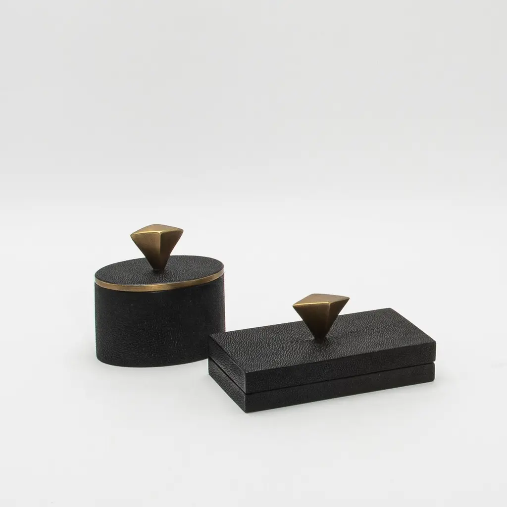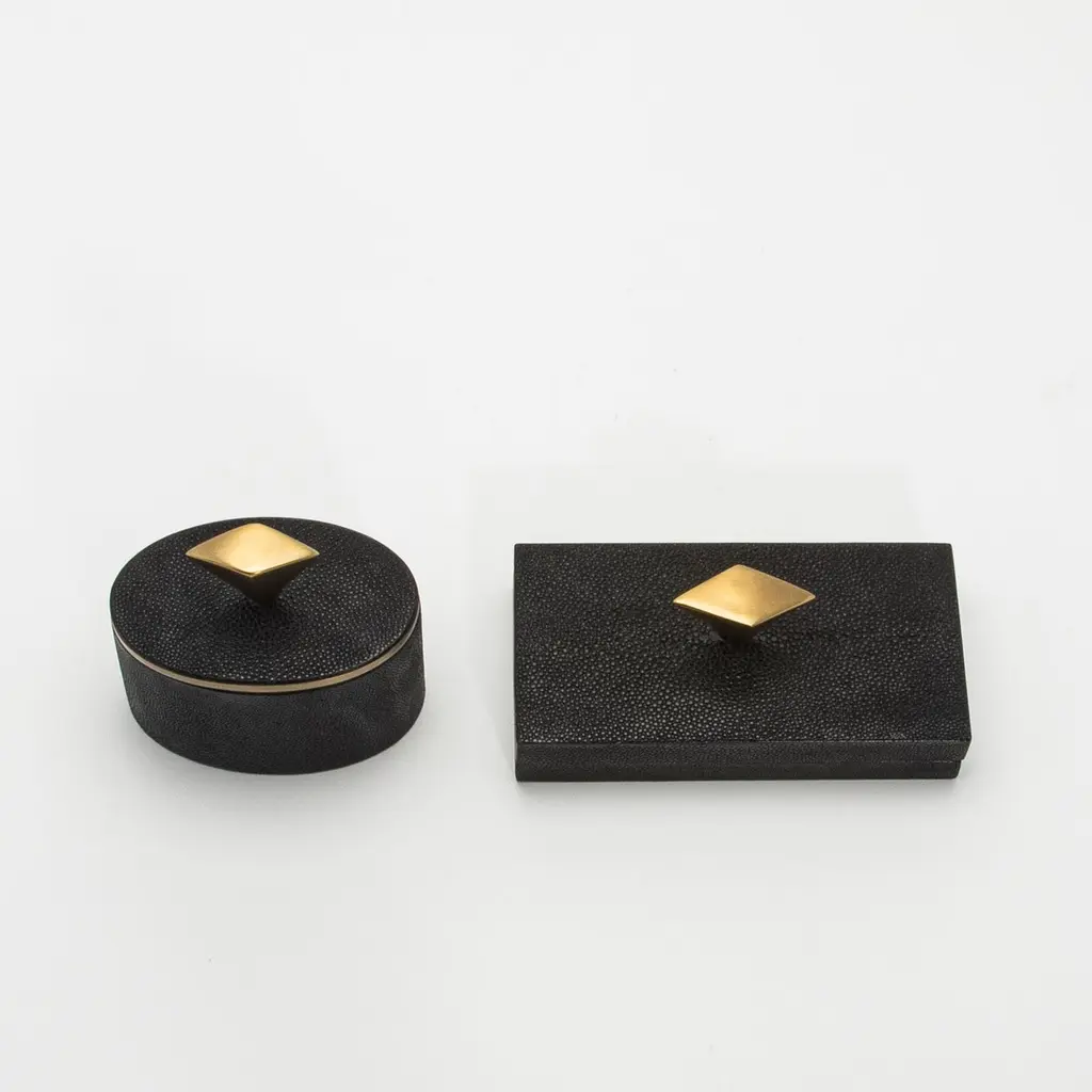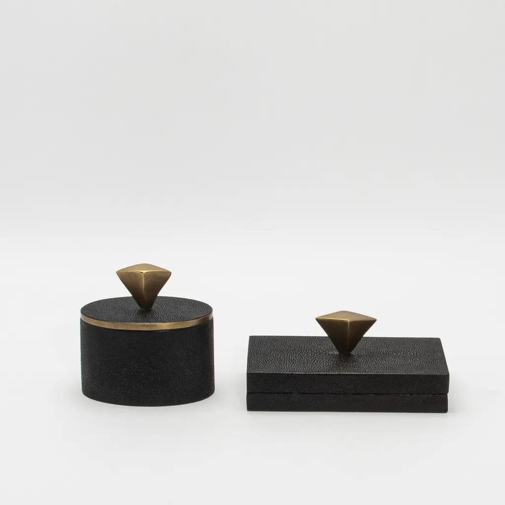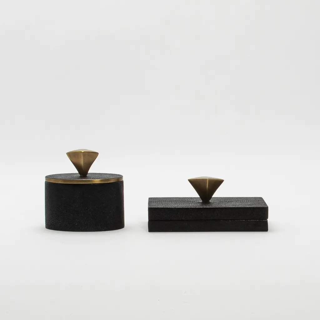 This exquisite set of two boxes by Kifu Paris showcases the luxurious craftsmanship and meticulous attention to detail that the brand is renowned for. Handcrafted in black shagreen, the oval and rectangular boxes present a refined, tactile texture that exudes a quiet sophistication. The organic beauty of the shagreen, with its distinctive pebble-like surface, is perfectly complemented by the brushed bronze patina brass knob—a sculptural element that adds a bold, modern accent to the timeless design. The interior of each box is lined with rich wood veneer, creating a warm contrast and offering a perfect balance between beauty and functionality. Ideal as decorative accents or elegant storage solutions, these boxes bring an elevated touch of luxury to any space.Oval: 5.25” x 4.25” x 5.75”Rectangle: 8” x 4” x 3.5”These boxes are available in other finishes.This item is on display in our LA showroomKeep away from direct sunlightColor variants may occur on the stingray and other exotic finishesClean with soft dry clothAbout KIFU PARIS:Kifu Augousti is an up-and-coming creator of modern furnishings, celebrated for her ability to blend the timeless elegance of the Art Deco tradition with a bold, contemporary flair. The daughter of renowned designers Ria and Yiouri Augousti, known as R&Y Augousti, Kifu has inherited a rich legacy while carving out her own distinctive style. Offbeat materials, sinuous curves, and wild patterns have become the hallmarks of her designs, cultivated from her early years in Paris to her current creative haven in Manila.Each piece in Kifu’s collection, whether furniture or accessories, is meticulously handcrafted by the finest artisans in the Philippines. These artisans, known for their unparalleled expertise, use only the best natural materials and apply intricate, hand-painted techniques, ensuring every item is a masterpiece. Available in exclusive showrooms in Paris, New York, and Los Angeles at the Pacific Design Center's MOGUL, her creations—ranging from sculptural benches with commanding bronze frames to exquisitely detailed boxes, trays and vases—are not just furnishings, but timeless treasures that represent the pinnacle of luxury and innovative design.