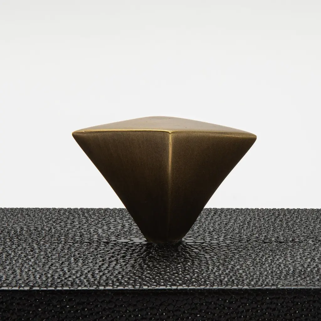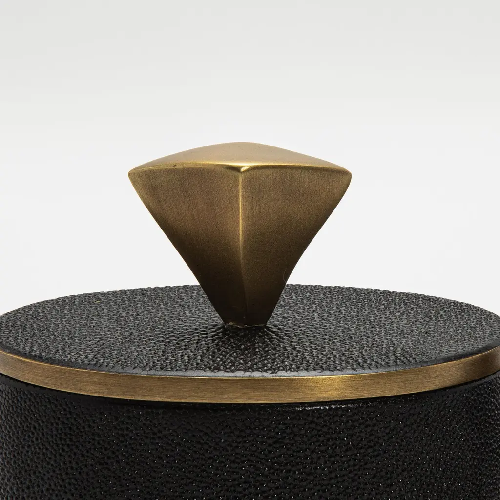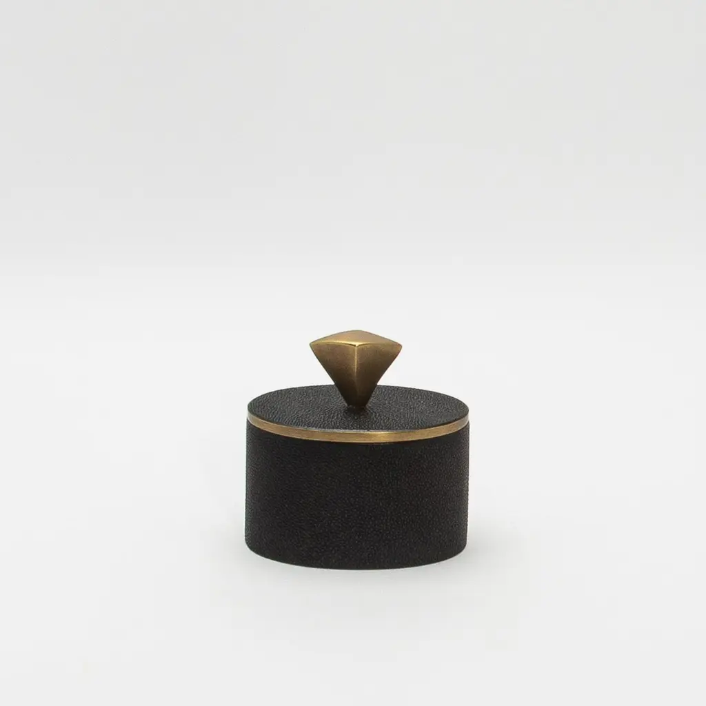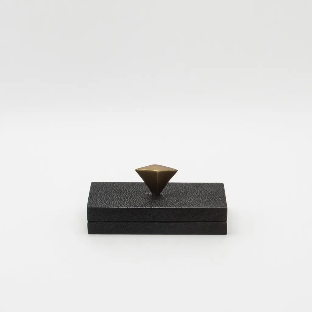 This exquisite set of two boxes by Kifu Paris showcases the luxurious craftsmanship and meticulous attention to detail that the brand is renowned for. Handcrafted in black shagreen, the oval and rectangular boxes present a refined, tactile texture that exudes a quiet sophistication. The organic beauty of the shagreen, with its distinctive pebble-like surface, is perfectly complemented by the brushed bronze patina brass knob—a sculptural element that adds a bold, modern accent to the timeless design. The interior of each box is lined with rich wood veneer, creating a warm contrast and offering a perfect balance between beauty and functionality. Ideal as decorative accents or elegant storage solutions, these boxes bring an elevated touch of luxury to any space.Oval: 5.25” x 4.25” x 5.75”Rectangle: 8” x 4” x 3.5”These boxes are available in other finishes.This item is on display in our LA showroomKeep away from direct sunlightColor variants may occur on the stingray and other exotic finishesClean with soft dry clothAbout KIFU PARIS:Kifu Augousti is an up-and-coming creator of modern furnishings, celebrated for her ability to blend the timeless elegance of the Art Deco tradition with a bold, contemporary flair. The daughter of renowned designers Ria and Yiouri Augousti, known as R&Y Augousti, Kifu has inherited a rich legacy while carving out her own distinctive style. Offbeat materials, sinuous curves, and wild patterns have become the hallmarks of her designs, cultivated from her early years in Paris to her current creative haven in Manila.Each piece in Kifu’s collection, whether furniture or accessories, is meticulously handcrafted by the finest artisans in the Philippines. These artisans, known for their unparalleled expertise, use only the best natural materials and apply intricate, hand-painted techniques, ensuring every item is a masterpiece. Available in exclusive showrooms in Paris, New York, and Los Angeles at the Pacific Design Center's MOGUL, her creations—ranging from sculptural benches with commanding bronze frames to exquisitely detailed boxes, trays and vases—are not just furnishings, but timeless treasures that represent the pinnacle of luxury and innovative design.