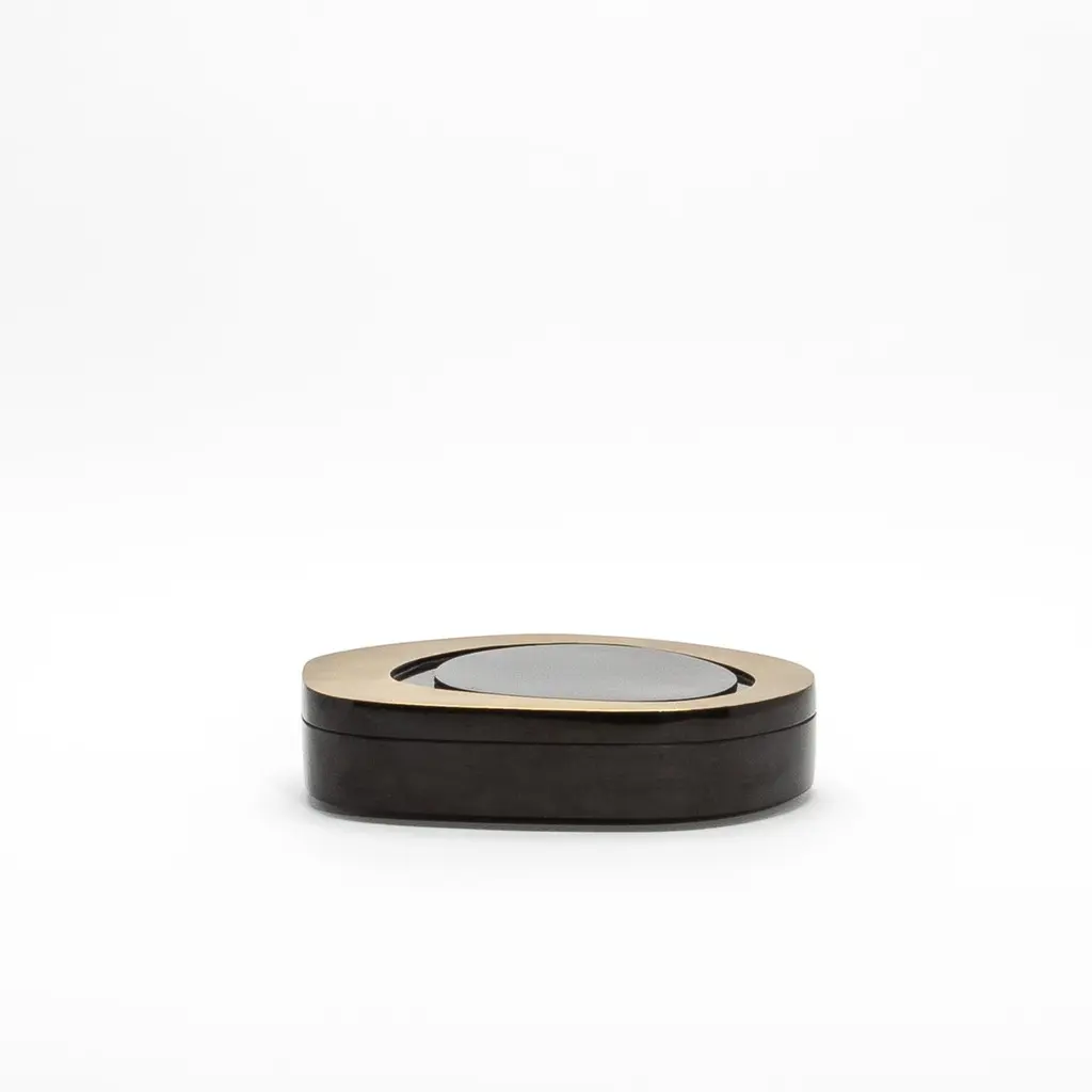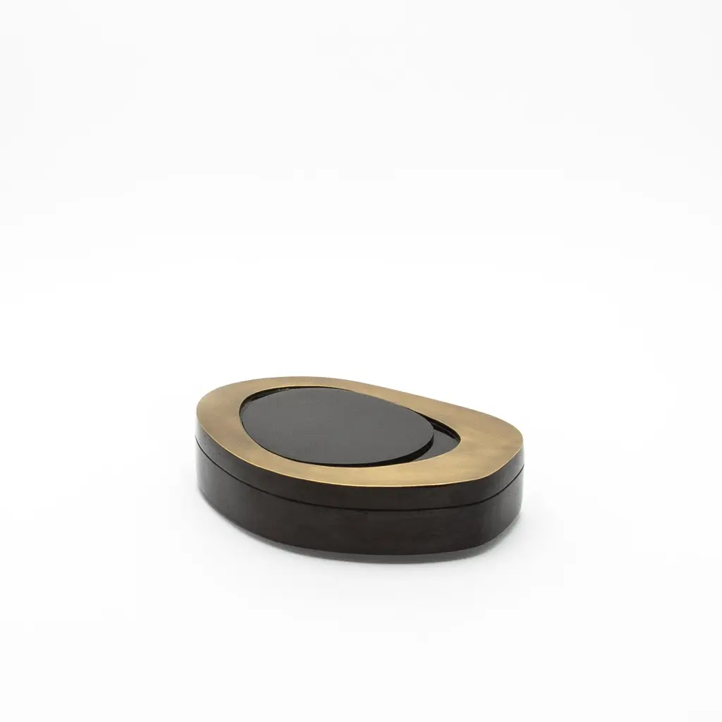 The “Peacock Box” set by R&Y Augousti is a true masterpiece of modern luxury, where organic form meets exceptional craftsmanship. The distinctive, fluid shapes of these boxes create an elegant asymmetry that adds visual intrigue to any space. Wrapped in sumptuous black shell, the rich texture offers a tactile experience that enhances the design's opulence, while the bronze patina brass framing delicately outlines the contours, adding a touch of warmth and refinement. Crafted from wood and meticulously hand-finished, these boxes seamlessly blend form and function, elevating their role from mere storage pieces to objets d'art. Perfect for the discerning collector, the Peacock Box set embodies timeless sophistication and artisanal luxury.Medium: 8.75 x 8.75 x 2.25 Large: 10 x 6.5 x 2.25 These boxes are available and in stock in different finishes and can be purchased as a set in individually. Please contact us through the message center.This item is on display in our LA showroomColor variants may occur on the stingray and other exotic finishesClean with soft dry clothAbout R&Y AUGOUSTI:R&Y Augousti, created by the visionary husband-and-wife duo Ria and Yiouri Augousti, epitomizes the pinnacle of luxurious, globally inspired design. Since its inception in Paris in 1989, the brand has become synonymous with opulence, distinguishing itself through the masterful integration of shagreen with brass and other exotic materials. Each piece in their Art Deco-inspired collection is a testament to unparalleled craftsmanship, meticulously handcrafted by the finest artisans in the Philippines, ensuring that every creation is a unique masterpiece.Ria, hailing from Manila, and Yiouri, from Cyprus, share an exquisite passion for revivalist design, which has propelled R&Y Augousti to the forefront of luxury interiors. Their innovative use of materials, particularly the revival of shagreen, has set new standards in elegance and sophistication. The natural color variations on stingray and other exotic finishes further enhance the authenticity and bespoke nature of their designs.Today, R&Y Augousti’s collections grace the most exclusive showrooms in Paris, New York, and Los Angeles at the Pacific Design Center's MOGUL, continuing to redefine the essence of timeless luxury. Their work is not merely furniture; it is a celebration of art, craftsmanship, and the ultimate in refined living.