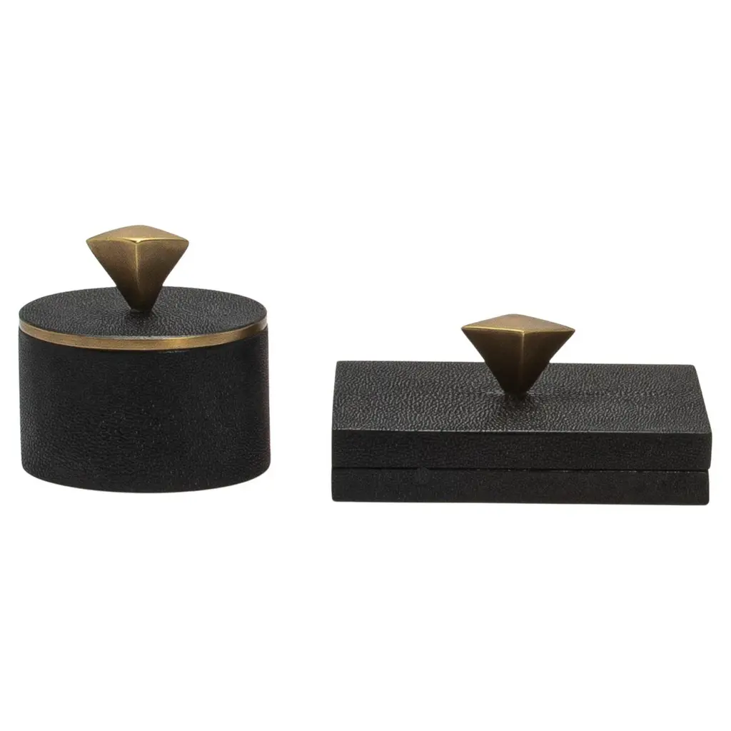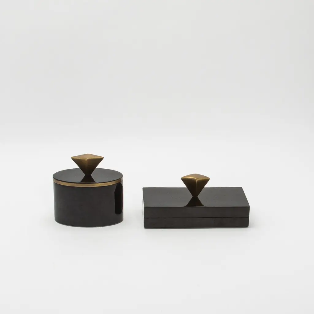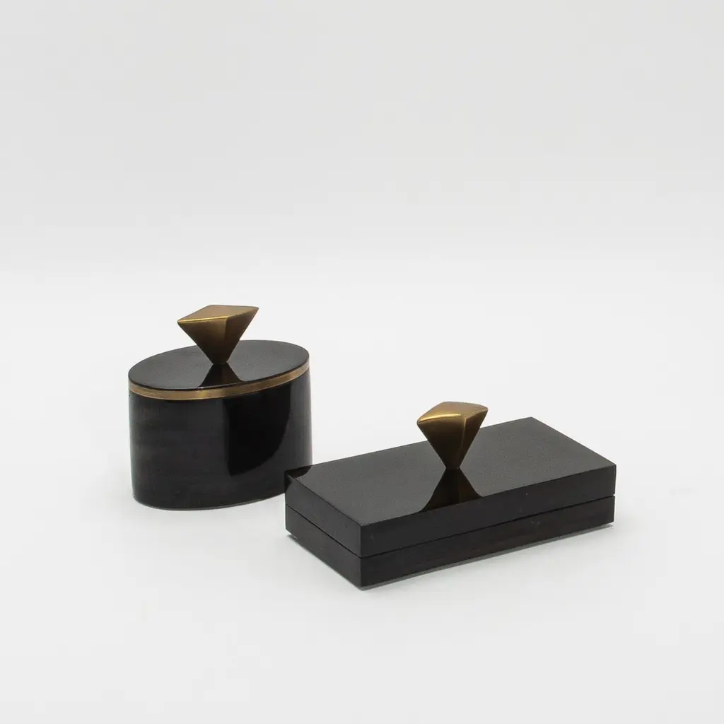 This stunning set of two boxes by Kifu Paris, crafted from luxurious black pen shell, is a masterpiece of opulence and sophistication. The natural iridescence of the pen shell, with its subtle yet captivating reflective surface, enhances the timeless elegance of the design. The set includes an oval and rectangular box, both adorned with sculptural knobs in brushed bronze patina brass, creating a harmonious blend of organic materials and modern luxury. The warm wood veneer lining inside each box adds a touch of richness and functionality, offering an ideal storage solution that doesn’t compromise on aesthetic appeal. Perfect as an accent to elevate any sophisticated interior, these handcrafted pieces are a celebration of natural beauty and meticulous craftsmanship.Oval: 5.25” x 4.25” x 5.75”Rectangle: 8” x 4” x 3.5”These boxes are available in other finishes.This item is on display in our LA showroomKeep away from direct sunlightColor variants may occur on the stingray and other exotic finishesClean with soft dry clothAbout KIFU PARIS:Kifu Augousti is an up-and-coming creator of modern furnishings, celebrated for her ability to blend the timeless elegance of the Art Deco tradition with a bold, contemporary flair. The daughter of renowned designers Ria and Yiouri Augousti, known as R&Y Augousti, Kifu has inherited a rich legacy while carving out her own distinctive style. Offbeat materials, sinuous curves, and wild patterns have become the hallmarks of her designs, cultivated from her early years in Paris to her current creative haven in Manila.Each piece in Kifu’s collection, whether furniture or accessories, is meticulously handcrafted by the finest artisans in the Philippines. These artisans, known for their unparalleled expertise, use only the best natural materials and apply intricate, hand-painted techniques, ensuring every item is a masterpiece. Available in exclusive showrooms in Paris, New York, and Los Angeles at the Pacific Design Center's MOGUL, her creations—ranging from sculptural benches with commanding bronze frames to exquisitely detailed boxes, trays and vases—are not just furnishings, but timeless treasures that represent the pinnacle of luxury and innovative design.