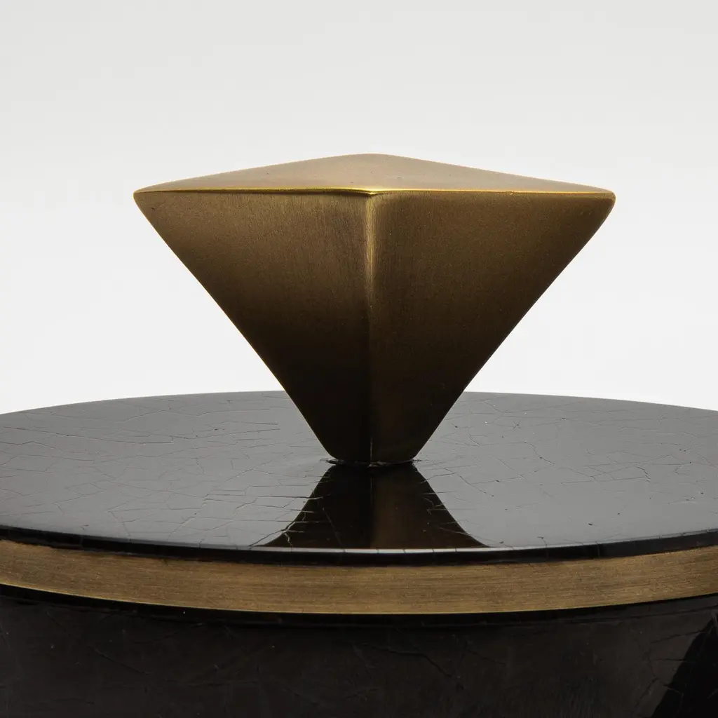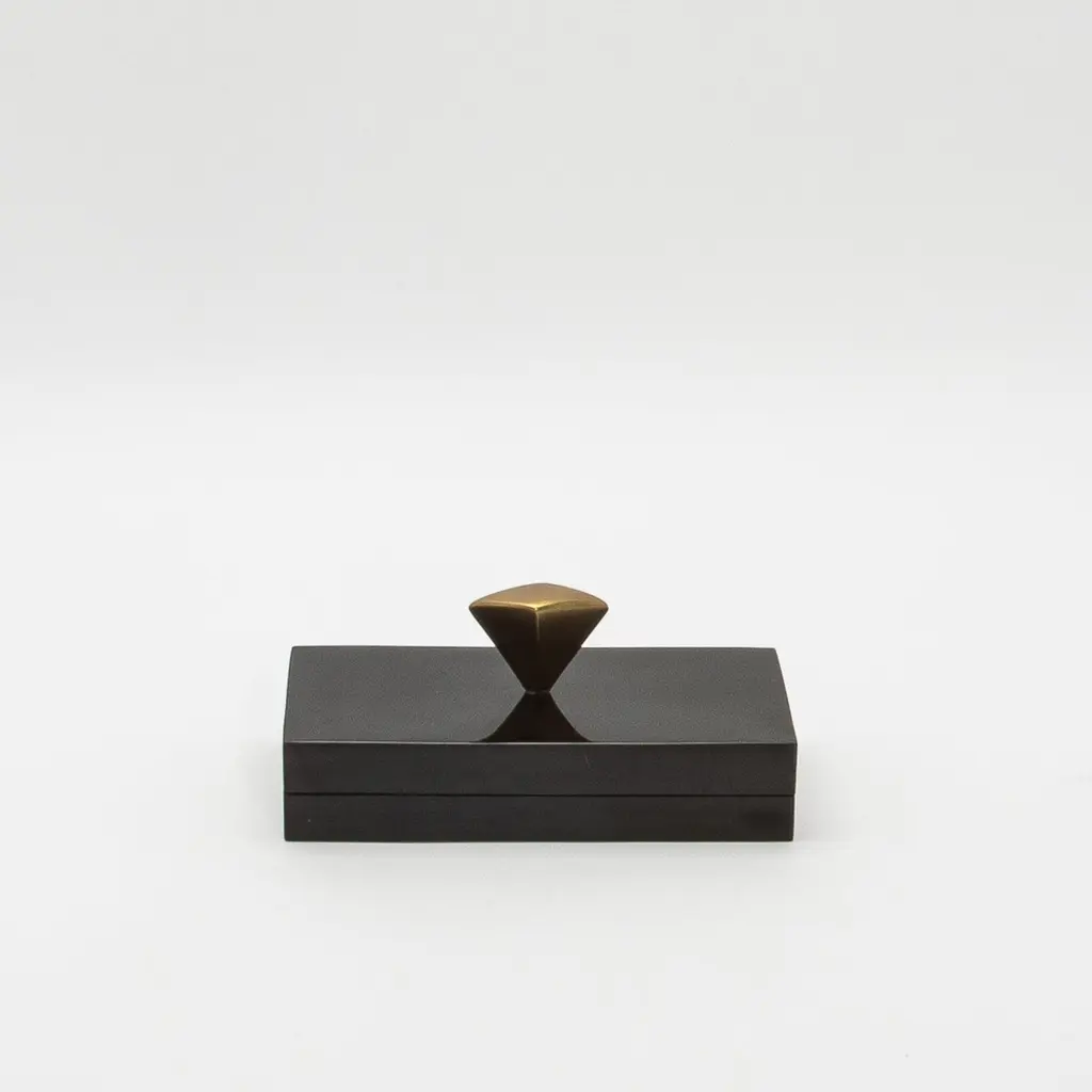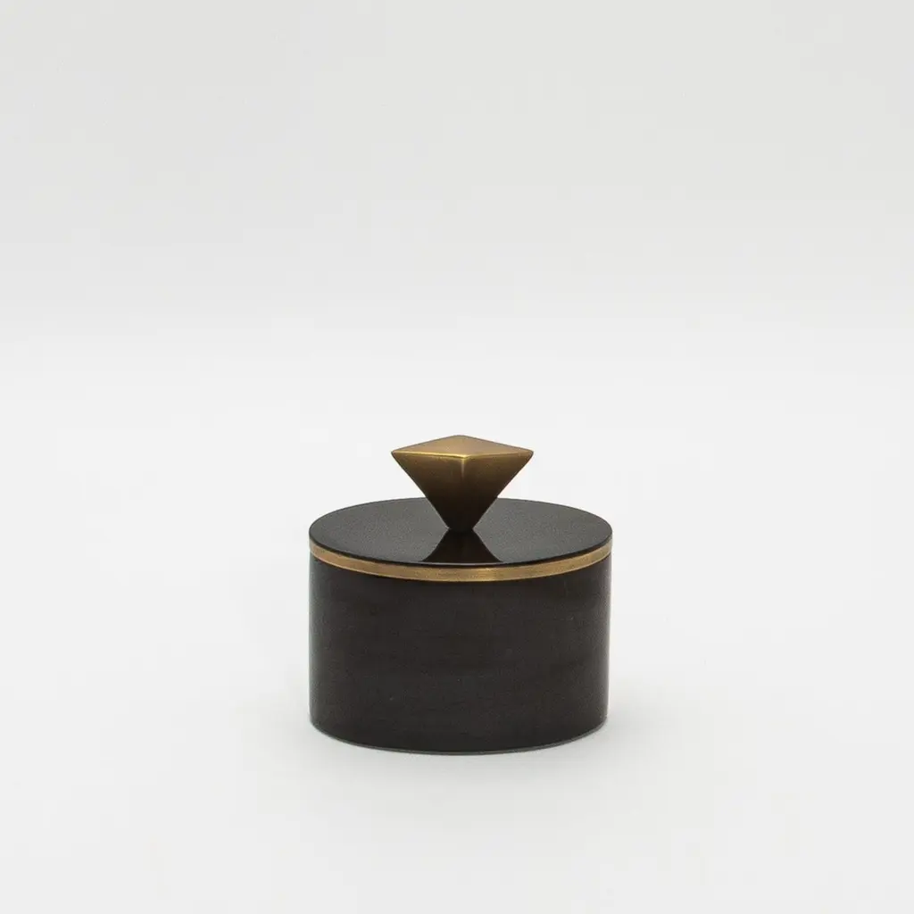 This stunning set of two boxes by Kifu Paris, crafted from luxurious black pen shell, is a masterpiece of opulence and sophistication. The natural iridescence of the pen shell, with its subtle yet captivating reflective surface, enhances the timeless elegance of the design. The set includes an oval and rectangular box, both adorned with sculptural knobs in brushed bronze patina brass, creating a harmonious blend of organic materials and modern luxury. The warm wood veneer lining inside each box adds a touch of richness and functionality, offering an ideal storage solution that doesn’t compromise on aesthetic appeal. Perfect as an accent to elevate any sophisticated interior, these handcrafted pieces are a celebration of natural beauty and meticulous craftsmanship.Oval: 5.25” x 4.25” x 5.75”Rectangle: 8” x 4” x 3.5”These boxes are available in other finishes.This item is on display in our LA showroomKeep away from direct sunlightColor variants may occur on the stingray and other exotic finishesClean with soft dry clothAbout KIFU PARIS:Kifu Augousti is an up-and-coming creator of modern furnishings, celebrated for her ability to blend the timeless elegance of the Art Deco tradition with a bold, contemporary flair. The daughter of renowned designers Ria and Yiouri Augousti, known as R&Y Augousti, Kifu has inherited a rich legacy while carving out her own distinctive style. Offbeat materials, sinuous curves, and wild patterns have become the hallmarks of her designs, cultivated from her early years in Paris to her current creative haven in Manila.Each piece in Kifu’s collection, whether furniture or accessories, is meticulously handcrafted by the finest artisans in the Philippines. These artisans, known for their unparalleled expertise, use only the best natural materials and apply intricate, hand-painted techniques, ensuring every item is a masterpiece. Available in exclusive showrooms in Paris, New York, and Los Angeles at the Pacific Design Center's MOGUL, her creations—ranging from sculptural benches with commanding bronze frames to exquisitely detailed boxes, trays and vases—are not just furnishings, but timeless treasures that represent the pinnacle of luxury and innovative design.