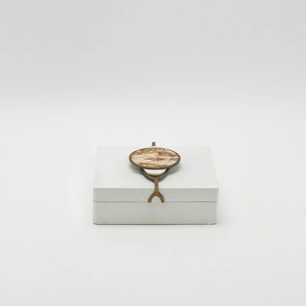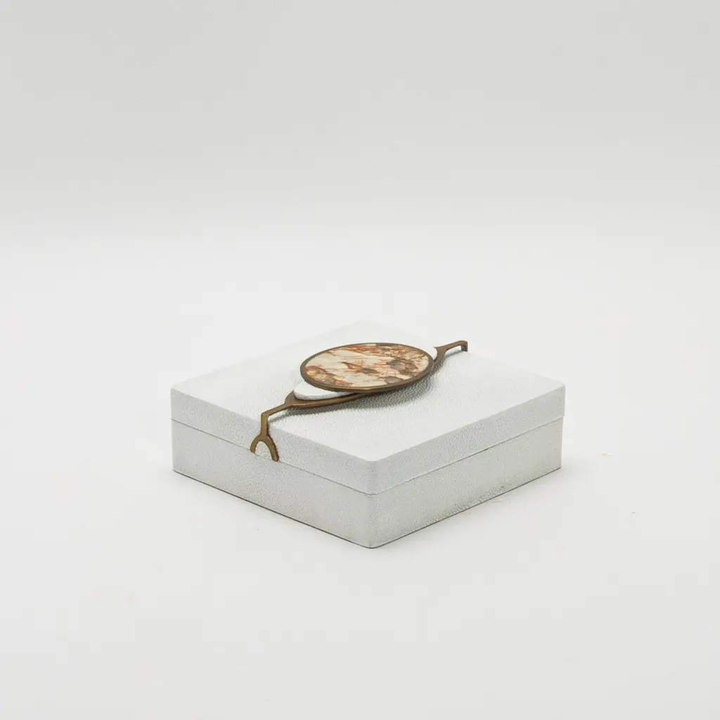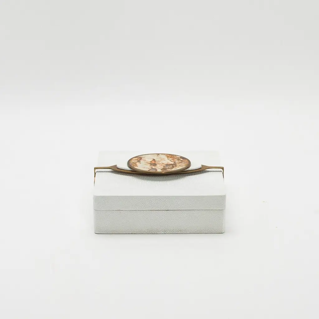 The "Victoria" Box Set by Kifu Paris exudes luxury and craftsmanship, featuring two exquisite boxes in black shagreen, each adorned with bronze patina brass accents and a striking semi-precious stone handle. The harmonious pairing of a rectangular and a square box showcases a refined contrast between the textured shagreen surfaces and the smooth, gleaming semi-precious stone inserts, creating a captivating visual experience. Each piece in the set is meticulously handcrafted, emphasizing the natural richness of the materials and the precision of its design. This elegant duo elevates any space, blending functionality with opulence, making it a sophisticated choice for those who appreciate the finest in artisanal design.RECTANGLE: 8.66” X 5.11” X 2.95" SQUARE: 7” X 7” X 2.95" These boxes are available and in stock in different finishes (black shagreen, white shagreen, black shell, black oak, white oak) and can be purchased as a set in individually. Please contact us through the message center.This item is on display in our LA showroomKeep away from direct sunlightColor variants may occur on the stingray and other exotic finishesClean with soft dry clothAbout KIFU PARIS:Kifu Augousti is an up-and-coming creator of modern furnishings, celebrated for her ability to blend the timeless elegance of the Art Deco tradition with a bold, contemporary flair. The daughter of renowned designers Ria and Yiouri Augousti, known as R&Y Augousti, Kifu has inherited a rich legacy while carving out her own distinctive style. Offbeat materials, sinuous curves, and wild patterns have become the hallmarks of her designs, cultivated from her early years in Paris to her current creative haven in Manila.Each piece in Kifu’s collection, whether furniture or accessories, is meticulously handcrafted by the finest artisans in the Philippines. These artisans, known for their unparalleled expertise, use only the best natural materials and apply intricate, hand-painted techniques, ensuring every item is a masterpiece. Available in exclusive showrooms in Paris, New York, and Los Angeles at the Pacific Design Center's MOGUL, her creations—ranging from sculptural benches with commanding bronze frames to exquisitely detailed boxes, trays and vases—are not just furnishings, but timeless treasures that represent the pinnacle of luxury and innovative design.