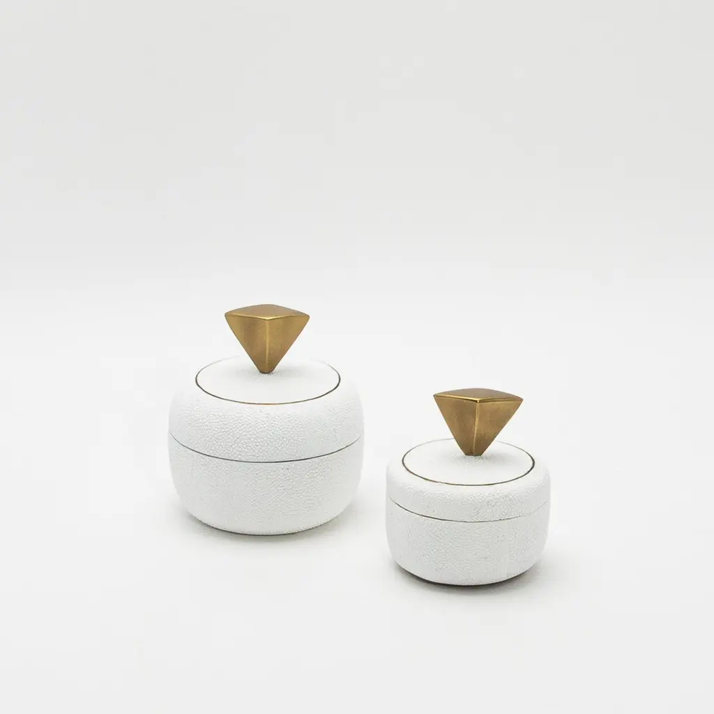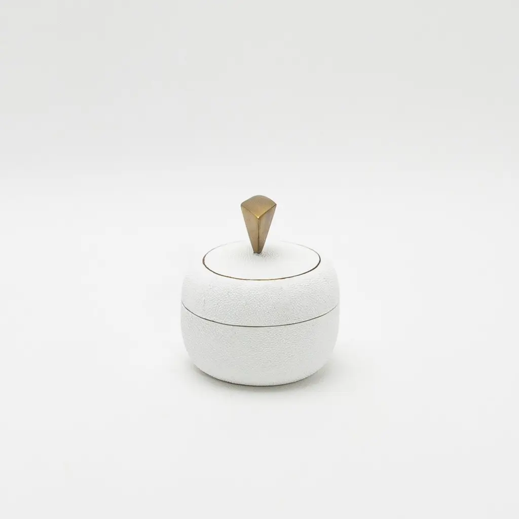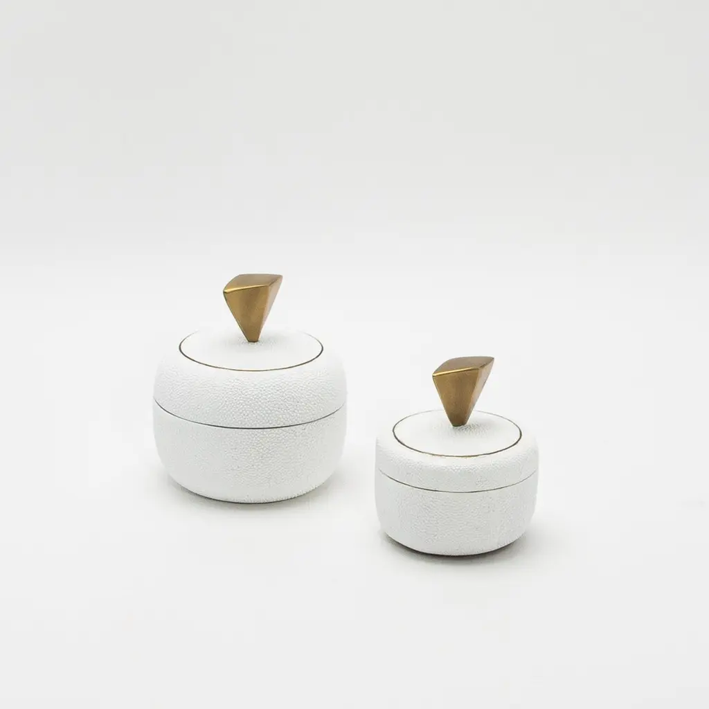 This exquisite set of round boxes by Kifu Paris, crafted from white shagreen, embodies understated luxury with its rich, matte texture that highlights the natural beauty of this exotic material. The subtle pebble-like surface of the shagreen provides an intriguing tactile experience, while the brushed bronze patina brass pedestal knob adds a sculptural, modern touch to the design. Inside, the boxes are lined with warm wood veneer, offering both a practical and beautifully crafted storage space. Handcrafted with precision, these boxes are a perfect blend of organic elegance and contemporary sophistication, making them a luxurious addition to any discerning home.Medium: 5.25” dia x 5.75”Small: 4.25” dia x 4.75These boxes are available in other finishes.This item is on display in our LA showroomKeep away from direct sunlightColor variants may occur on the stingray and other exotic finishesClean with soft dry clothAbout KIFU PARIS:Kifu Augousti is an up-and-coming creator of modern furnishings, celebrated for her ability to blend the timeless elegance of the Art Deco tradition with a bold, contemporary flair. The daughter of renowned designers Ria and Yiouri Augousti, known as R&Y Augousti, Kifu has inherited a rich legacy while carving out her own distinctive style. Offbeat materials, sinuous curves, and wild patterns have become the hallmarks of her designs, cultivated from her early years in Paris to her current creative haven in Manila.Each piece in Kifu’s collection, whether furniture or accessories, is meticulously handcrafted by the finest artisans in the Philippines. These artisans, known for their unparalleled expertise, use only the best natural materials and apply intricate, hand-painted techniques, ensuring every item is a masterpiece. Available in exclusive showrooms in Paris, New York, and Los Angeles at the Pacific Design Center's MOGUL, her creations—ranging from sculptural benches with commanding bronze frames to exquisitely detailed boxes, trays and vases—are not just furnishings, but timeless treasures that represent the pinnacle of luxury and innovative design.