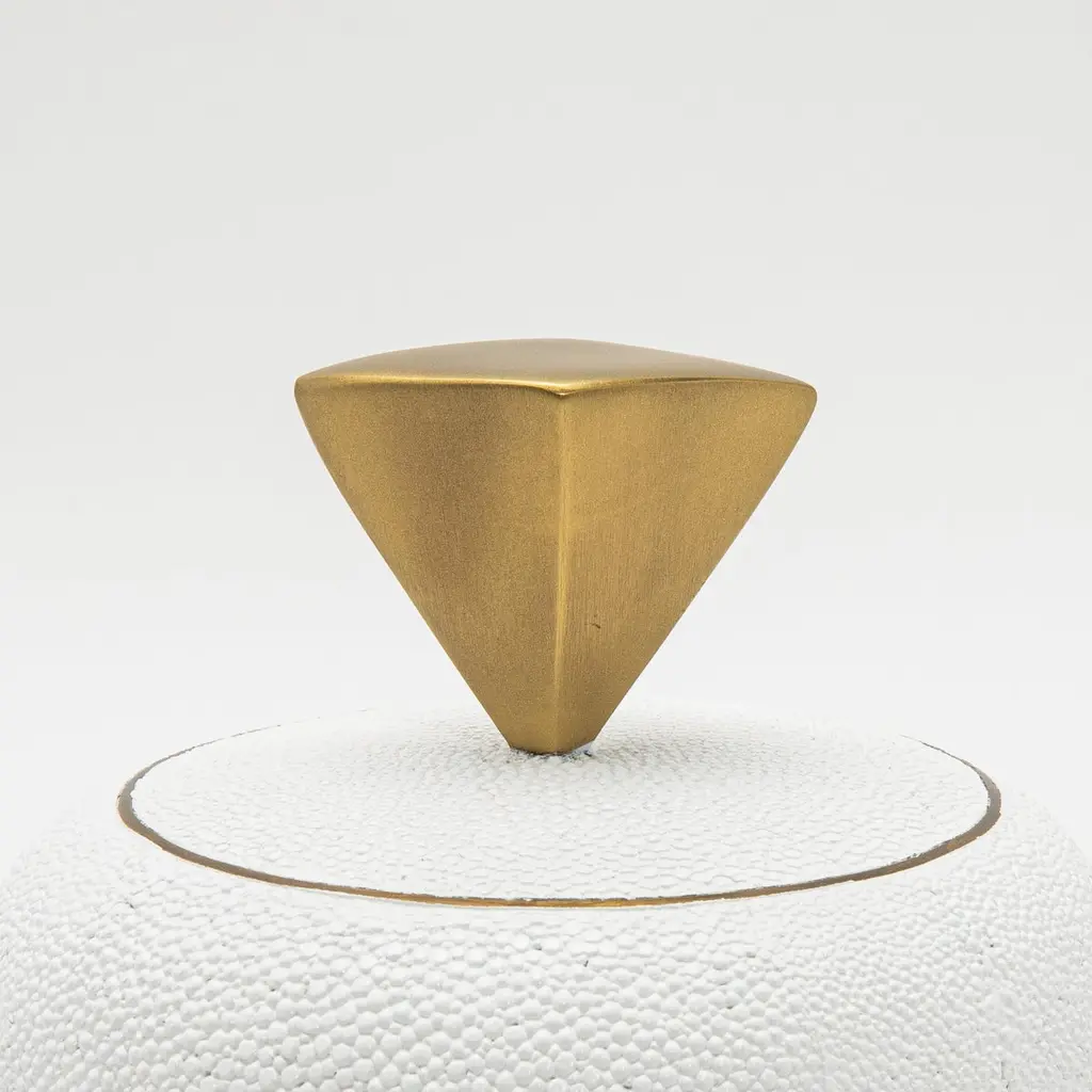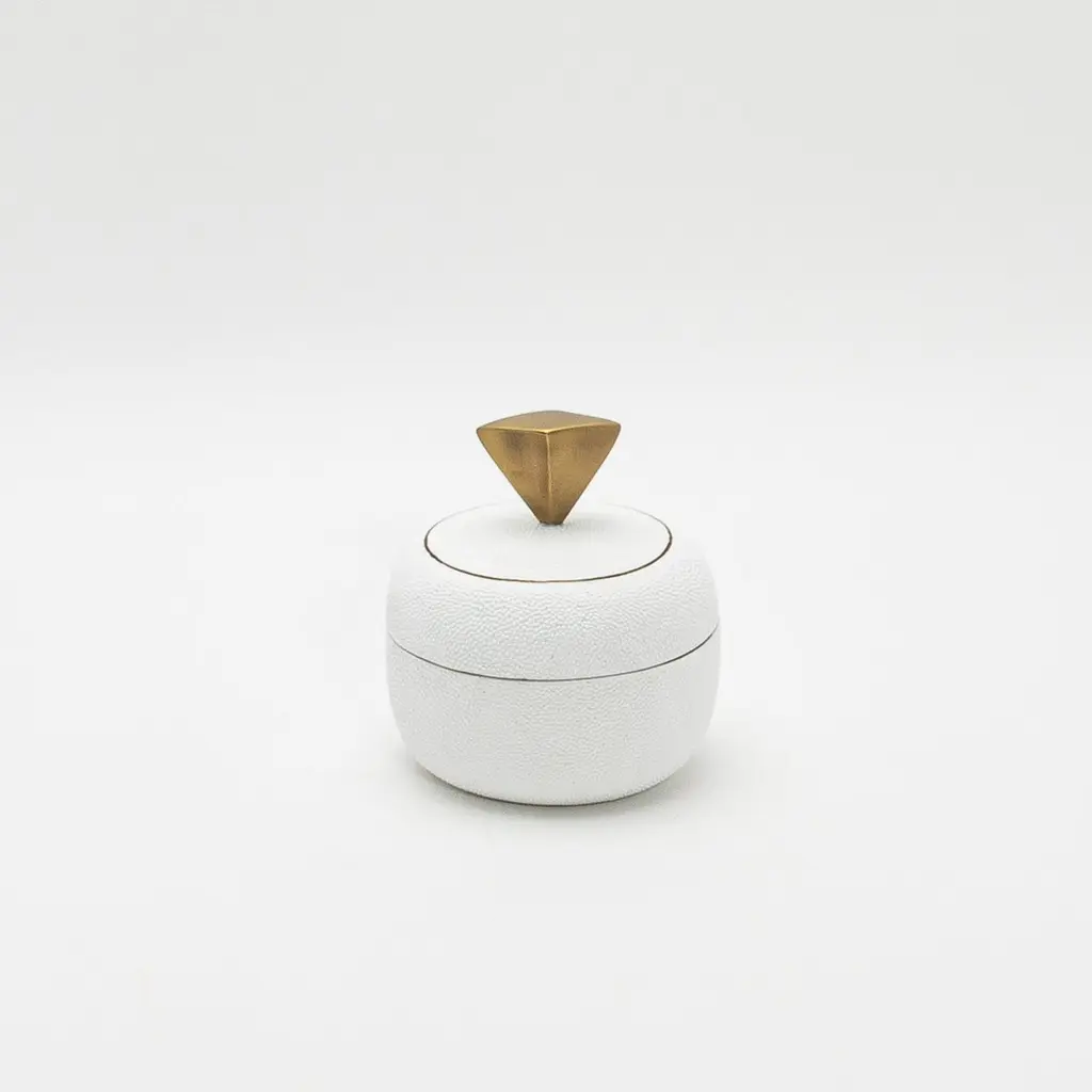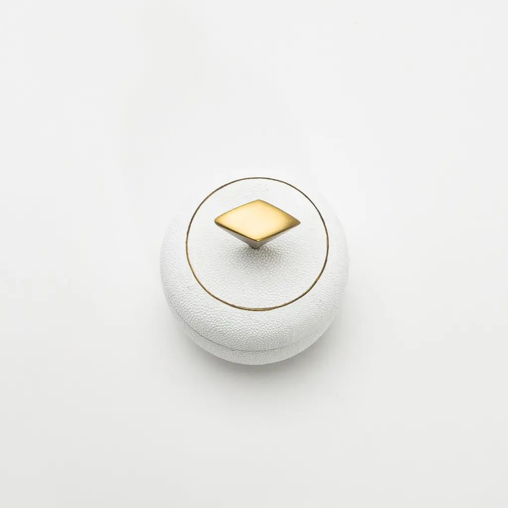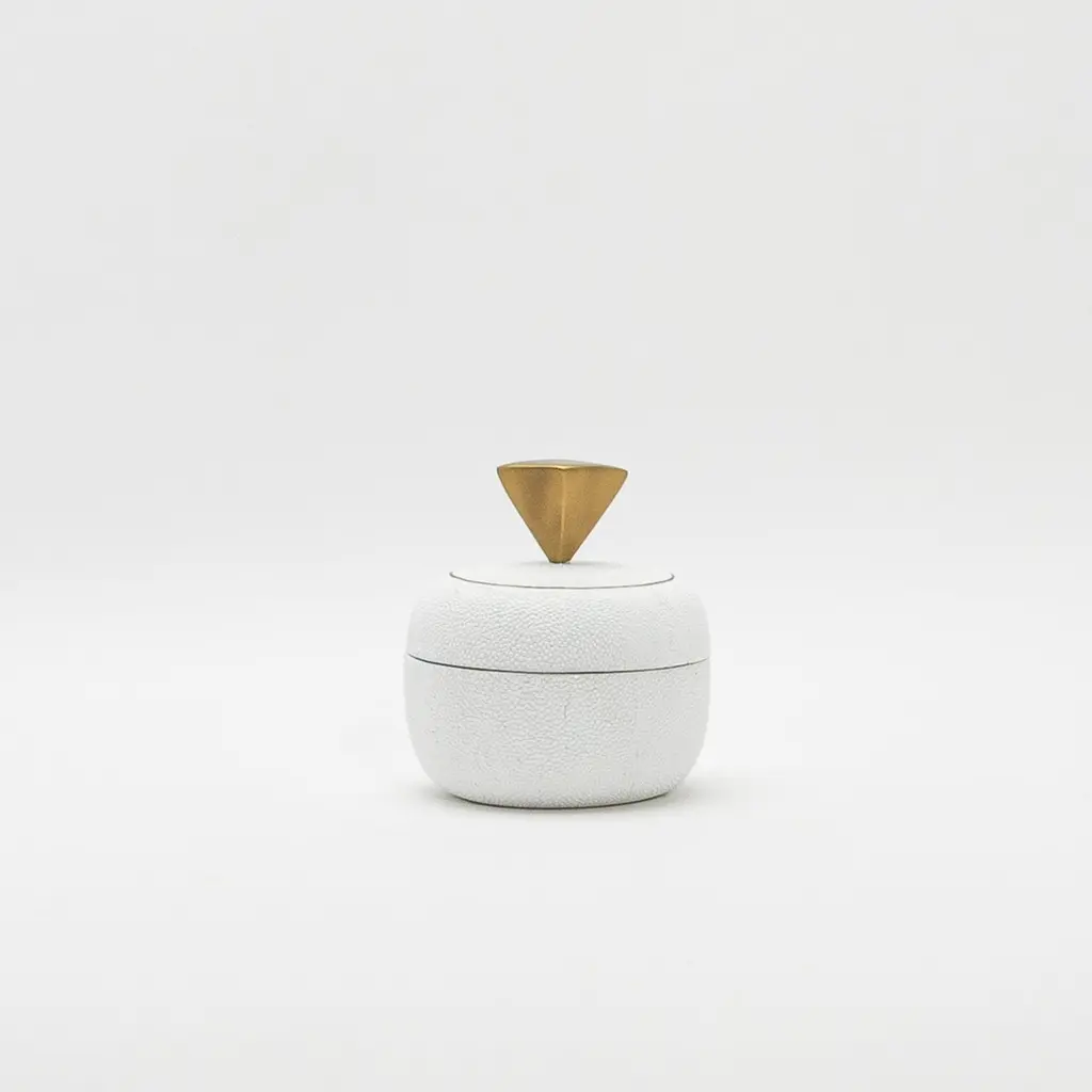 This exquisite set of round boxes by Kifu Paris, crafted from white shagreen, embodies understated luxury with its rich, matte texture that highlights the natural beauty of this exotic material. The subtle pebble-like surface of the shagreen provides an intriguing tactile experience, while the brushed bronze patina brass pedestal knob adds a sculptural, modern touch to the design. Inside, the boxes are lined with warm wood veneer, offering both a practical and beautifully crafted storage space. Handcrafted with precision, these boxes are a perfect blend of organic elegance and contemporary sophistication, making them a luxurious addition to any discerning home.Medium: 5.25” dia x 5.75”Small: 4.25” dia x 4.75These boxes are available in other finishes.This item is on display in our LA showroomKeep away from direct sunlightColor variants may occur on the stingray and other exotic finishesClean with soft dry clothAbout KIFU PARIS:Kifu Augousti is an up-and-coming creator of modern furnishings, celebrated for her ability to blend the timeless elegance of the Art Deco tradition with a bold, contemporary flair. The daughter of renowned designers Ria and Yiouri Augousti, known as R&Y Augousti, Kifu has inherited a rich legacy while carving out her own distinctive style. Offbeat materials, sinuous curves, and wild patterns have become the hallmarks of her designs, cultivated from her early years in Paris to her current creative haven in Manila.Each piece in Kifu’s collection, whether furniture or accessories, is meticulously handcrafted by the finest artisans in the Philippines. These artisans, known for their unparalleled expertise, use only the best natural materials and apply intricate, hand-painted techniques, ensuring every item is a masterpiece. Available in exclusive showrooms in Paris, New York, and Los Angeles at the Pacific Design Center's MOGUL, her creations—ranging from sculptural benches with commanding bronze frames to exquisitely detailed boxes, trays and vases—are not just furnishings, but timeless treasures that represent the pinnacle of luxury and innovative design.