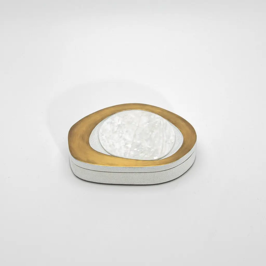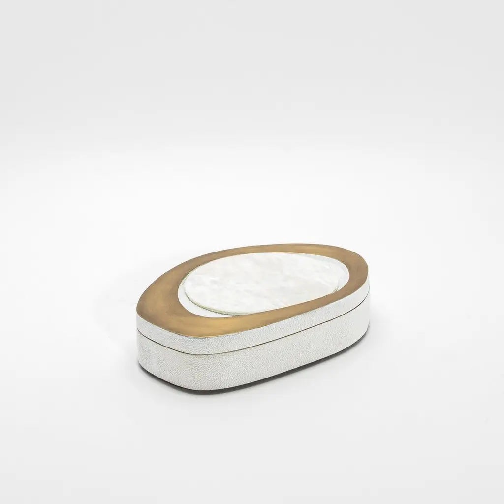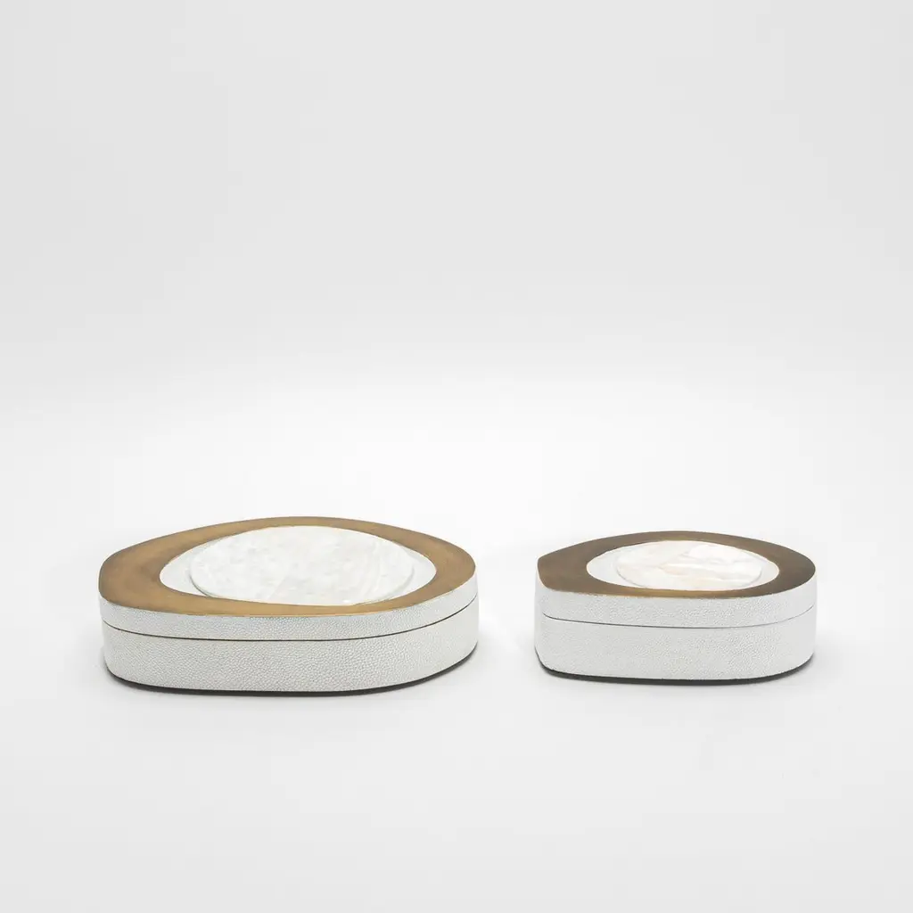 The “Peacock Box” set by R&Y Augousti is a true masterpiece of modern luxury, where organic form meets exceptional craftsmanship. The distinctive, fluid shapes of these boxes create an elegant asymmetry that adds visual intrigue to any space. Wrapped in sumptuous white shagreen, the rich texture offers a tactile experience that enhances the design's opulence, while the mother of pearl top and bronze patina brass framing delicately outline the contours, adding a touch of warmth and refinement. Crafted from wood and meticulously hand-finished, these boxes seamlessly blend form and function, elevating their role from mere storage pieces to objects d'art. Perfect for the discerning collector, the Peacock Box set embodies timeless sophistication and artisanal luxury.Medium: 8.75 x 8.75 x 2.25 Large: 10 x 6.5 x 2.25 These boxes are available and in stock in different finishes and can be purchased as a set in individually. Please contact us through the message center.This item is on display in our LA showroomColor variants may occur on the stingray and other exotic finishesClean with soft dry clothAbout R&Y AUGOUSTI:R&Y Augousti, created by the visionary husband-and-wife duo Ria and Yiouri Augousti, epitomizes the pinnacle of luxurious, globally inspired design. Since its inception in Paris in 1989, the brand has become synonymous with opulence, distinguishing itself through the masterful integration of shagreen with brass and other exotic materials. Each piece in their Art Deco-inspired collection is a testament to unparalleled craftsmanship, meticulously handcrafted by the finest artisans in the Philippines, ensuring that every creation is a unique masterpiece.Ria, hailing from Manila, and Yiouri, from Cyprus, share an exquisite passion for revivalist design, which has propelled R&Y Augousti to the forefront of luxury interiors. Their innovative use of materials, particularly the revival of shagreen, has set new standards in elegance and sophistication. The natural color variations on stingray and other exotic finishes further enhance the authenticity and bespoke nature of their designs.Today, R&Y Augousti’s collections grace the most exclusive showrooms in Paris, New York, and Los Angeles at the Pacific Design Center's MOGUL, continuing to redefine the essence of timeless luxury. Their work is not merely furniture; it is a celebration of art, craftsmanship, and the ultimate in refined living.