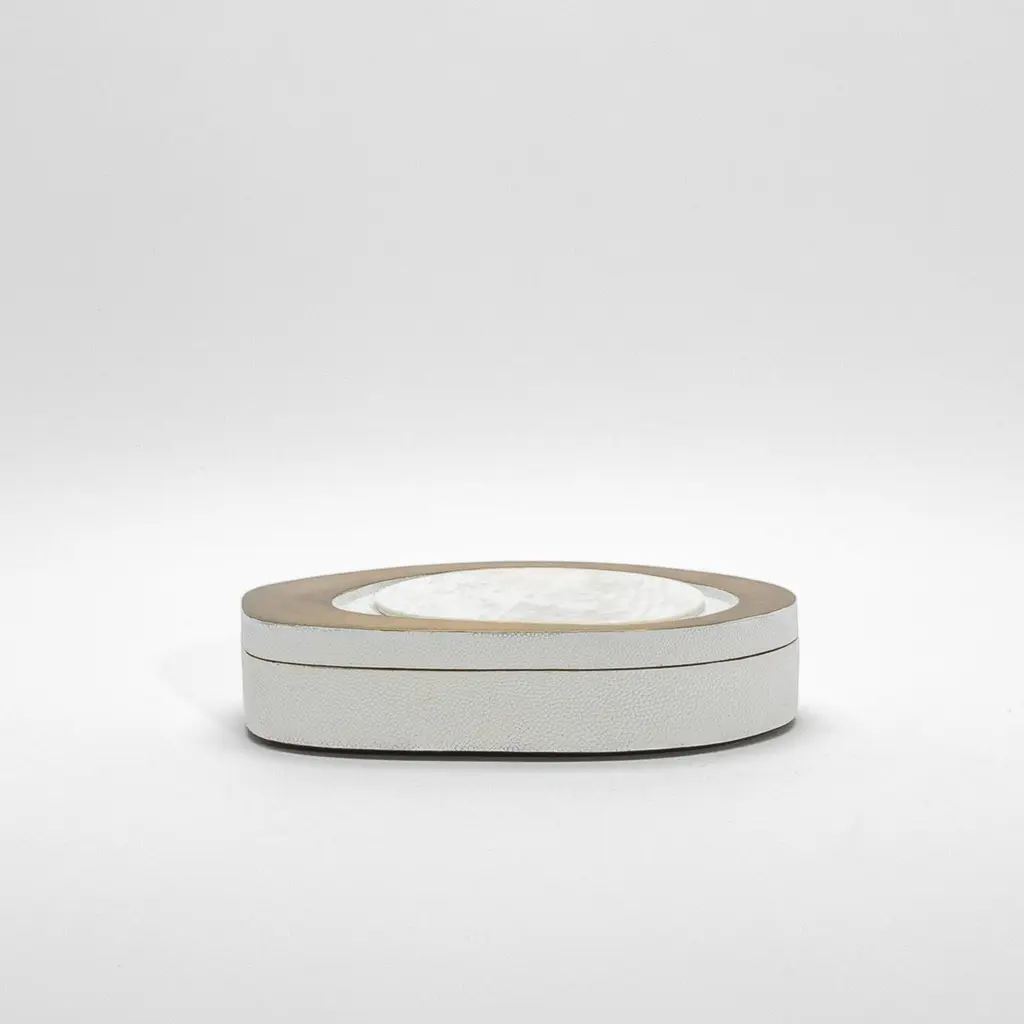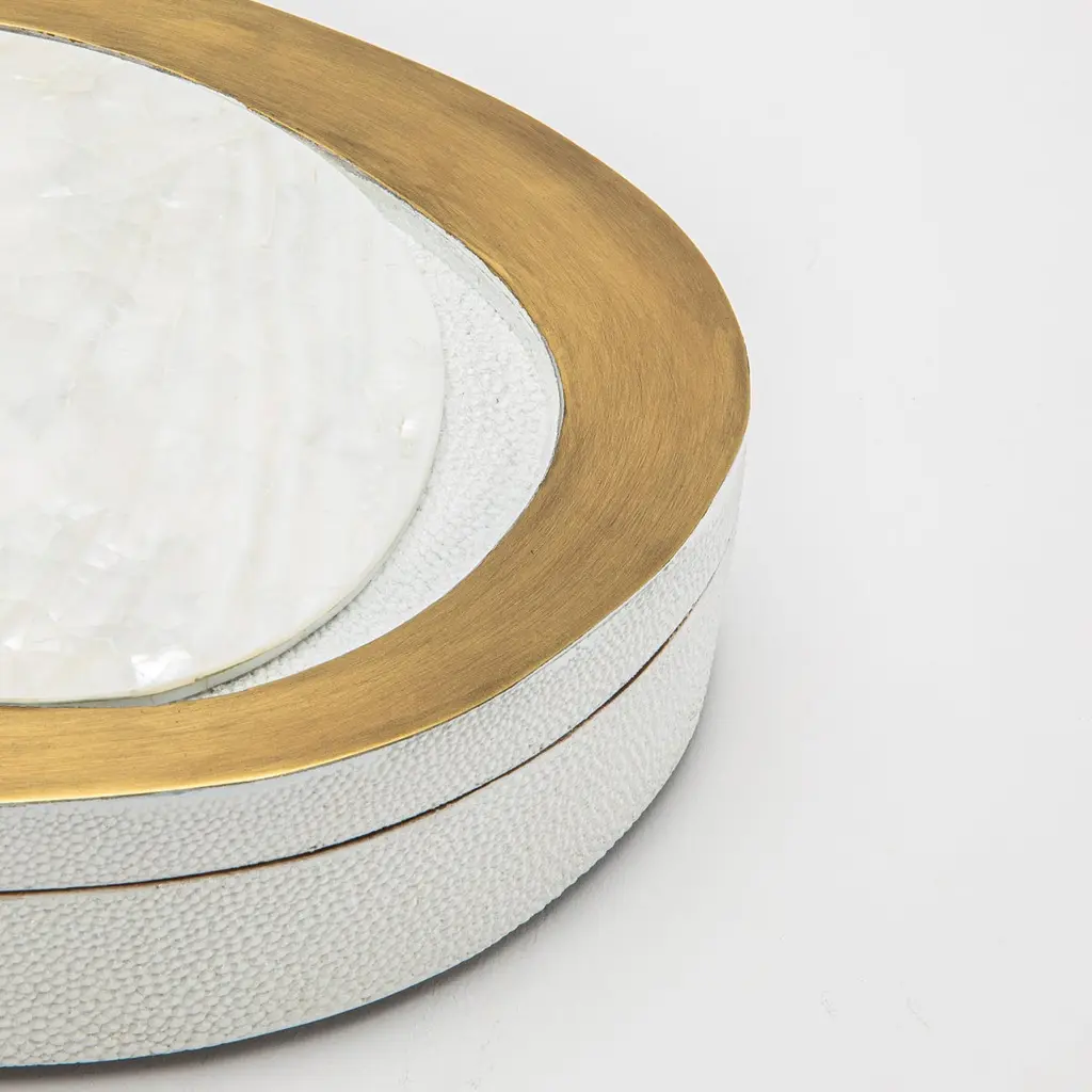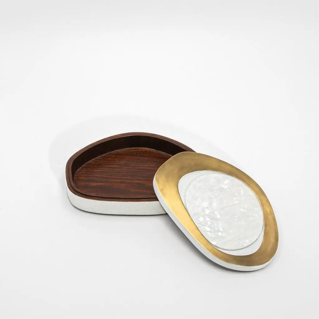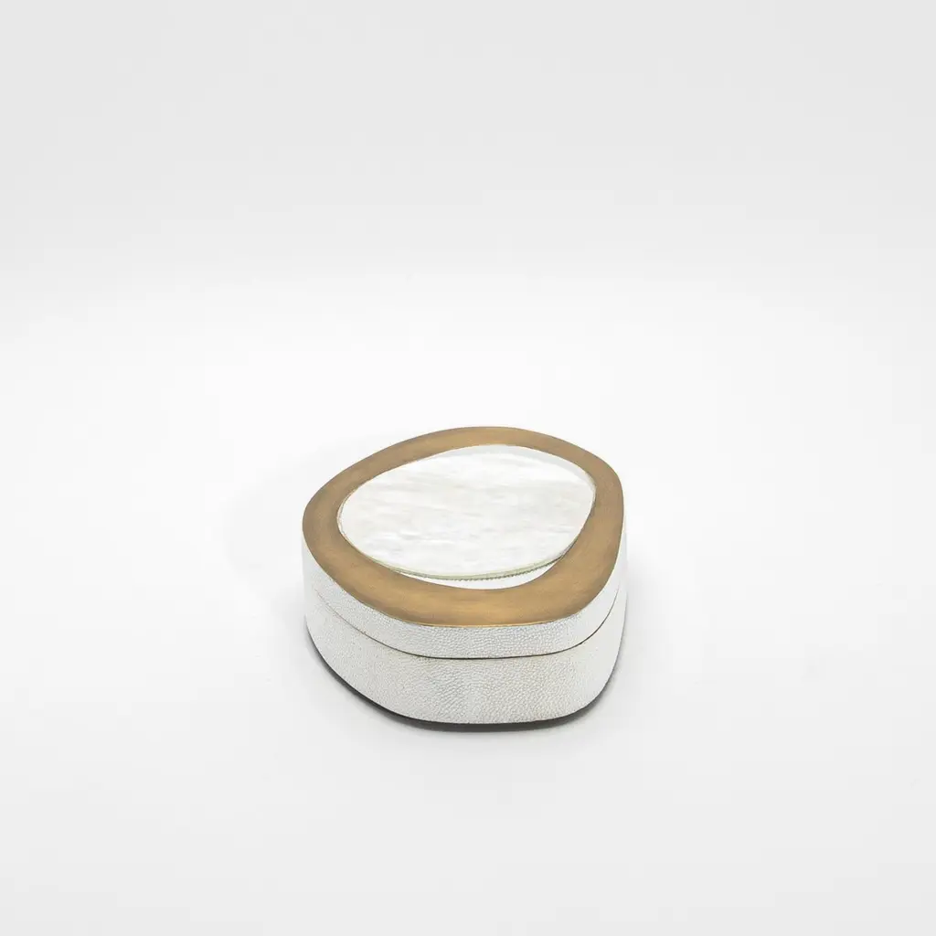 The “Peacock Box” set by R&Y Augousti is a true masterpiece of modern luxury, where organic form meets exceptional craftsmanship. The distinctive, fluid shapes of these boxes create an elegant asymmetry that adds visual intrigue to any space. Wrapped in sumptuous white shagreen, the rich texture offers a tactile experience that enhances the design's opulence, while the mother of pearl top and bronze patina brass framing delicately outline the contours, adding a touch of warmth and refinement. Crafted from wood and meticulously hand-finished, these boxes seamlessly blend form and function, elevating their role from mere storage pieces to objects d'art. Perfect for the discerning collector, the Peacock Box set embodies timeless sophistication and artisanal luxury.Medium: 8.75 x 8.75 x 2.25 Large: 10 x 6.5 x 2.25 These boxes are available and in stock in different finishes and can be purchased as a set in individually. Please contact us through the message center.This item is on display in our LA showroomColor variants may occur on the stingray and other exotic finishesClean with soft dry clothAbout R&Y AUGOUSTI:R&Y Augousti, created by the visionary husband-and-wife duo Ria and Yiouri Augousti, epitomizes the pinnacle of luxurious, globally inspired design. Since its inception in Paris in 1989, the brand has become synonymous with opulence, distinguishing itself through the masterful integration of shagreen with brass and other exotic materials. Each piece in their Art Deco-inspired collection is a testament to unparalleled craftsmanship, meticulously handcrafted by the finest artisans in the Philippines, ensuring that every creation is a unique masterpiece.Ria, hailing from Manila, and Yiouri, from Cyprus, share an exquisite passion for revivalist design, which has propelled R&Y Augousti to the forefront of luxury interiors. Their innovative use of materials, particularly the revival of shagreen, has set new standards in elegance and sophistication. The natural color variations on stingray and other exotic finishes further enhance the authenticity and bespoke nature of their designs.Today, R&Y Augousti’s collections grace the most exclusive showrooms in Paris, New York, and Los Angeles at the Pacific Design Center's MOGUL, continuing to redefine the essence of timeless luxury. Their work is not merely furniture; it is a celebration of art, craftsmanship, and the ultimate in refined living.