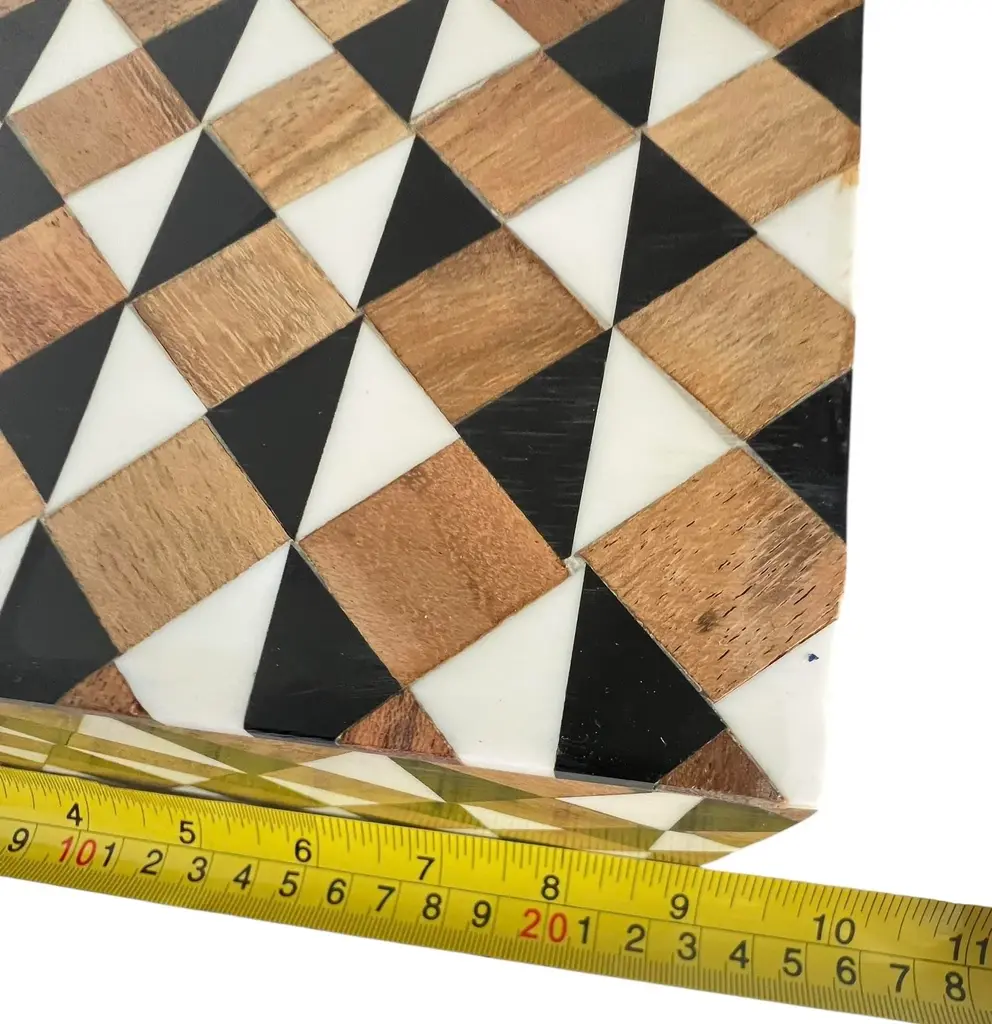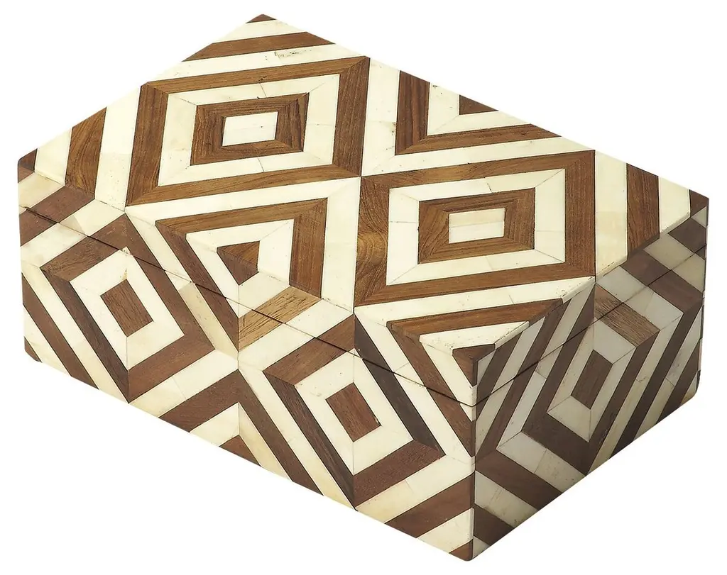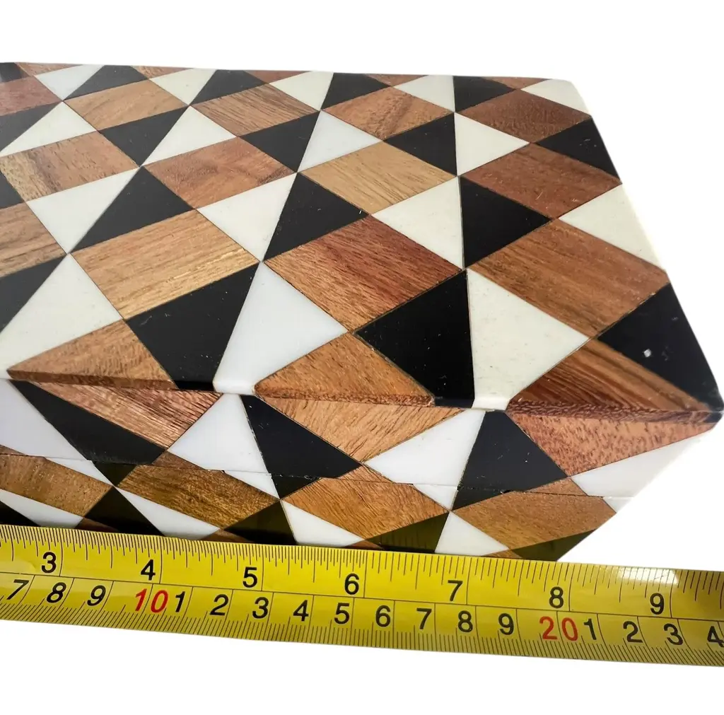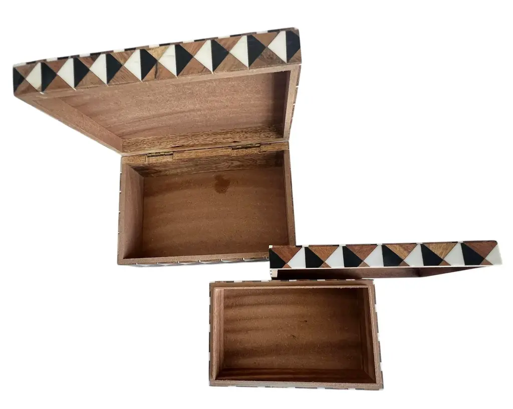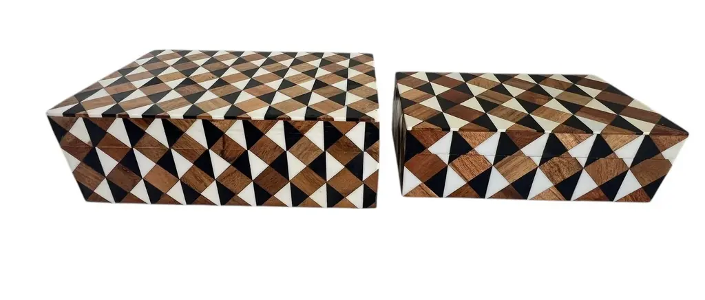 This product is a set of two inlaid geometric tri-color boxes, featuring a black, brown, and white design made of wood and acrylic materials. The larger box measures 9"L x 6"W x 3"H and is hinged. The small box measures 7.75"L x 4.75"W x 2.5"H and is not hinged. With a sleek Italian style and smooth surface, these boxes are perfect for the living room coffee table, a bookcase or bedroom nightstand. They would make a stylish addition to any collection, whether modern or traditional. Made in India, these boxes are sure to add a touch of sophistication to any space. NEW without flaws