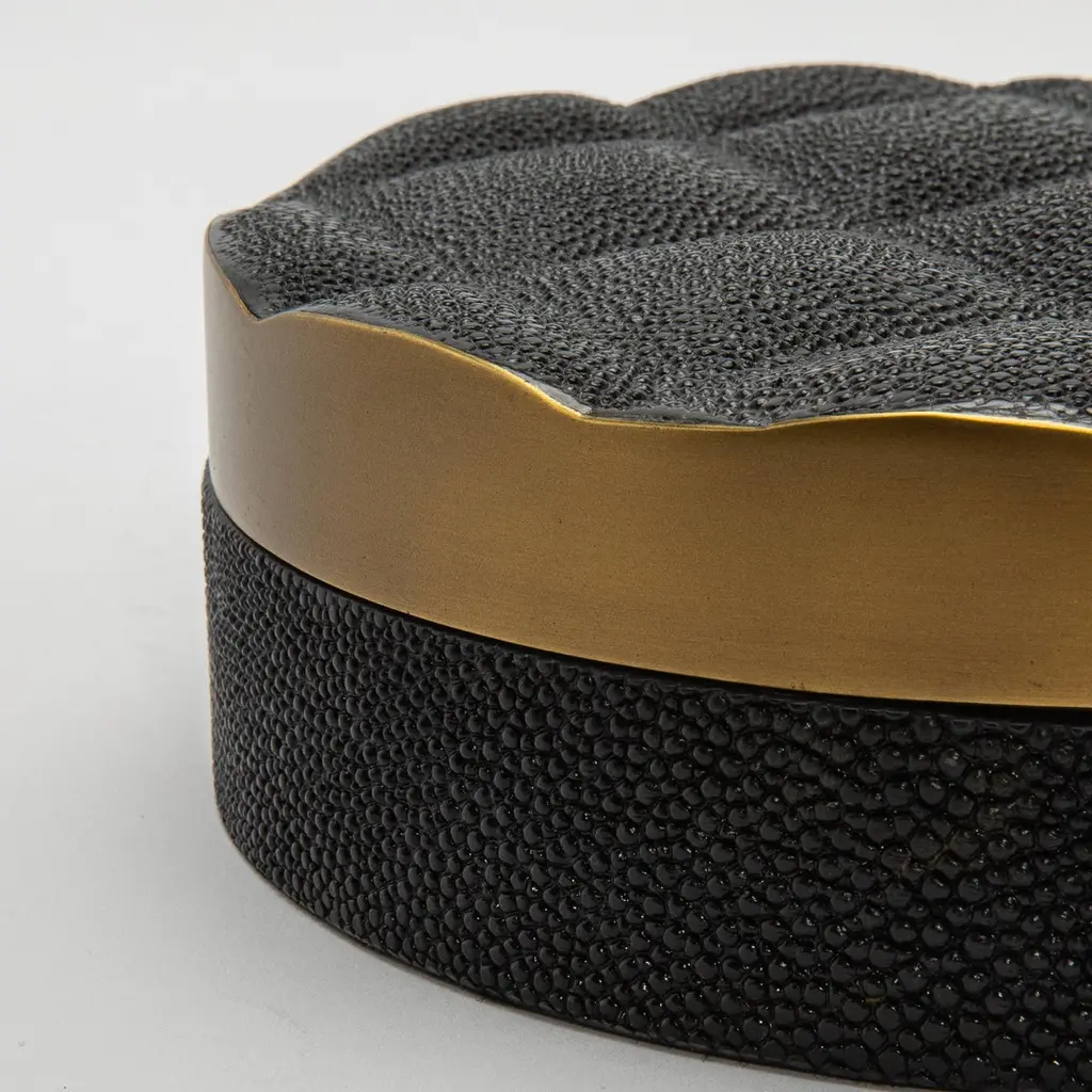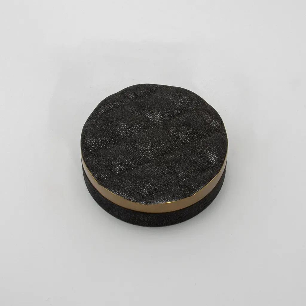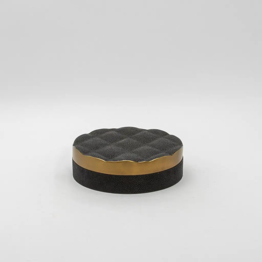 The "Coco" round box in black shagreen with bronze patina brass exudes unparalleled luxury and craftsmanship. Its impeccably quilted shagreen surface is a tactile masterpiece, echoing the elegance of high-fashion couture. The sumptuous texture of the shagreen contrasts beautifully with the rich, warm tones of the hand-applied bronze patina brass that delicately frames the box, creating an exquisite interplay of materials. The organic curves of the box's form are accentuated by the lustrous patina, while the wood interior speaks to timeless sophistication. This artisanal piece transcends functionality, offering an opulent design statement that adds both character and grandeur to any space.MEDIUM: 7.1” DIA x 2.6” LARGE: 8.3” DIA x 2.6” These boxes are available in other finishes.This item is on display in our LA showroomKeep away from direct sunlightColor variants may occur on the stingray and other exotic finishesClean with soft dry clothAbout KIFU PARIS:Kifu Augousti is an up-and-coming creator of modern furnishings, celebrated for her ability to blend the timeless elegance of the Art Deco tradition with a bold, contemporary flair. The daughter of renowned designers Ria and Yiouri Augousti, known as R&Y Augousti, Kifu has inherited a rich legacy while carving out her own distinctive style. Offbeat materials, sinuous curves, and wild patterns have become the hallmarks of her designs, cultivated from her early years in Paris to her current creative haven in Manila.Each piece in Kifu’s collection, whether furniture or accessories, is meticulously handcrafted by the finest artisans in the Philippines. These artisans, known for their unparalleled expertise, use only the best natural materials and apply intricate, hand-painted techniques, ensuring every item is a masterpiece. Available in exclusive showrooms in Paris, New York, and Los Angeles at the Pacific Design Center's MOGUL, her creations—ranging from sculptural benches with commanding bronze frames to exquisitely detailed boxes, trays and vases—are not just furnishings, but timeless treasures that represent the pinnacle of luxury and innovative design.